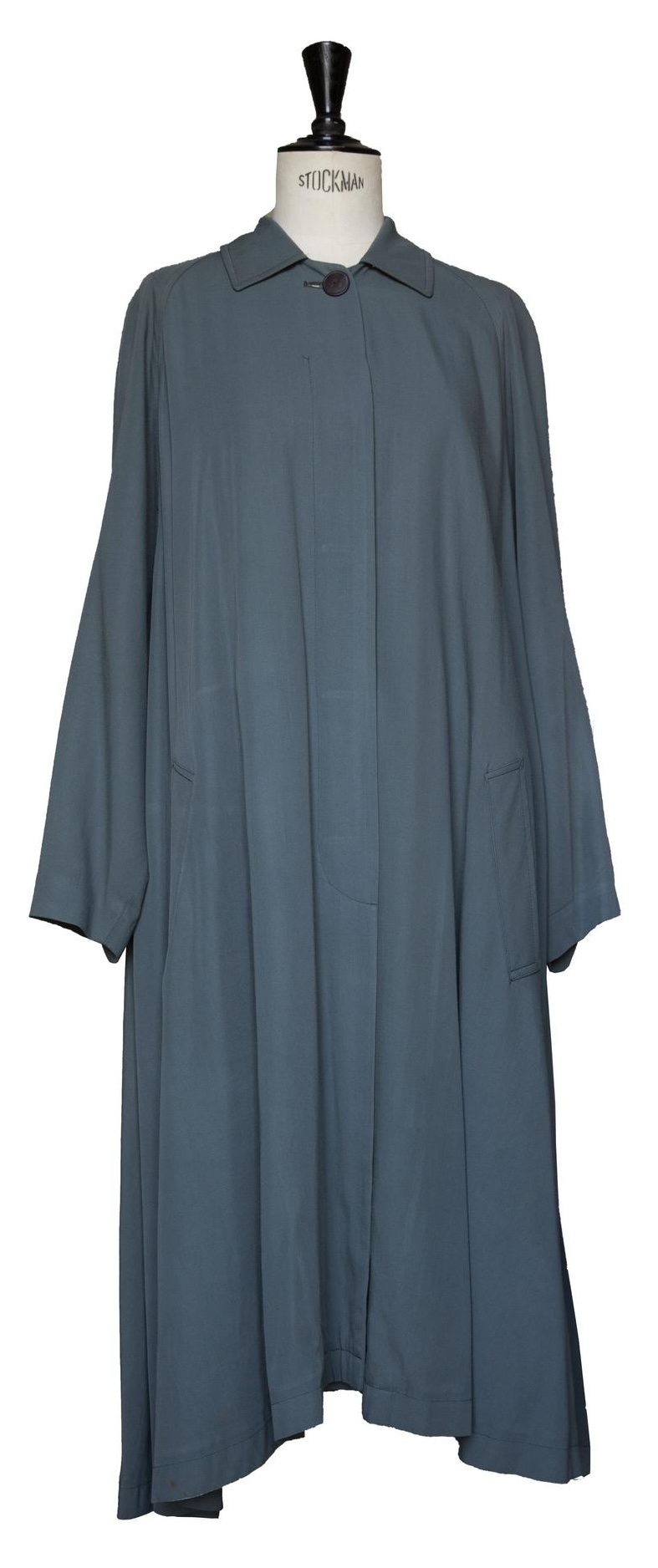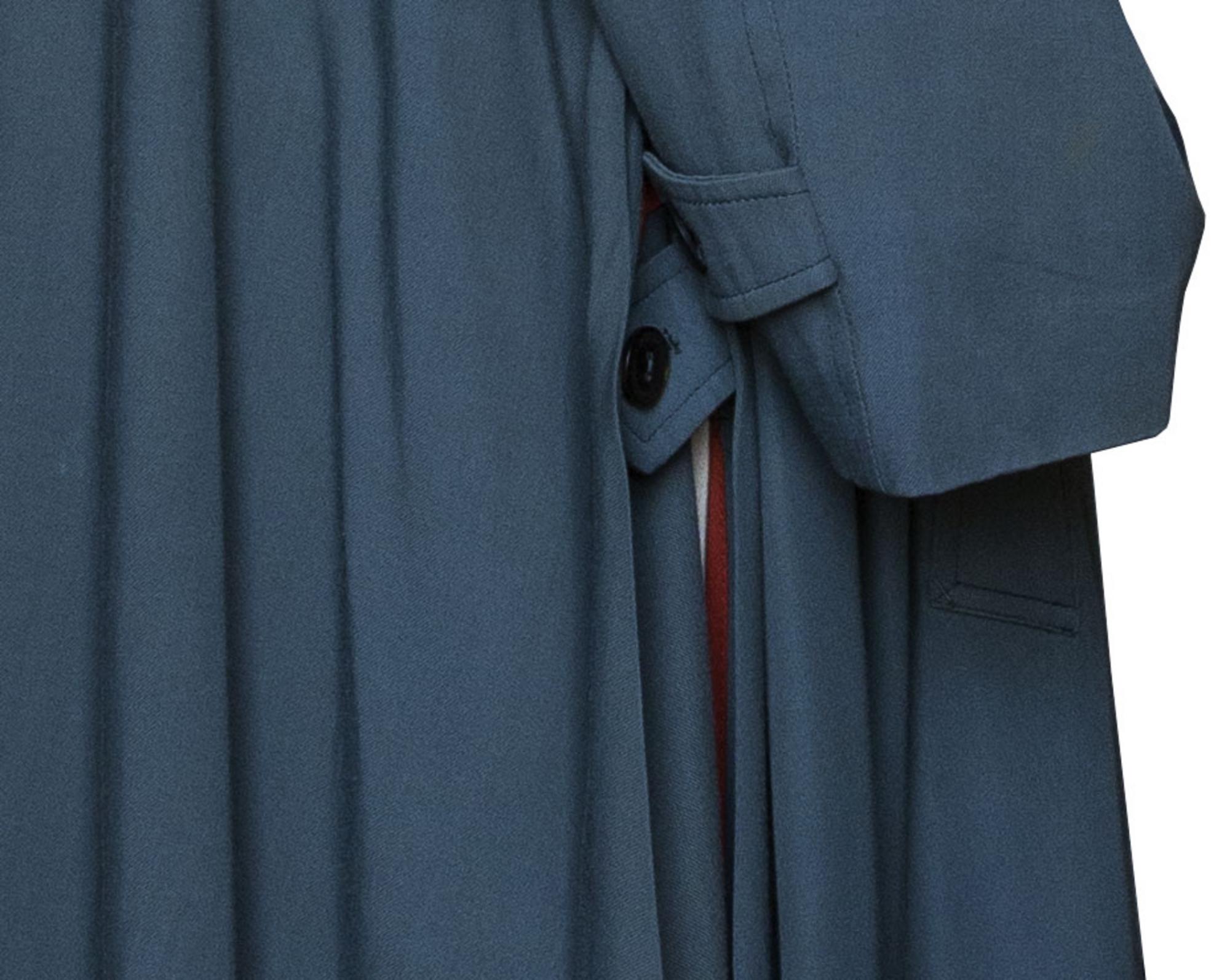 Large overcoat in teal-colored viscose gabardine, lining only for the sleeves and orange-colored internal trimming, deep side slits, pockets. Size 42. Made in Italy in the 80s. Well preserved.
