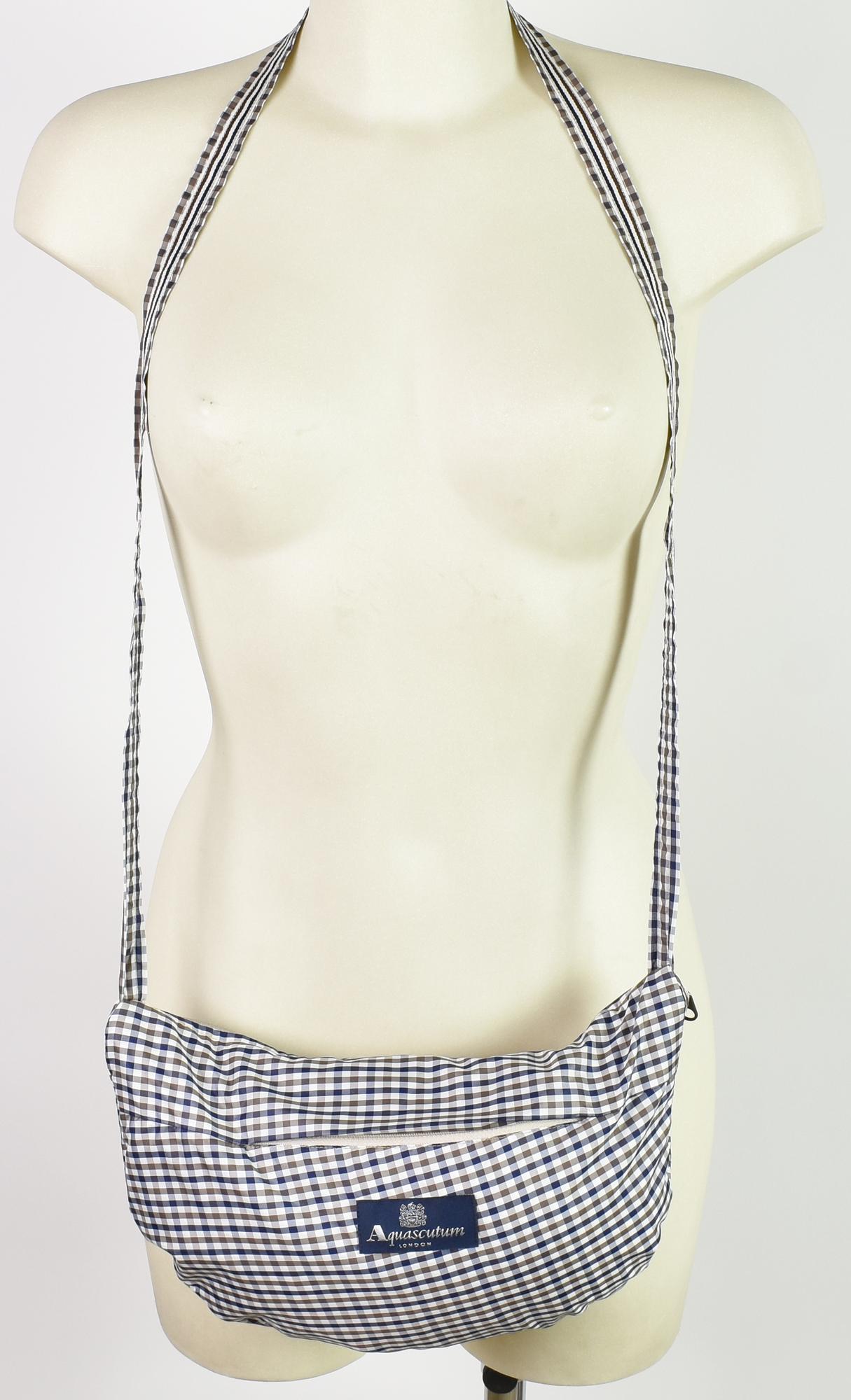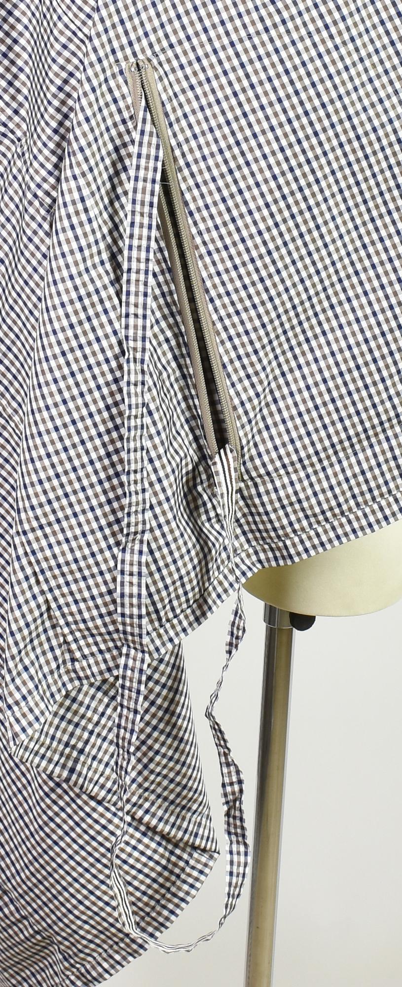 Women's double-breasted gingham patterned raincoat with waist belt. Features two flap pockets plus an internal one where the garment can be folded and carried as a shoulder bag. Features hook and eye closure at the collar and buckles to secure both sleeves. 100% polyester. Size S. Made in China. Excellent condition.