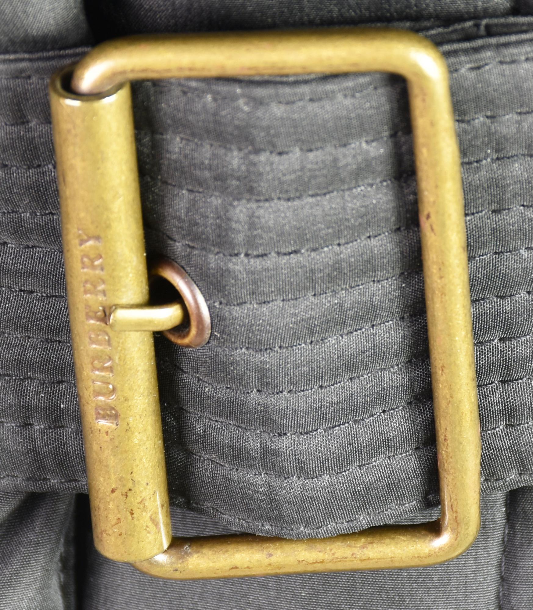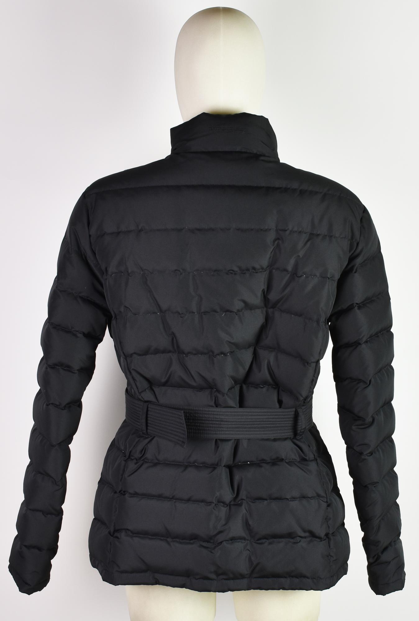 Piumino da donna nero con interno stampato nell'iconico motivo della Maison, chiusura con cerniera. Presenta cintura in vita e due tasche con chiusura con cerniera. Imbottitura in piume d'oca. Cappuccio rimovibile mancante. Manca indicazione di taglia, veste una 46 IT. Ben conservato.