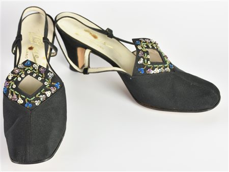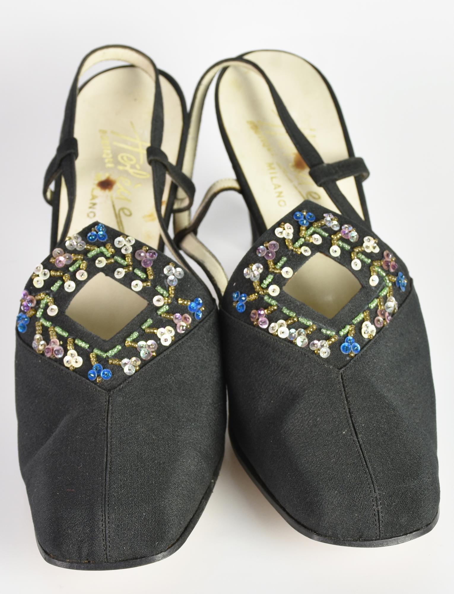 Sandalo chiuso in crepe nero con decorazione di paillettes. Tacco di cm 7. Taglia 40 IT. Anni '70. Ben conservati.
