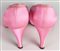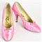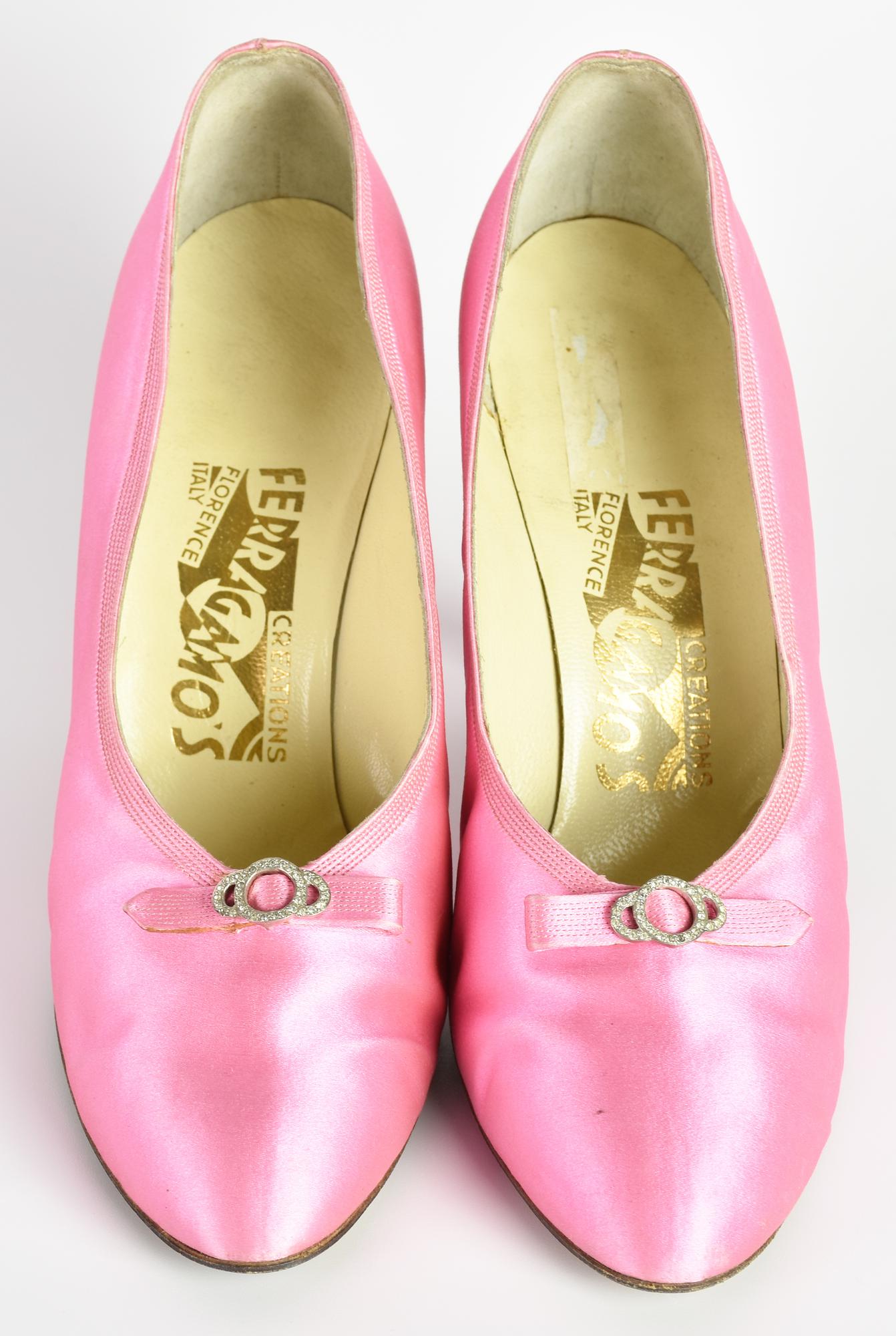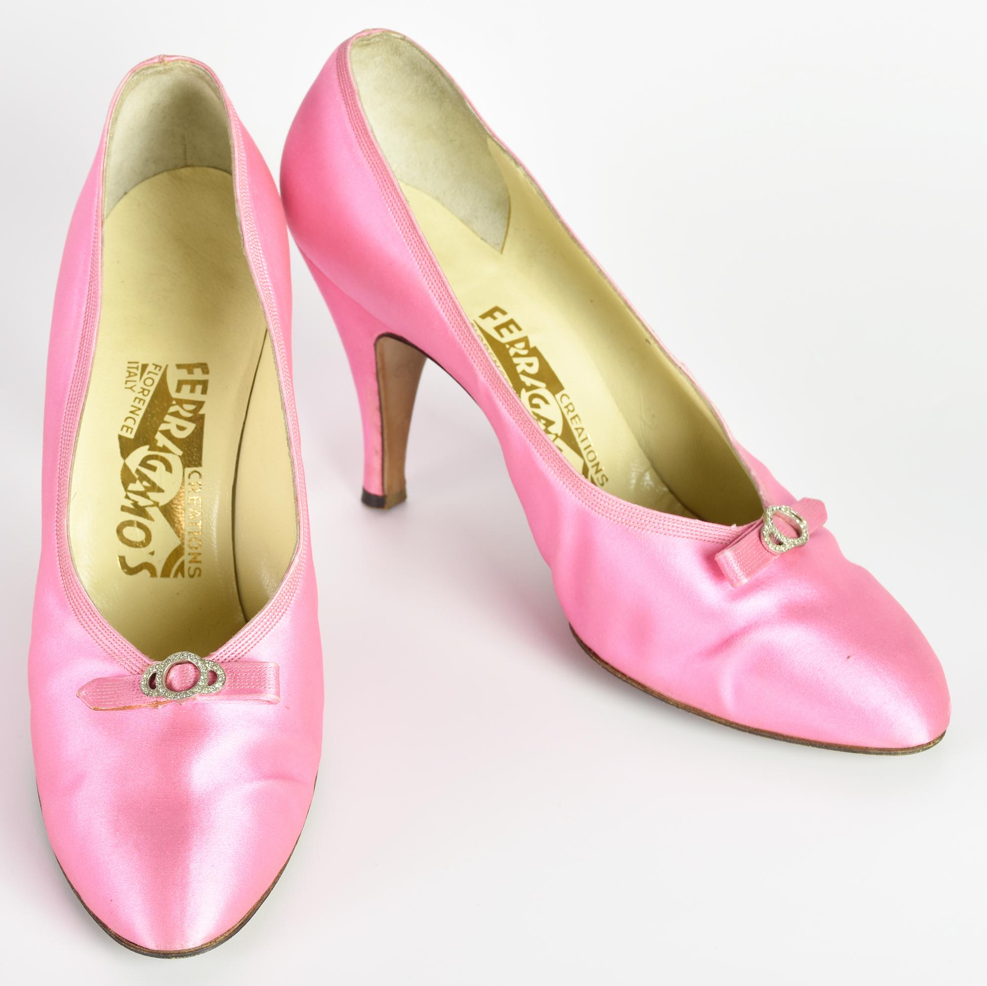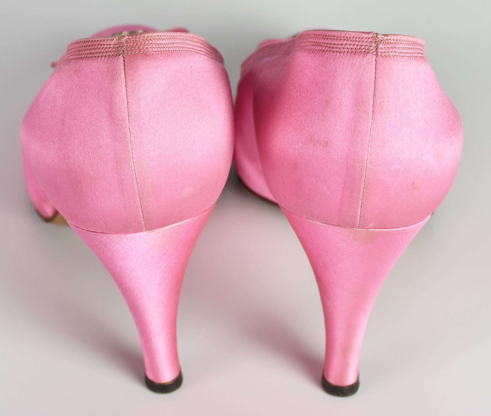 Scarpe decolletee in raso rosa shocking con nodino e brillantini in punta. Tacco cm 8. Taglia 37 IT. Anni '50. Prodotto in Italia. Ben conservate.
