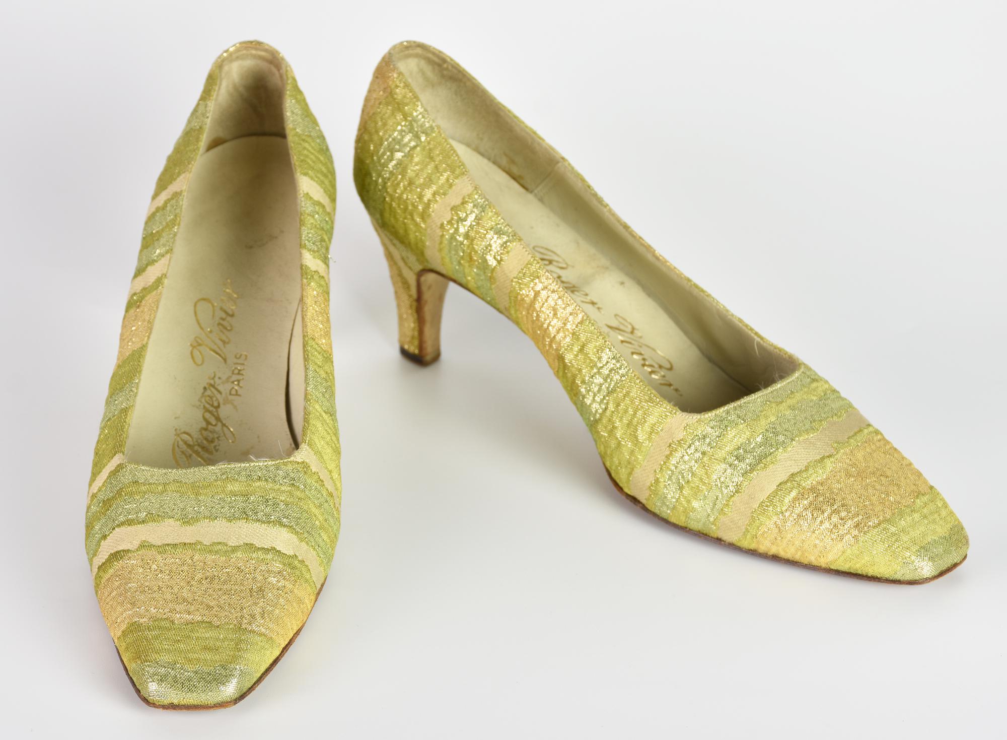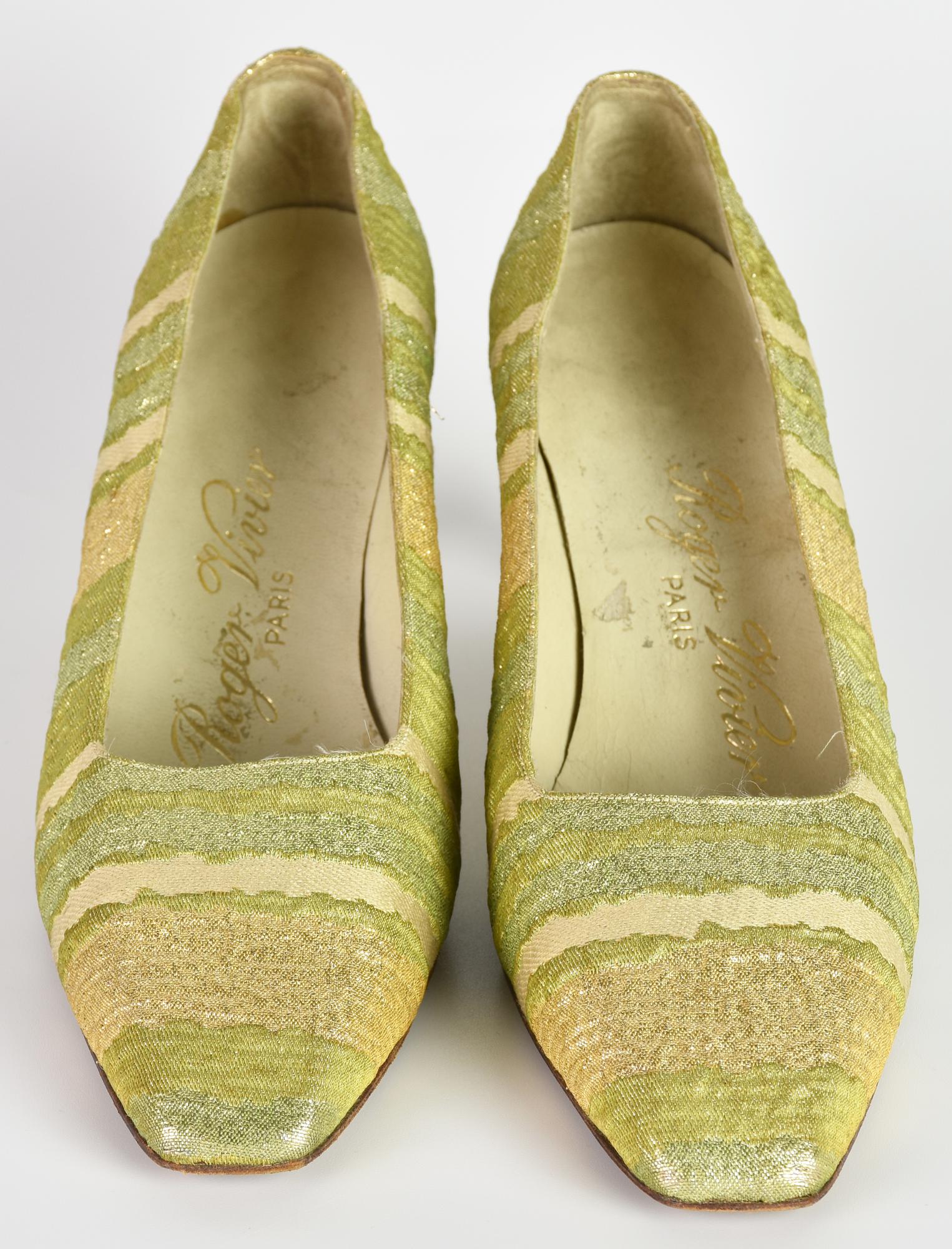 Roger Vivier SHOES DESCRIPTION: Acid green striped lame' fabric shoes. Heels...