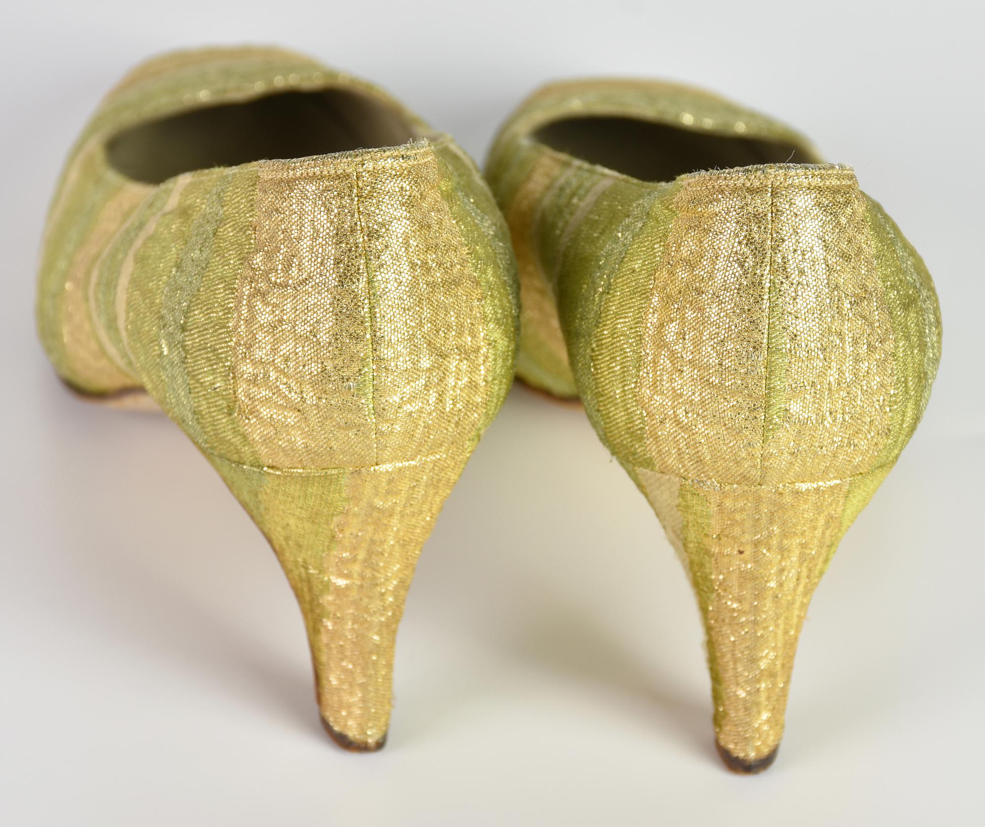 Acid green striped lame' fabric shoes. Heels 5.5 cm. Size 36 IT. Serial number: 5A781908. 1960s - 1970s. Well preserved.