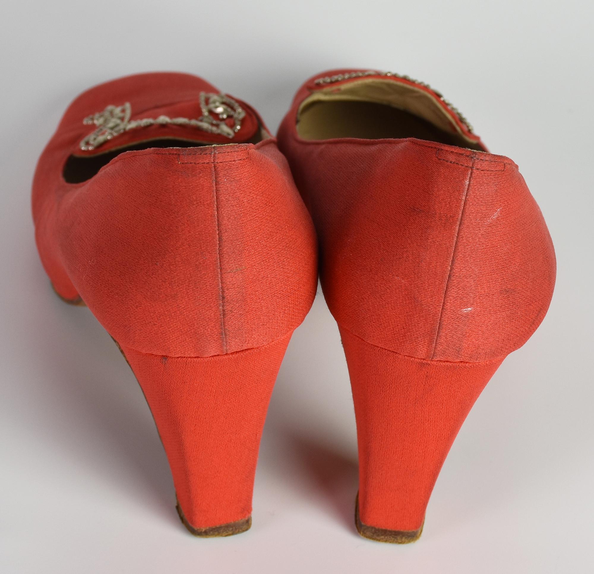 Shoes in red crepe and vamp with silver metal decorations. Heels 6.50 cm. Size 37 IT. 1970s. Fairly well preserved.