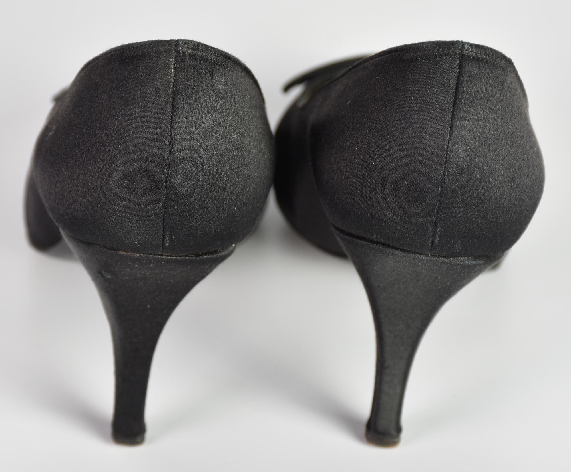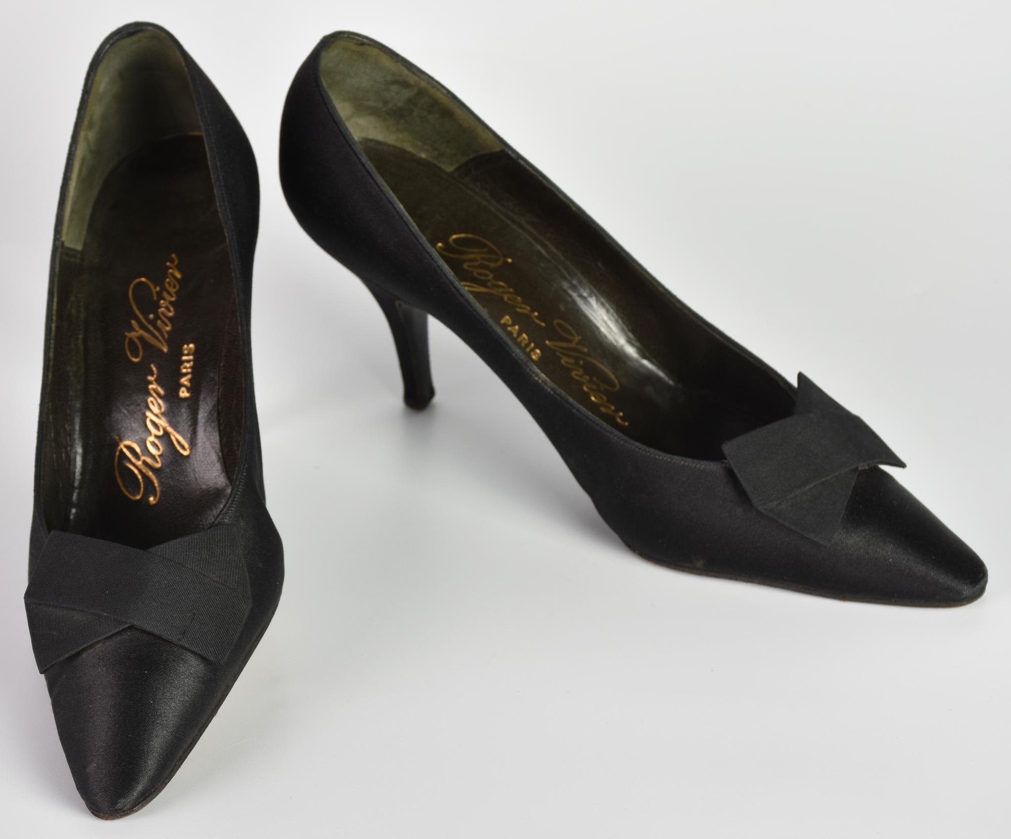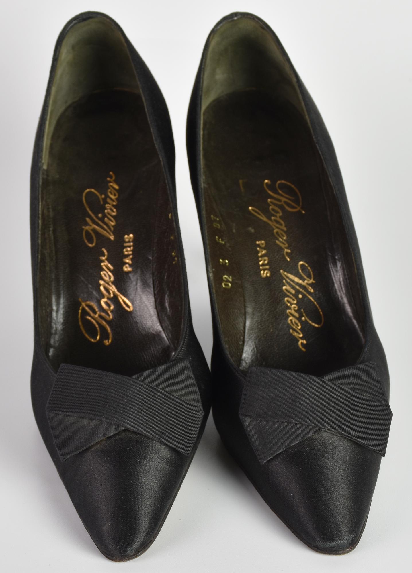 Roger Vivier SHOES DESCRIPTION: Black satin shoes with flat bow. Heels 7.50...