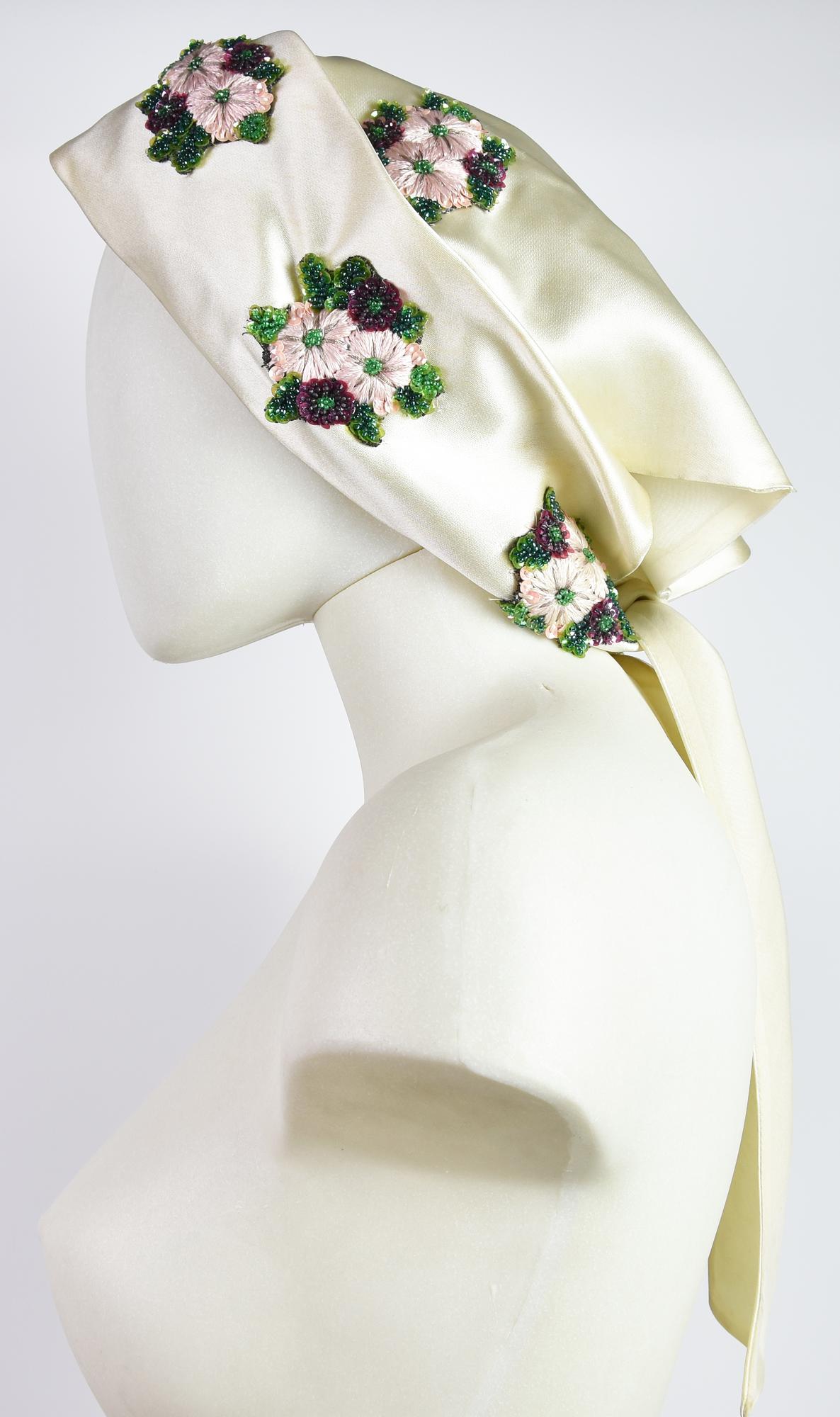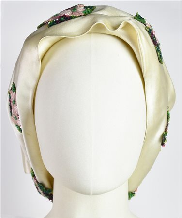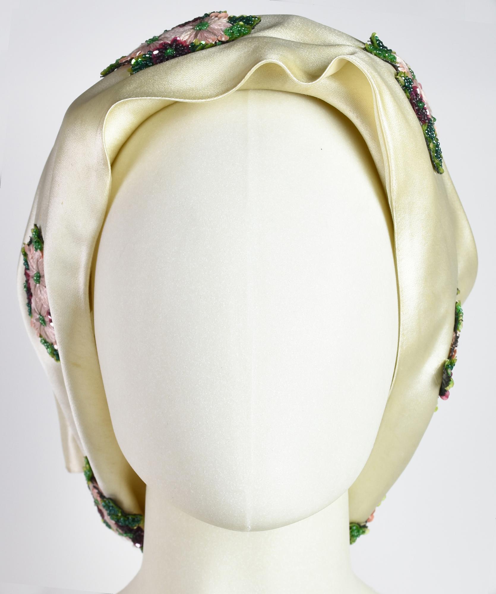 Evening head scarf in ecru satin with precious embroidery applied. 1960s. Well preserved.