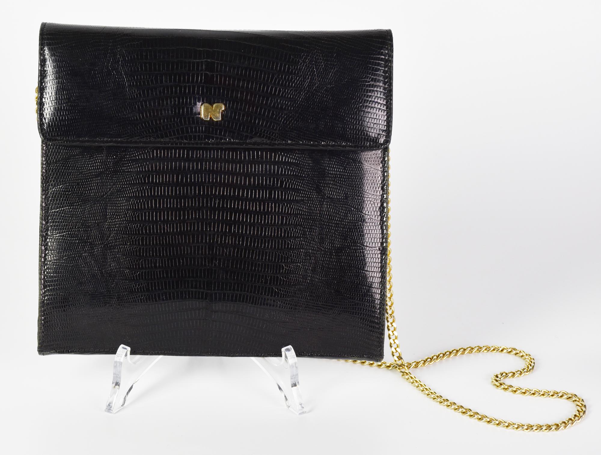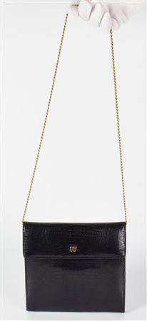Piccola borsa a tracolla in pelle di lucertola. Interni in crosta con un taschino laterale con chiusura a cerniera. Chiusura magnetica e hardware in metallo dorato. Cm 18x17x2. Ben conservata.
