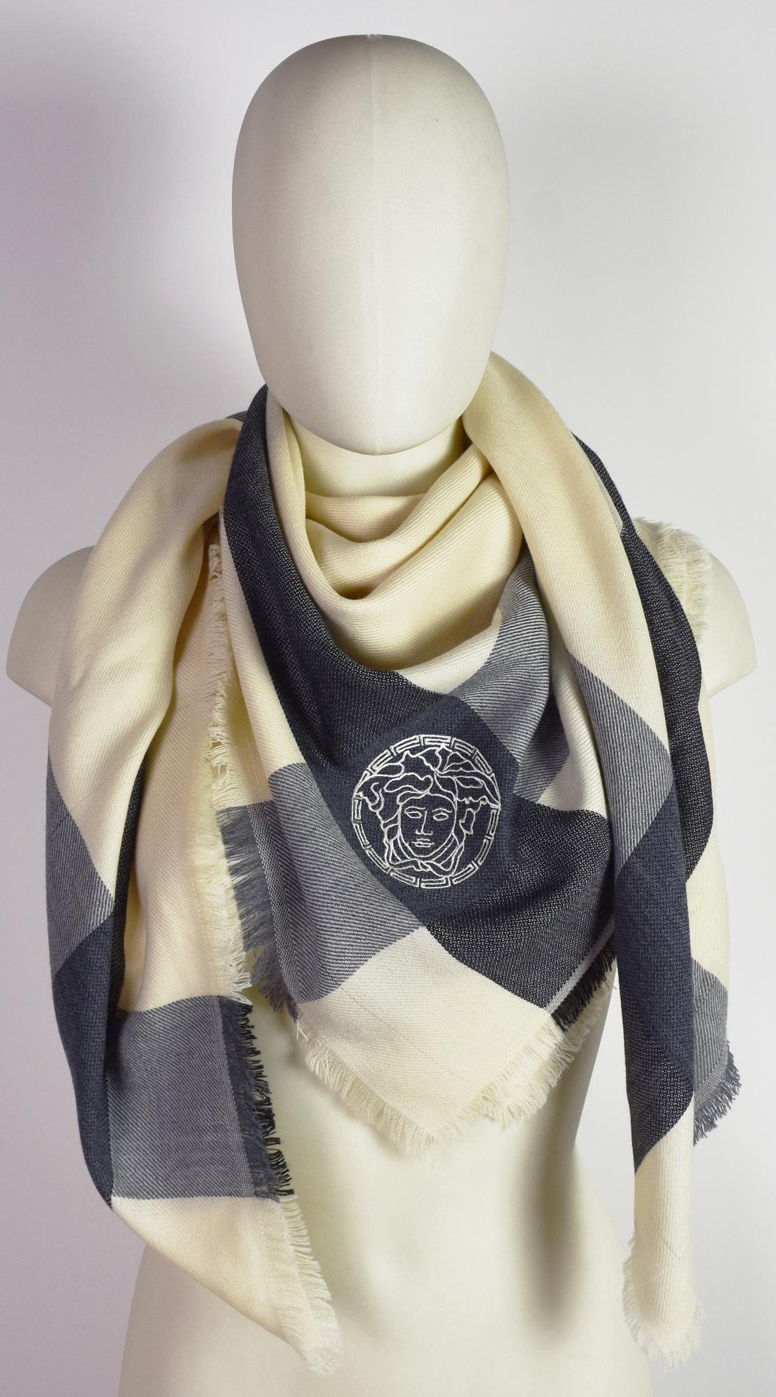 Sciarpa in pura lana vergine con ricamato il logo della Maison. Cm 118x118. Con scatola originale. Prodotto in Italia. Eccellente.
