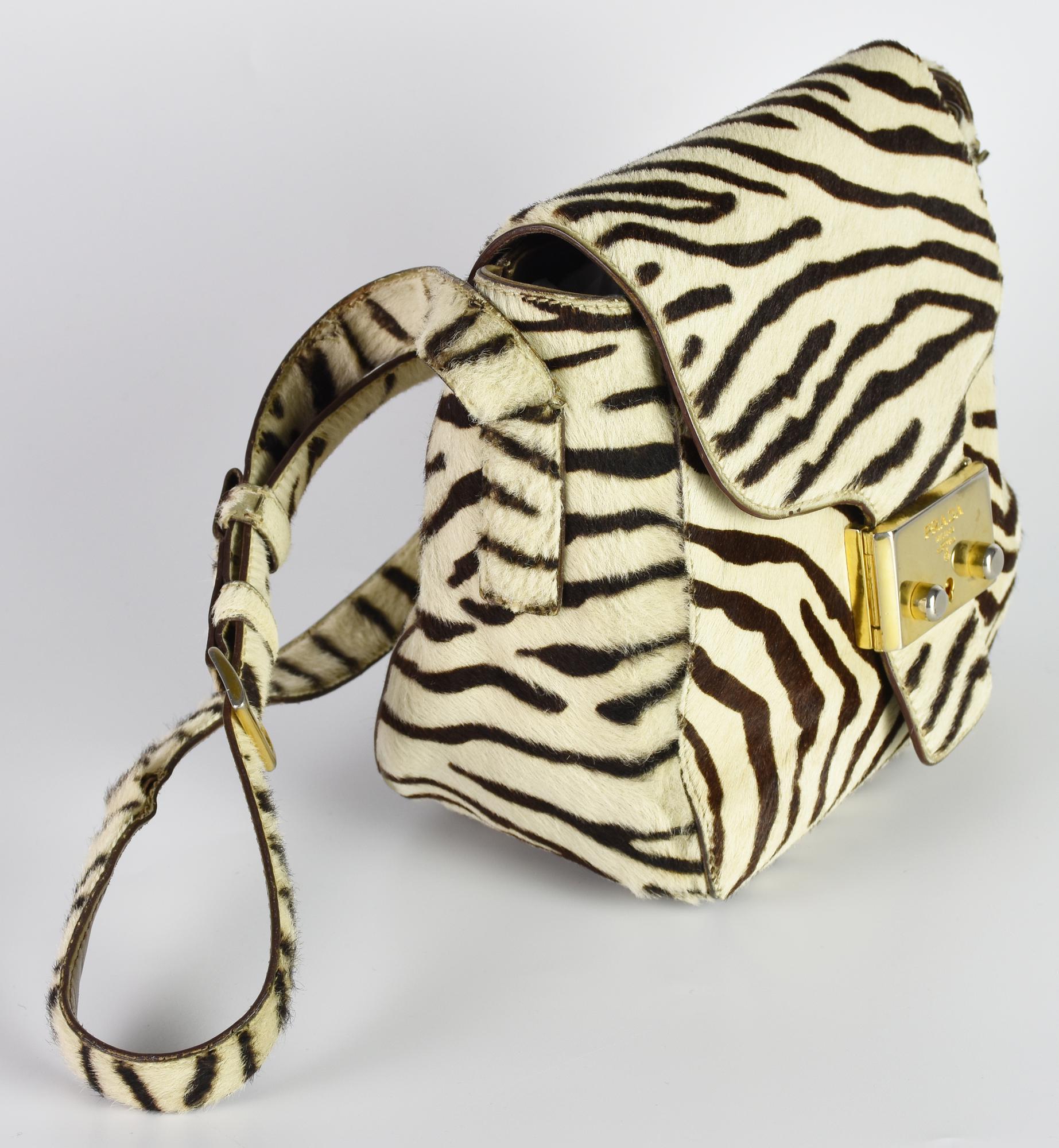 Zebra print shoulder bag. Flap closure with key and adjustable shoulder strap. Fabric interior with logo and leather finishes, organized in a single compartment with side pocket with zip. Golden metal hardware. 19x19x10 cm. Features key and removable clochette. The internal plaque with the logo is in 925 silver. 1990s Made in Italy. Fairly well preserved.