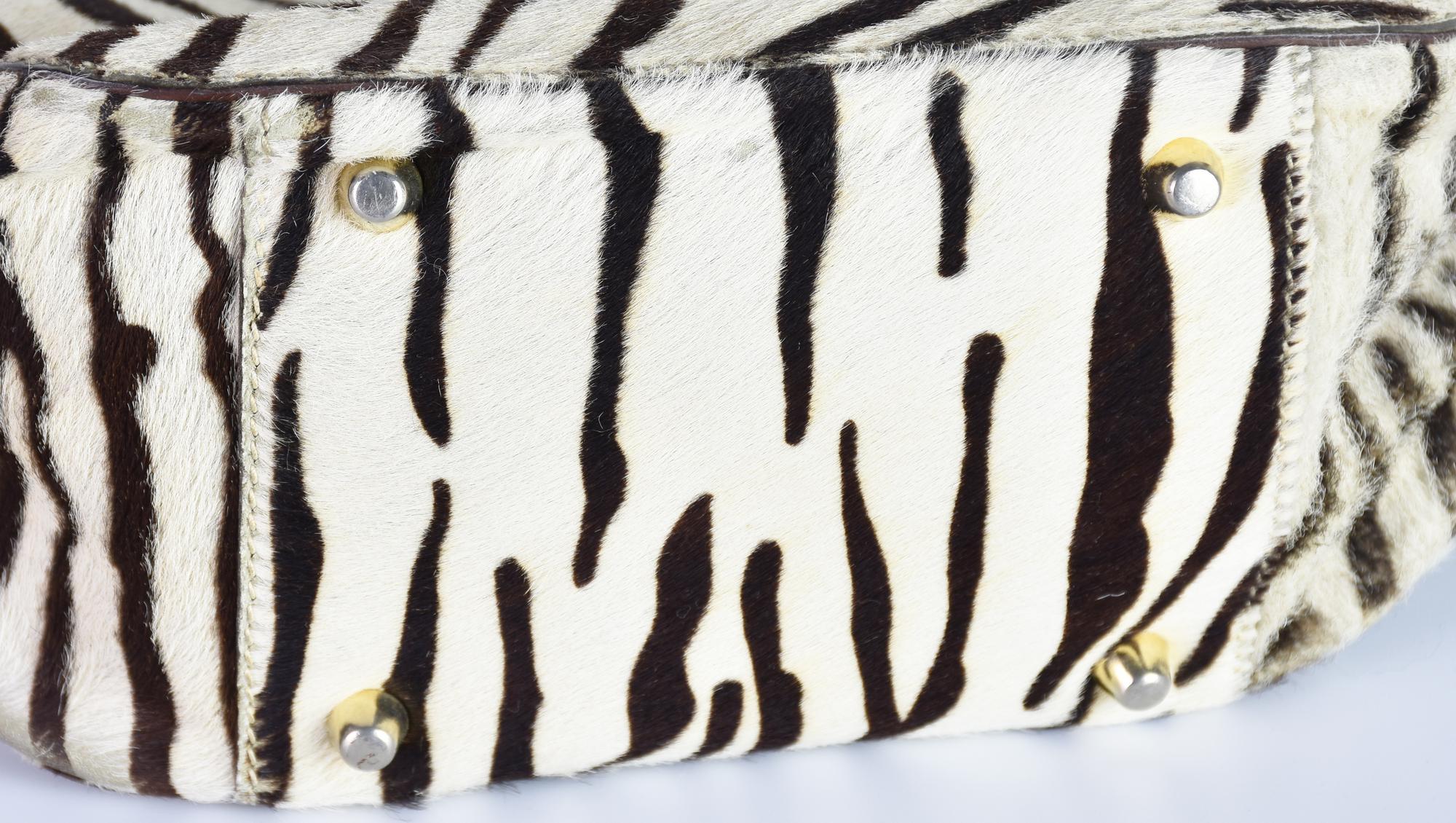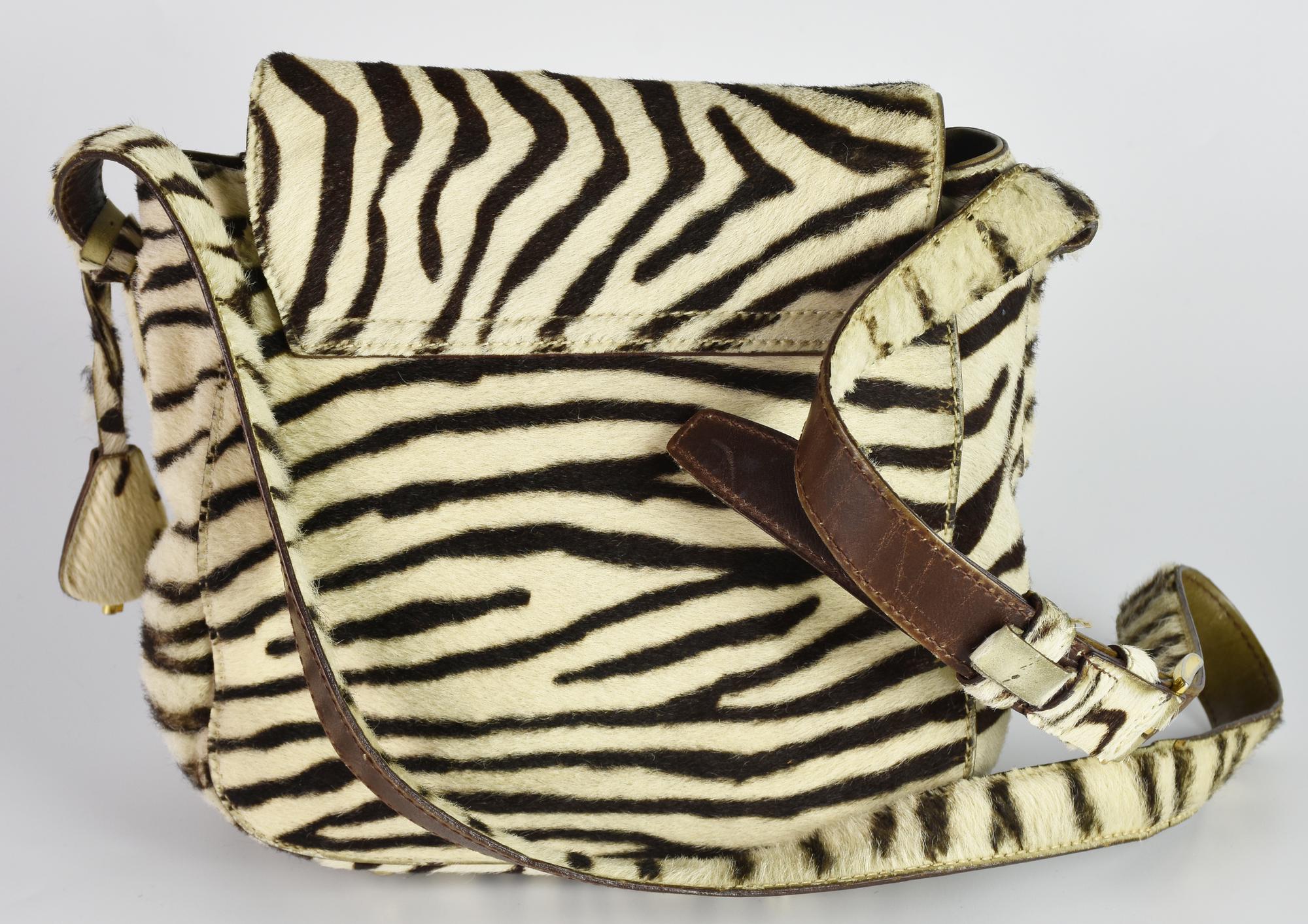 Borsa a spalla in cavallino a stampa zebrata. Chiusura a patta con chiave e tracolla regolabile. Interni in tessuto con logo della Maison e finiture in pelle, organizzato in un unico vano con taschino laterale con cerniera. Hardware in metallo dorato. Cm 19x19x10. Presenta chiave e clochette amovibile. La placchetta interna col logo della Maison e' in argento 925. Anni '90 Prodotto in Italia. Discretamente conservata.