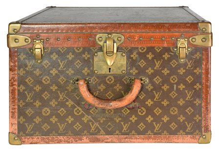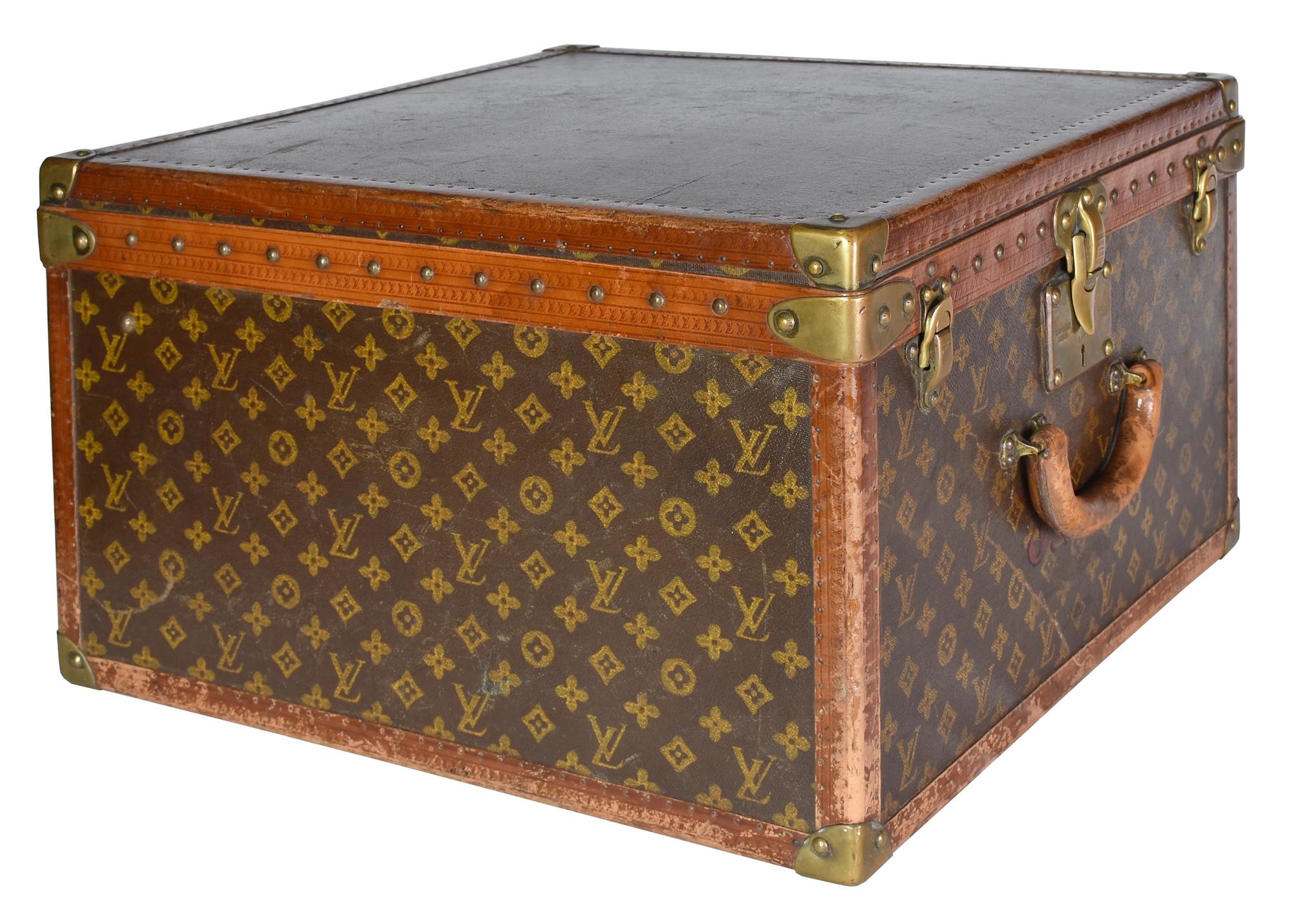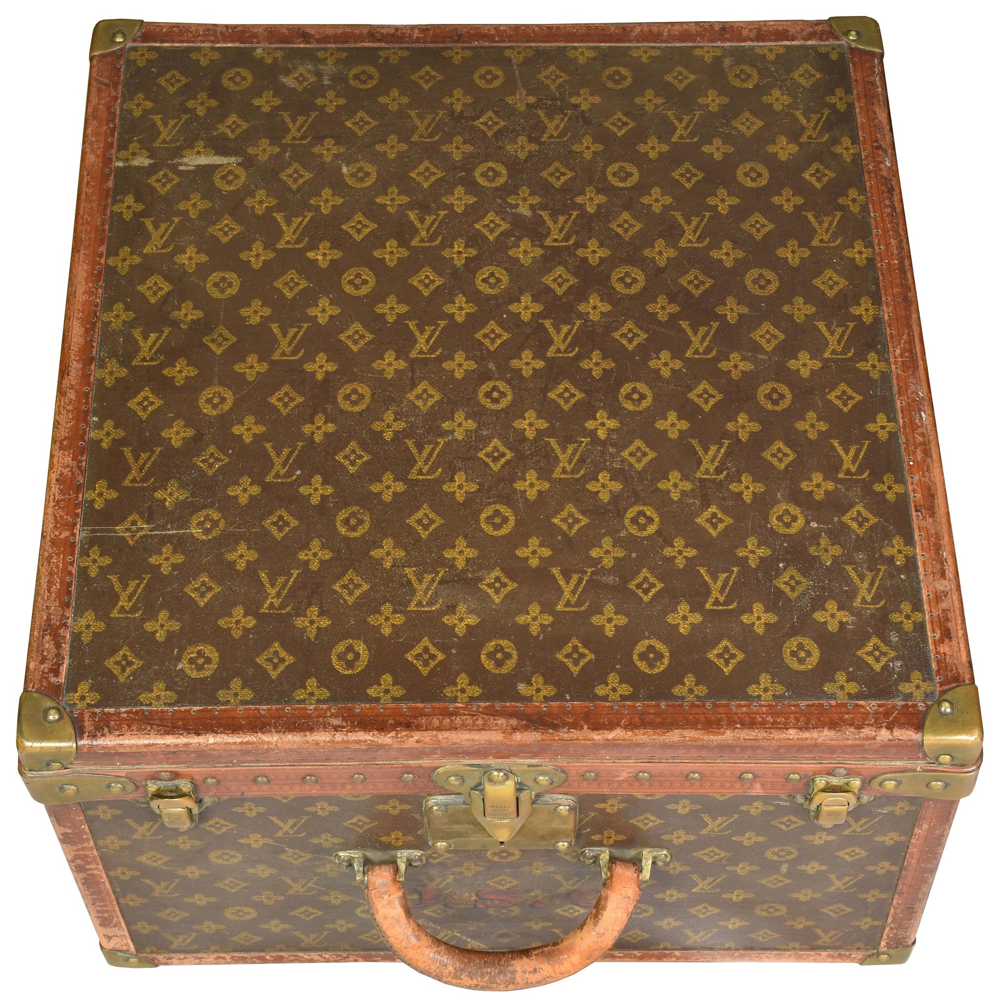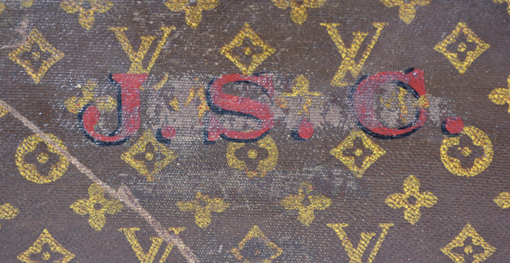 Baule da viaggio d'epoca in legno, rivestito in tela monogram con finiture in pelle e minuteria in ottone. Ancora presente la 'gabbia a nastro', ossia il contenitore mobile con telaio in legno su cui e' teso un nastro di tela. Cm 51x31x51. Iniziali J. S. C. sotto il manico. Seriale: 775687. Etichetta del rivenditore Arthur Gilmore Inc. e, New York e dello storico negozio al 70, Champs-Elysee. Datato 1930 - 1940. Prodotto in Francia. Presenta difetti e segni del tempo, ma le condizioni generali sono molto buone. Ben conservato.