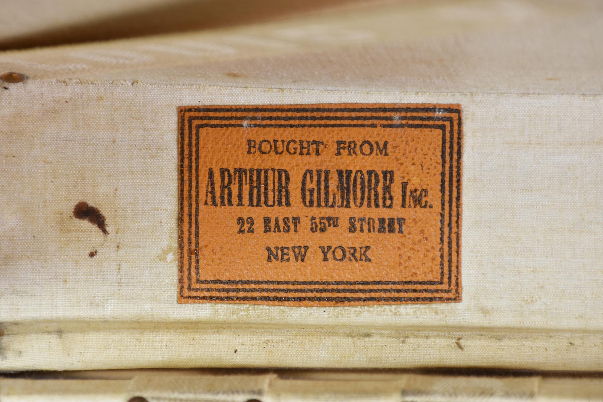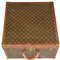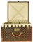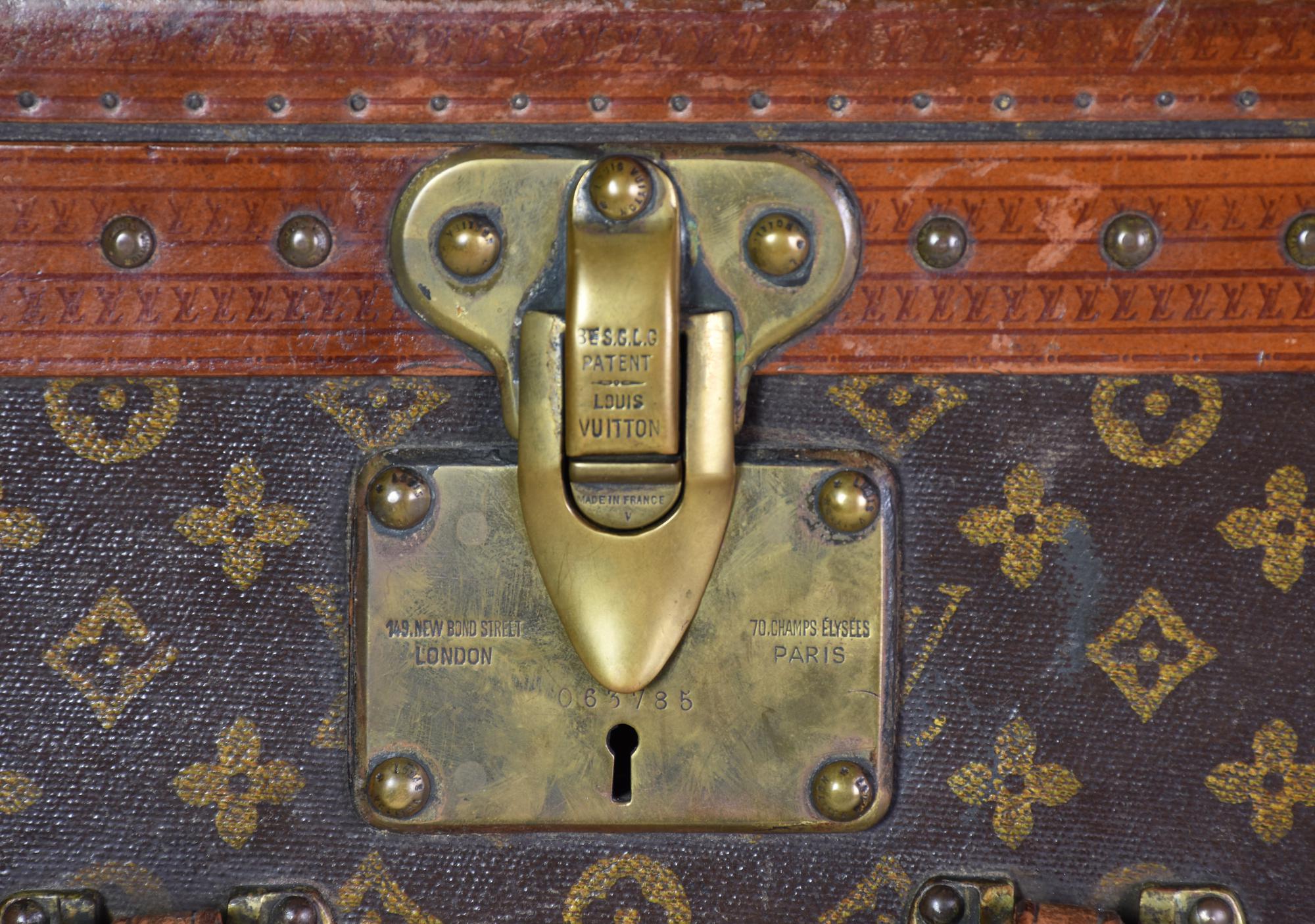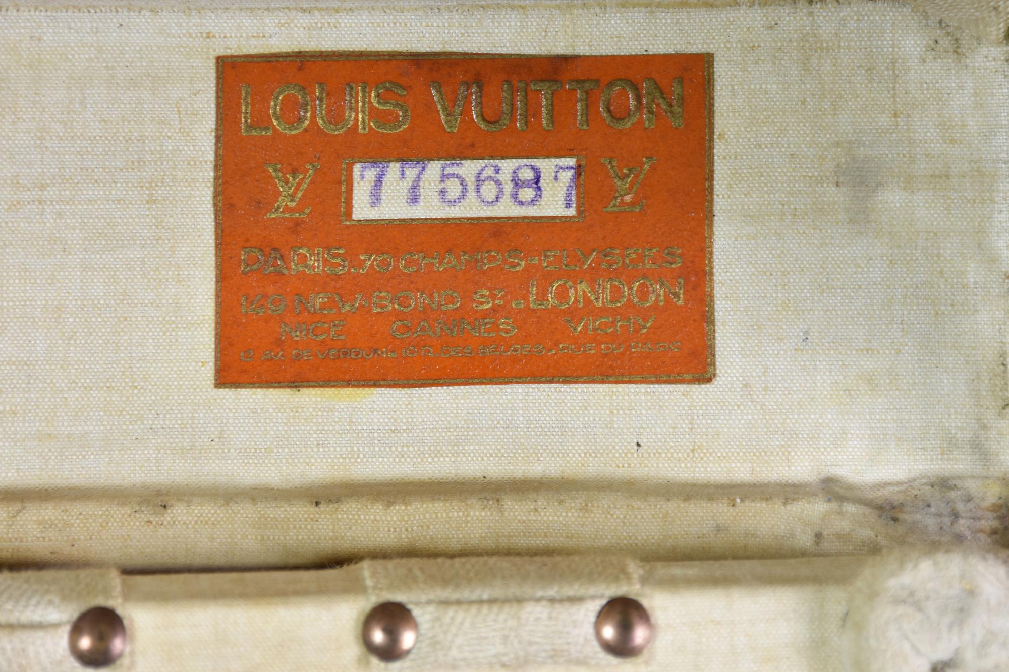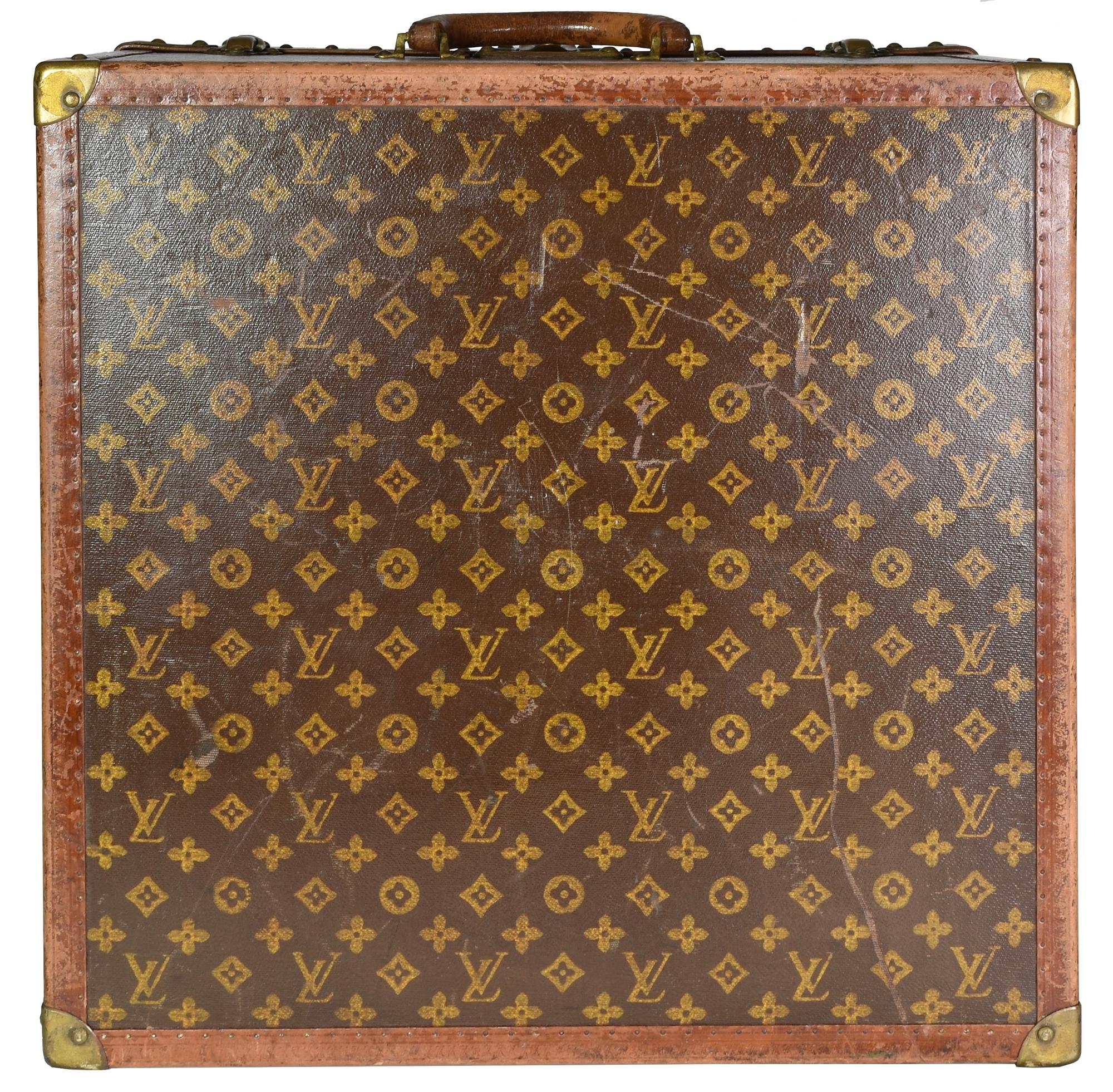 Baule da viaggio d'epoca in legno, rivestito in tela monogram con finiture in pelle e minuteria in ottone. Ancora presente la 'gabbia a nastro', ossia il contenitore mobile con telaio in legno su cui e' teso un nastro di tela. Cm 51x31x51. Iniziali J. S. C. sotto il manico. Seriale: 775687. Etichetta del rivenditore Arthur Gilmore Inc. e, New York e dello storico negozio al 70, Champs-Elysee. Datato 1930 - 1940. Prodotto in Francia. Presenta difetti e segni del tempo, ma le condizioni generali sono molto buone. Ben conservato.