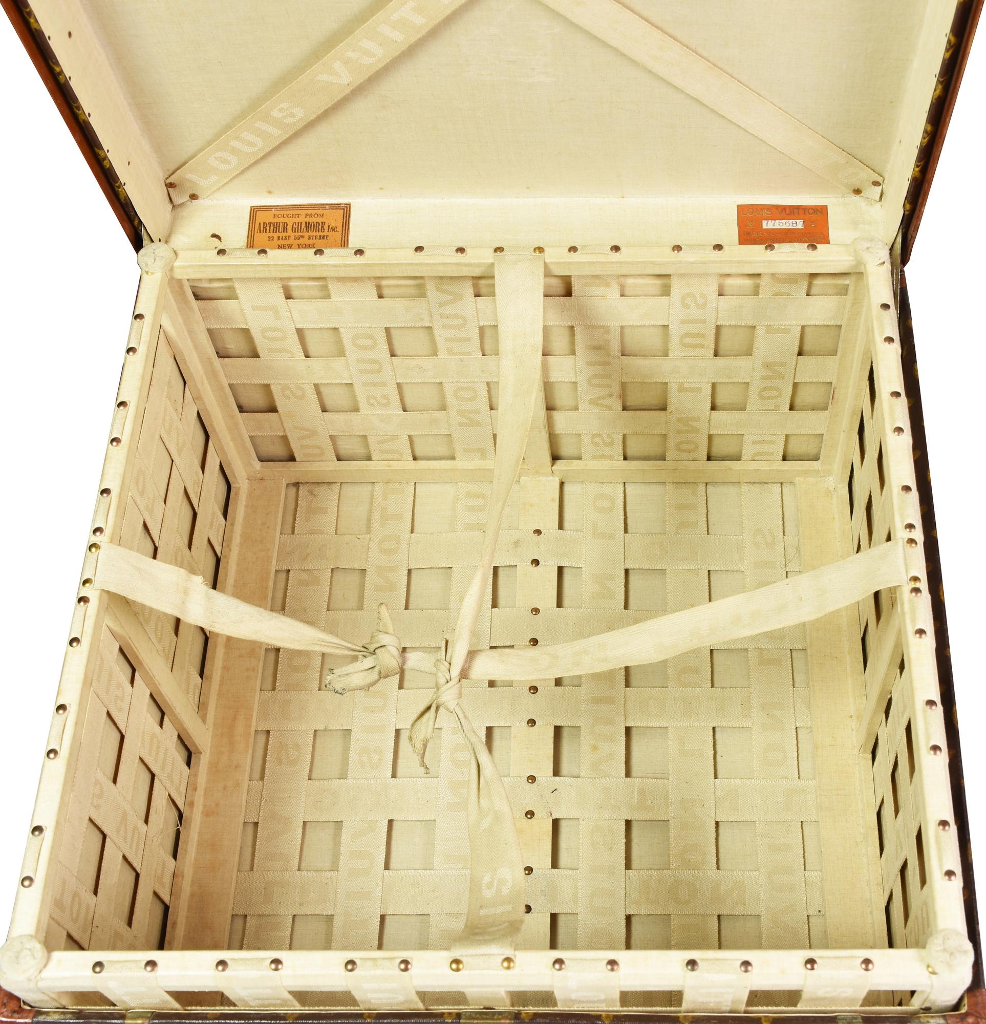 Vintage wooden travel trunk, covered in monogram canvas with leather trim and brass hardware. Still retains the 'ribbon cage', a movable container with a wooden frame on which a canvas ribbon is stretched. Dimensions: 51x31x51 cm. Initials 'J. S. C.' under the handle. Serial number: 775687. Retailer label from Arthur Gilmore Inc., New York, and the historic store at 70, Champs-Elysees. Dated 1930 - 1940. Made in France. Shows defects and signs of age, but overall condition is very good. Well preserved.