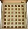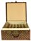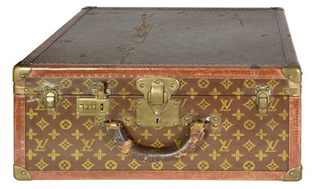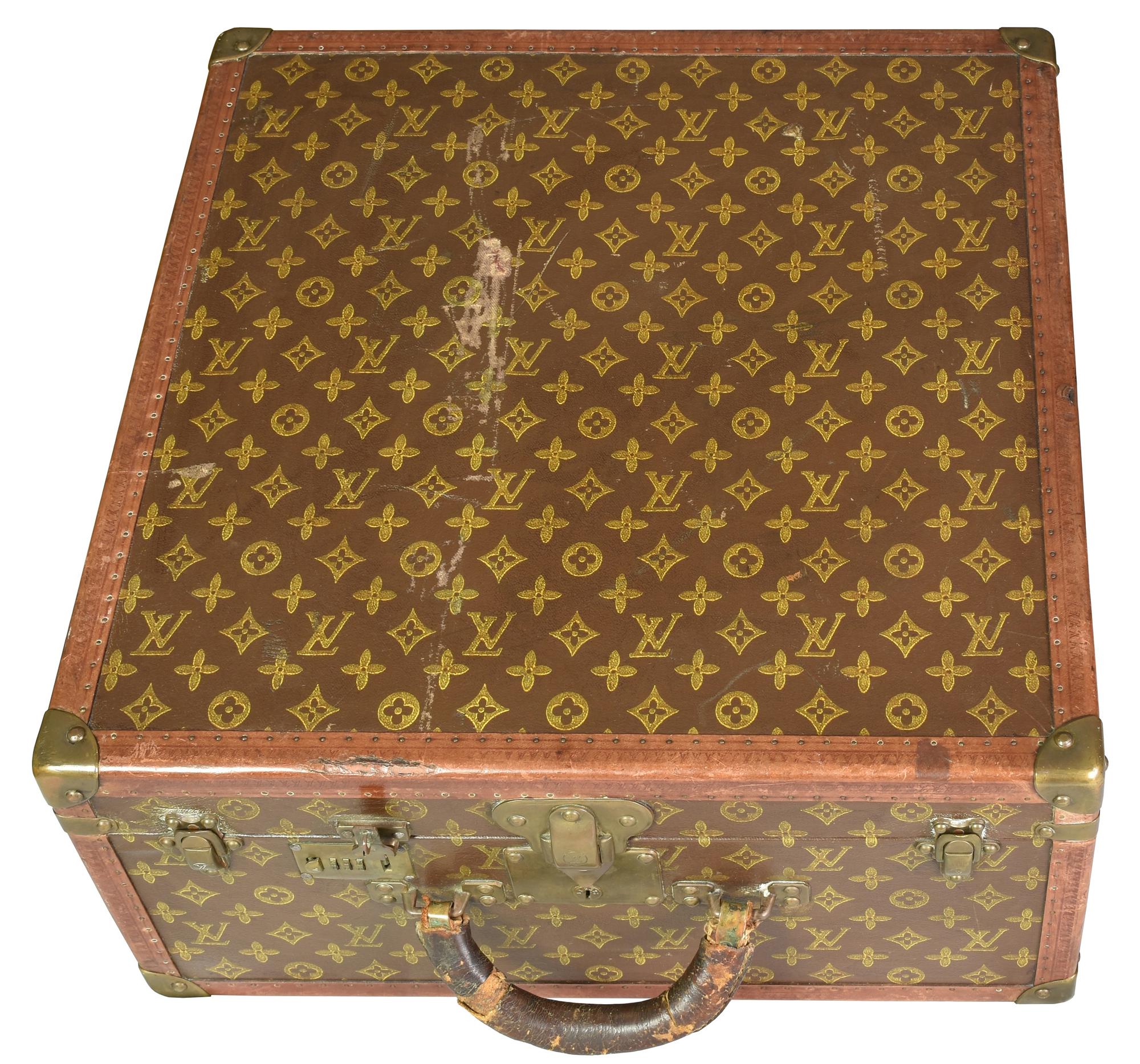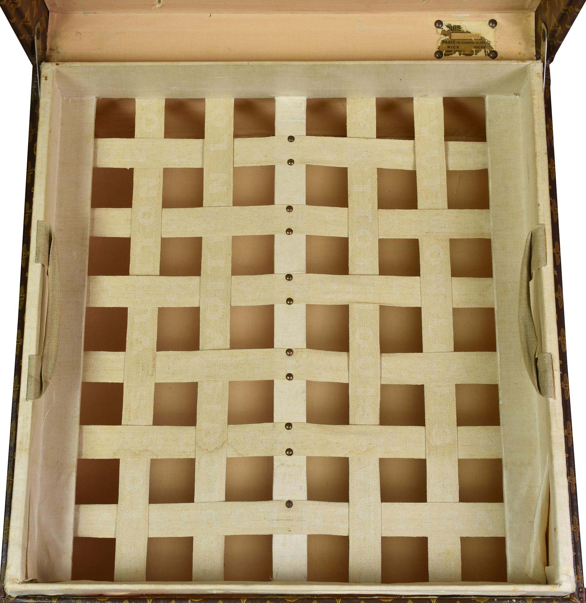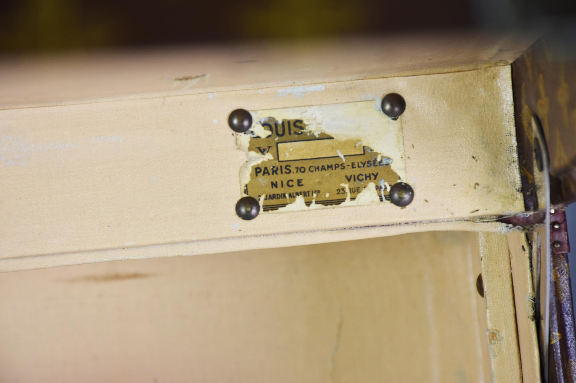 Baule da viaggio d'epoca in legno, rivestito in tela monogram con finiture in pelle e minuteria in ottone. Ancora presente la 'gabbia a nastro', ossia il contenitore mobile con telaio in legno su cui e' teso un nastro di tela. Cm 49,50x23x49. Presenta l'etichetta dello storico negozio al 70, Champs-Elysee. Datato 1940 - 1950. Prodotto in Francia. Presenta difetti e segni del tempo, ma le condizioni generali sono buone. Ben conservato.
