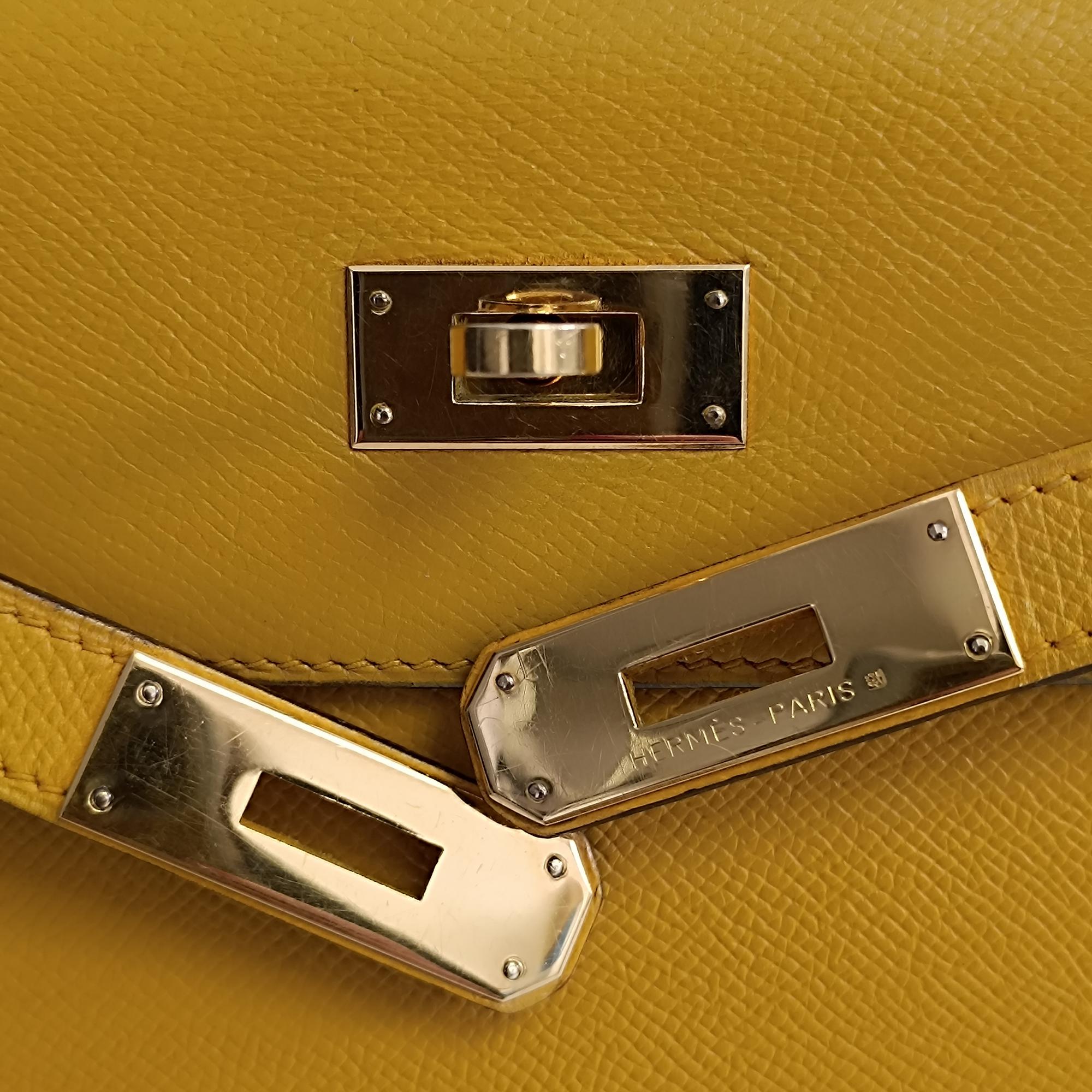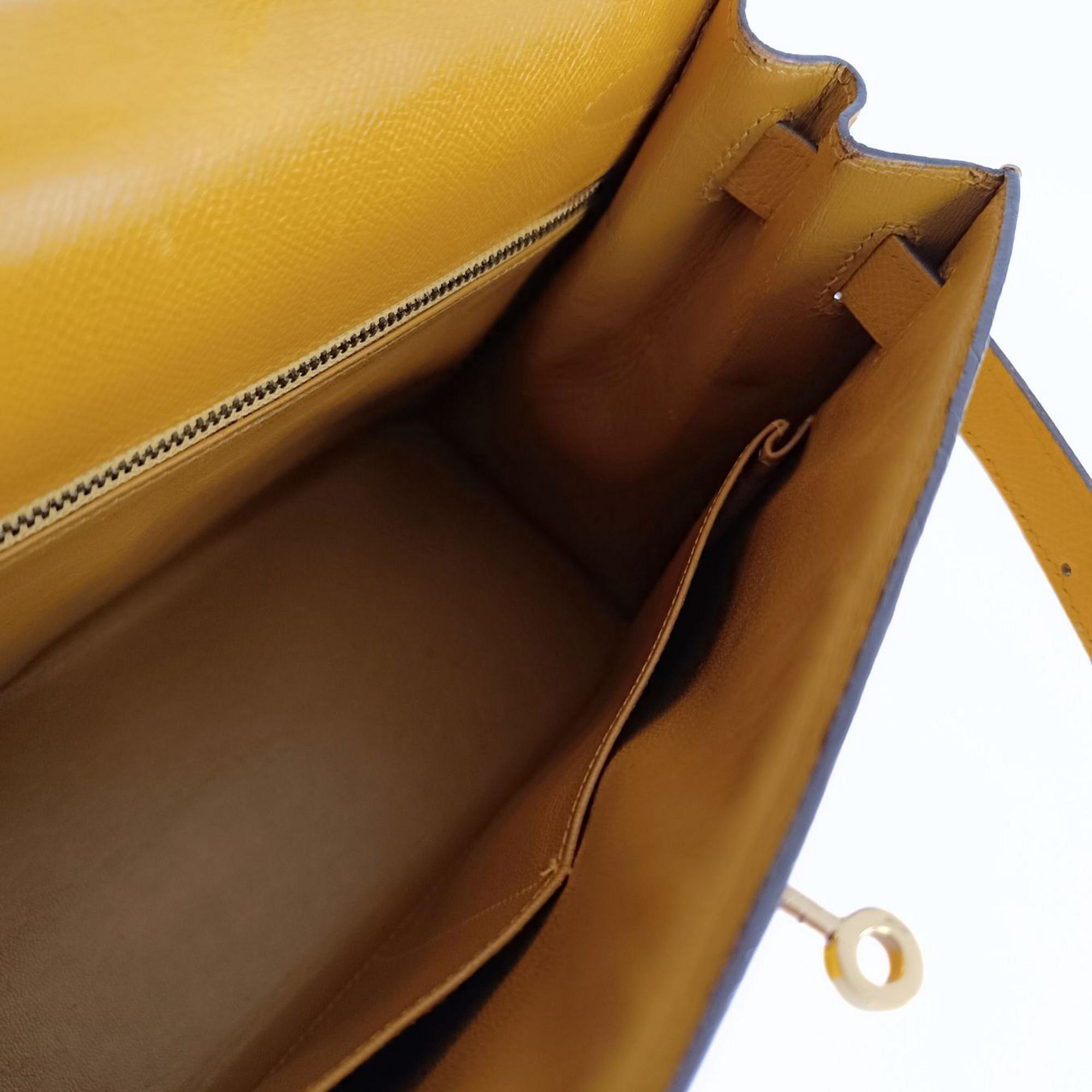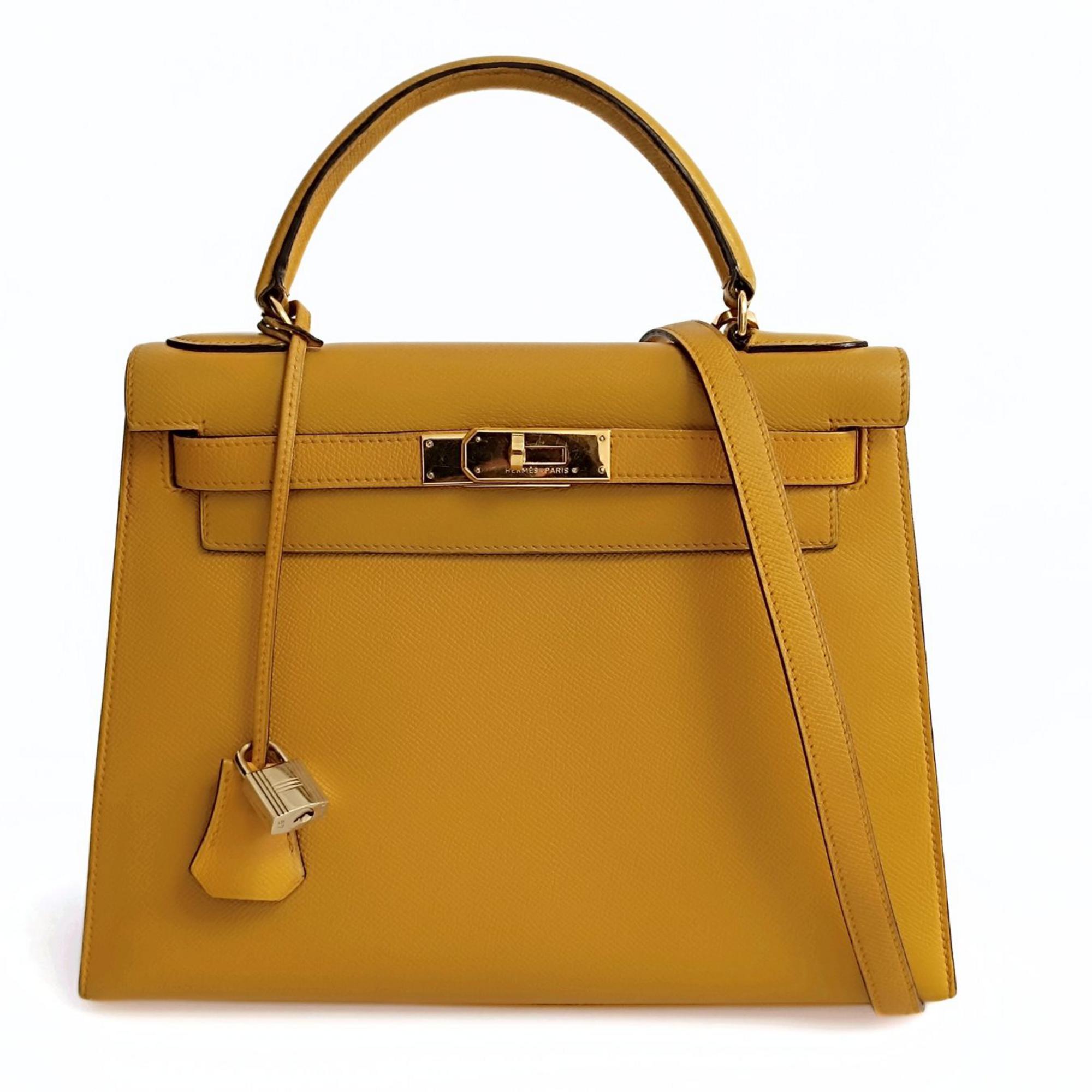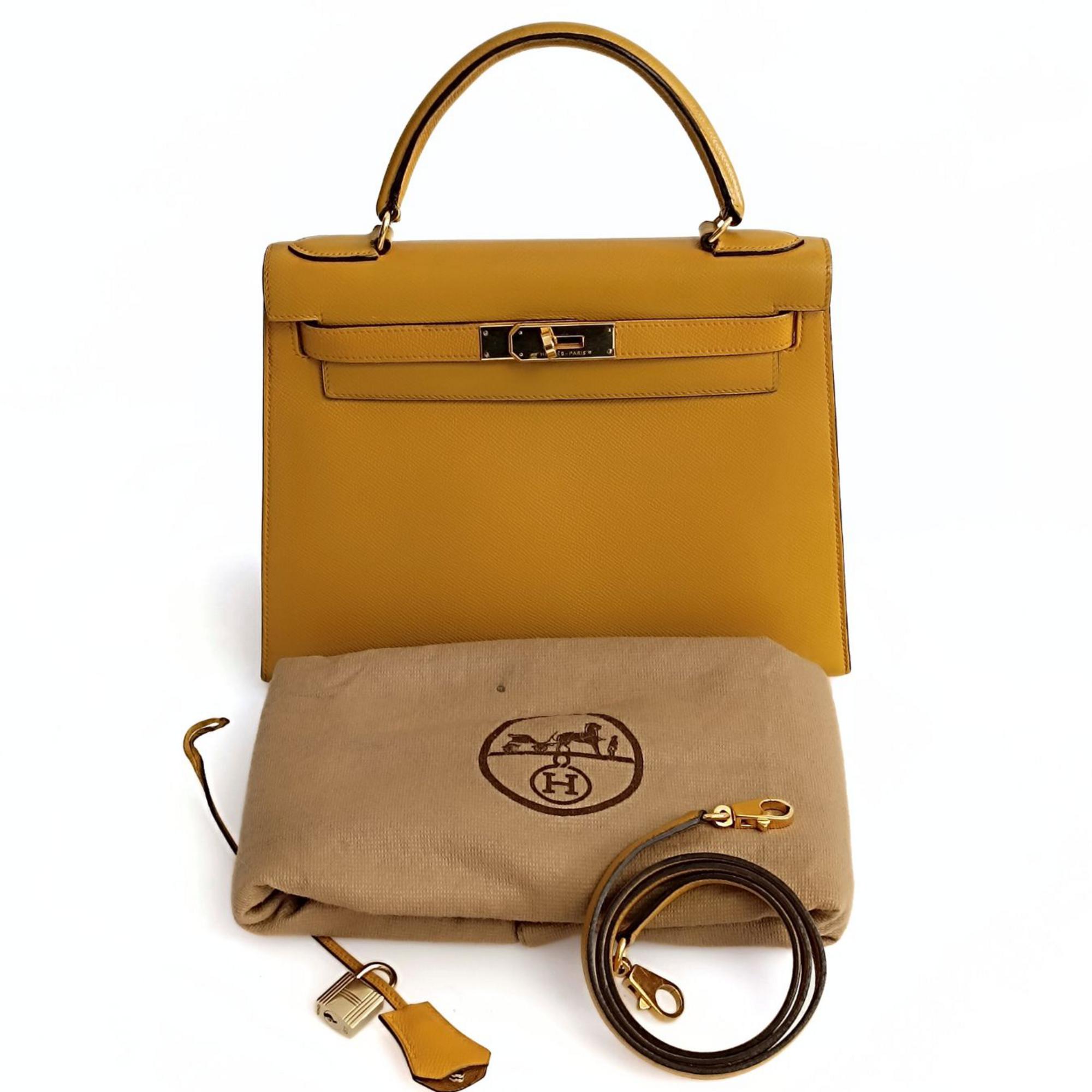 Hermes Kelly 28 shoulder bag in Courchevel yellow gold leather.