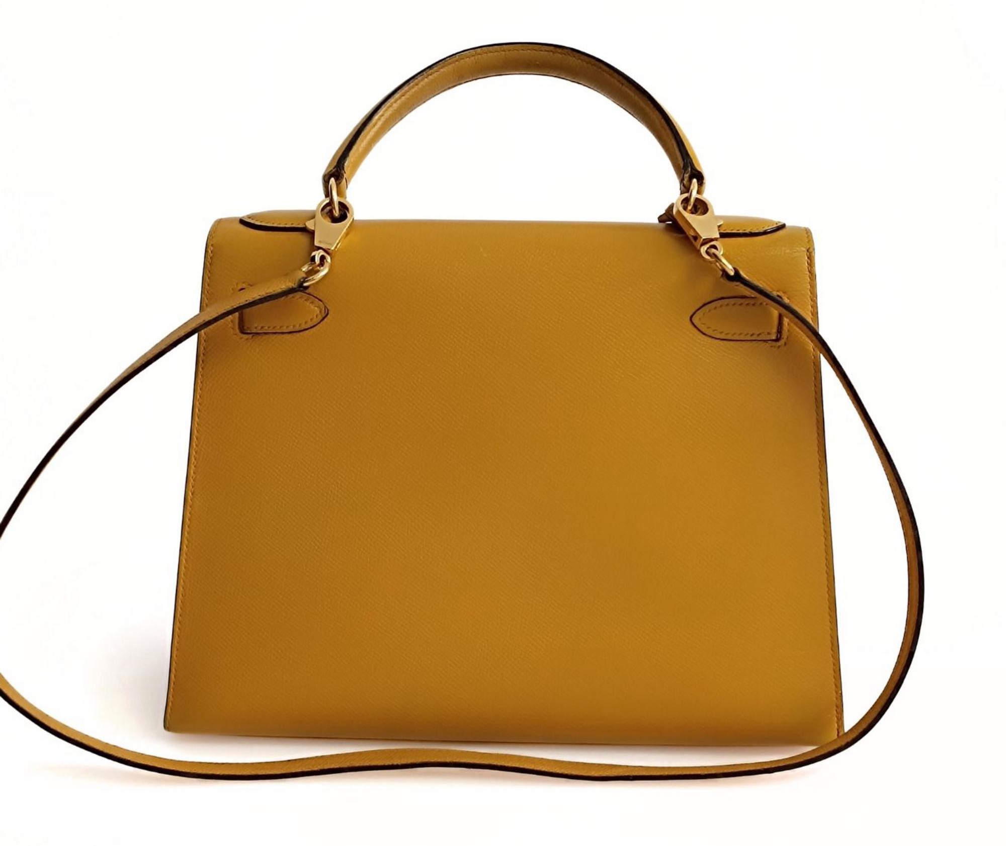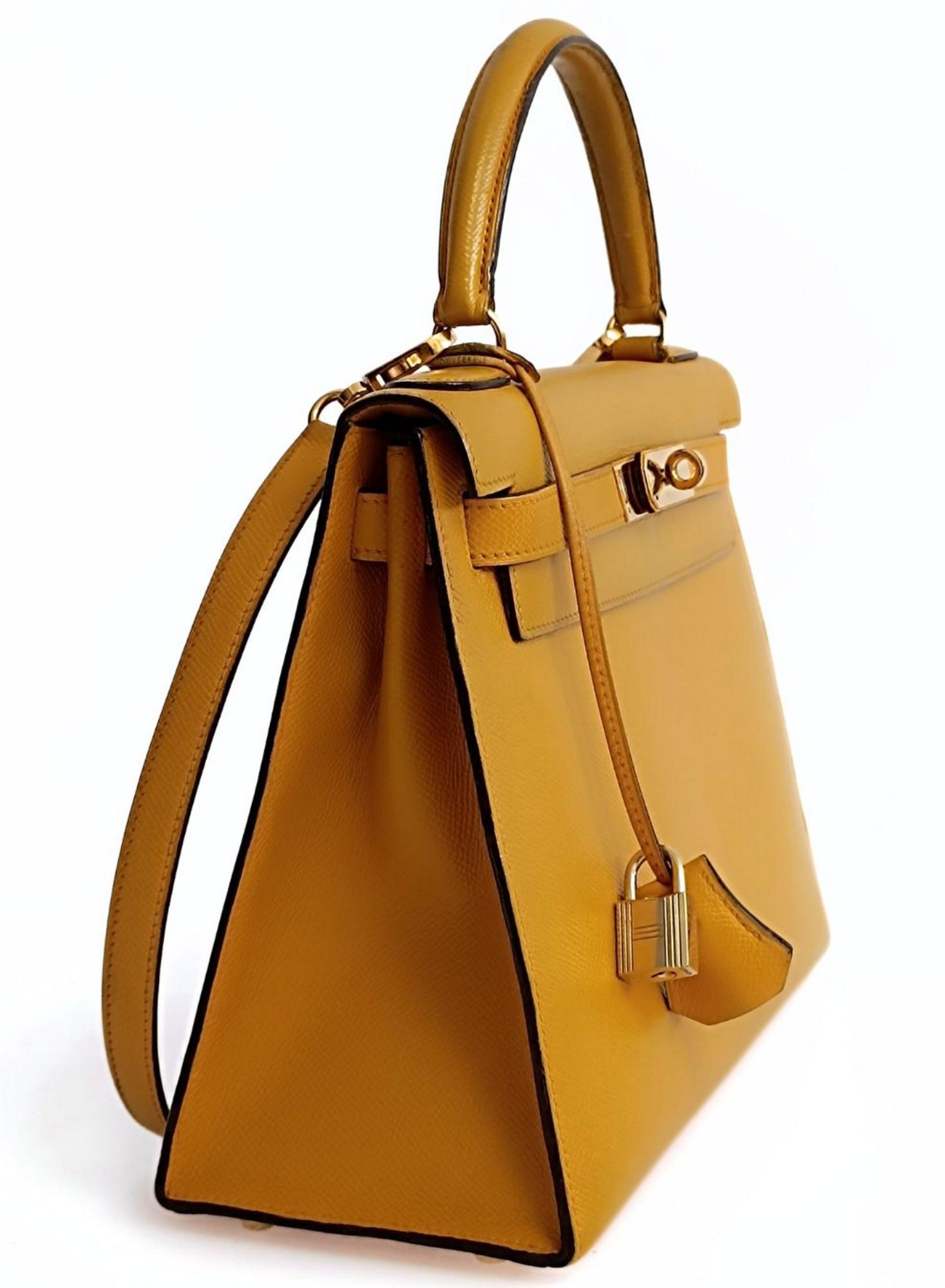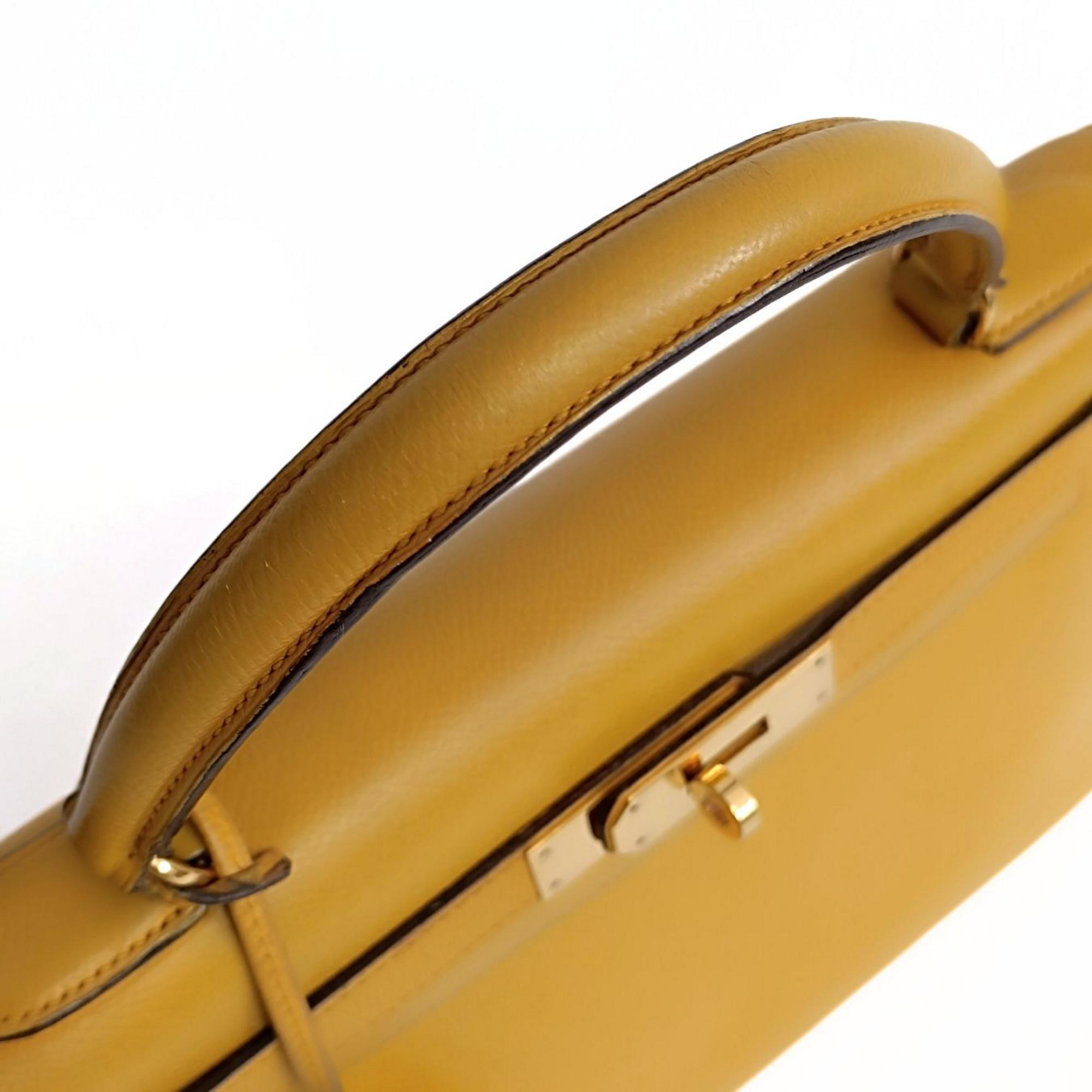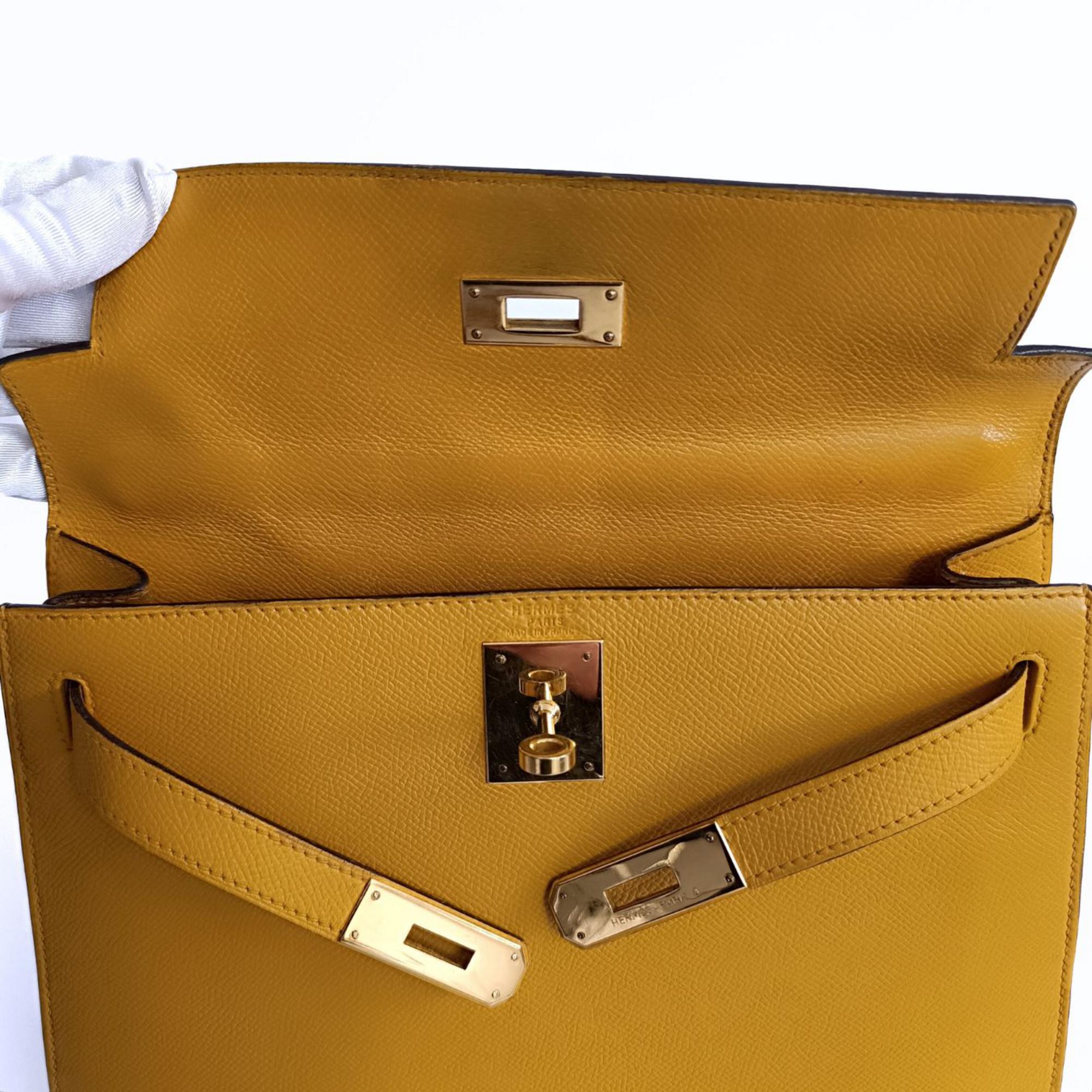 Hermes Kelly 28 shoulder bag in Courchevel yellow gold leather.