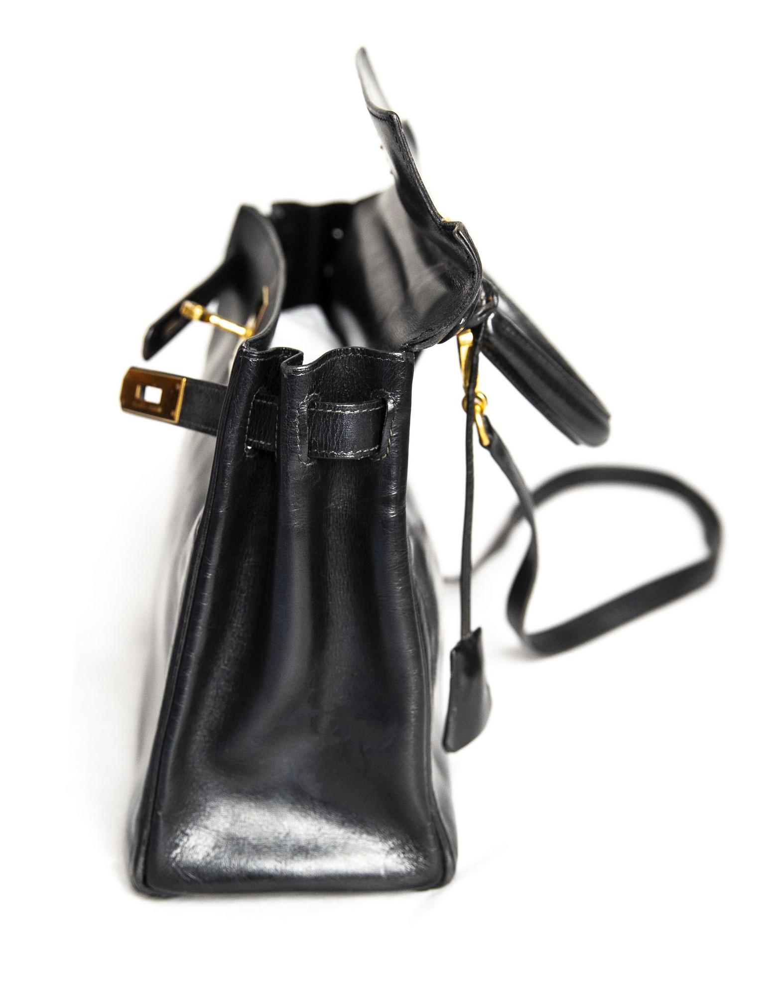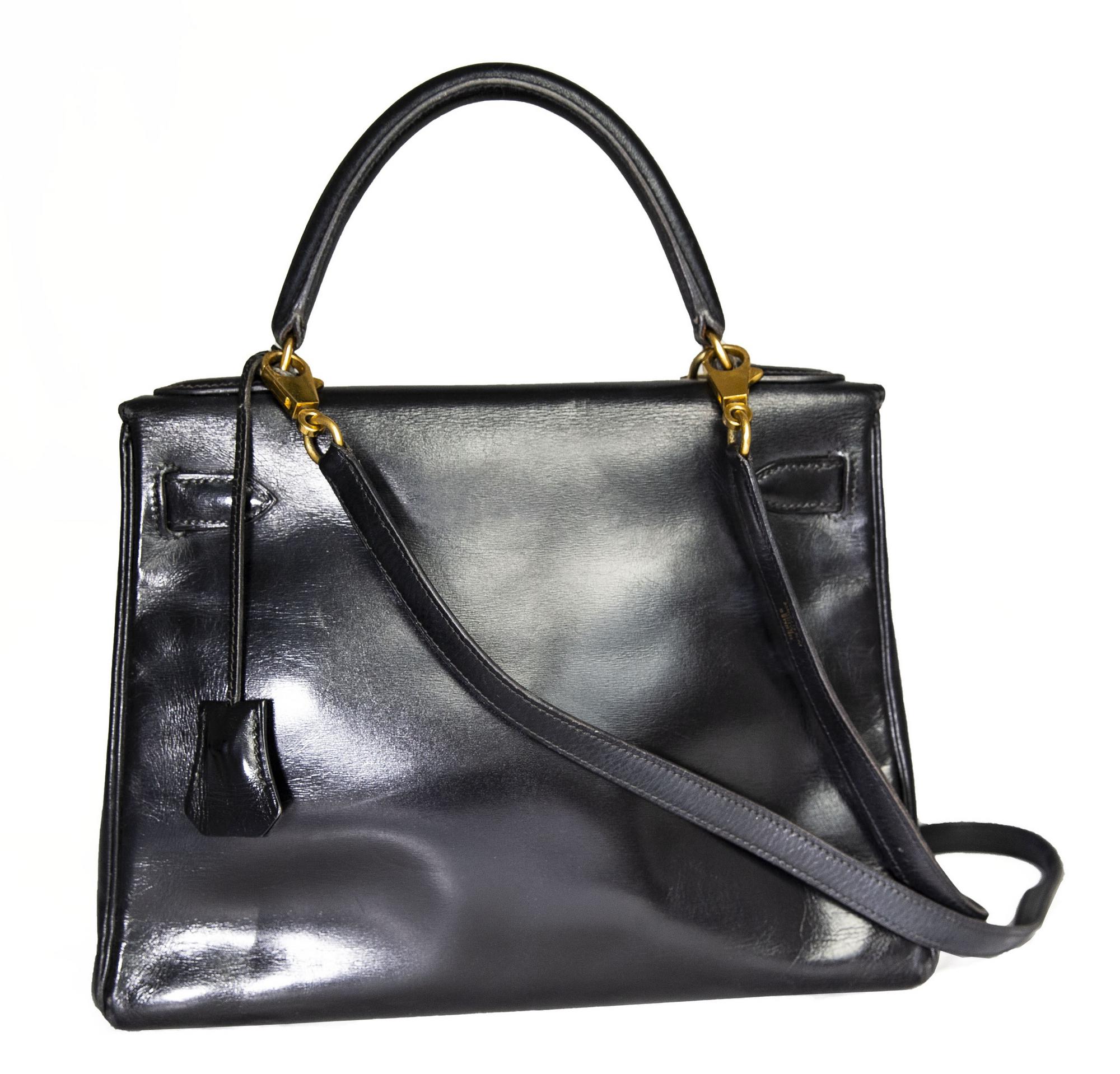 Borsa Hermes Kelly 28 in pelle nera e dettagli metallici oro. La borsa presenta nel complesso lievi segni d'uso essendo una borsa vintage, ma e' ben conservata, segni di usura nella zona degli angoli alla base. Include: 2 chiavi, lucchetto, tracolla. Anno 1991. Larghezza: 28 cm, Altezza: 22 cm, Profondita' della base: 9 cm. Ben conservata.