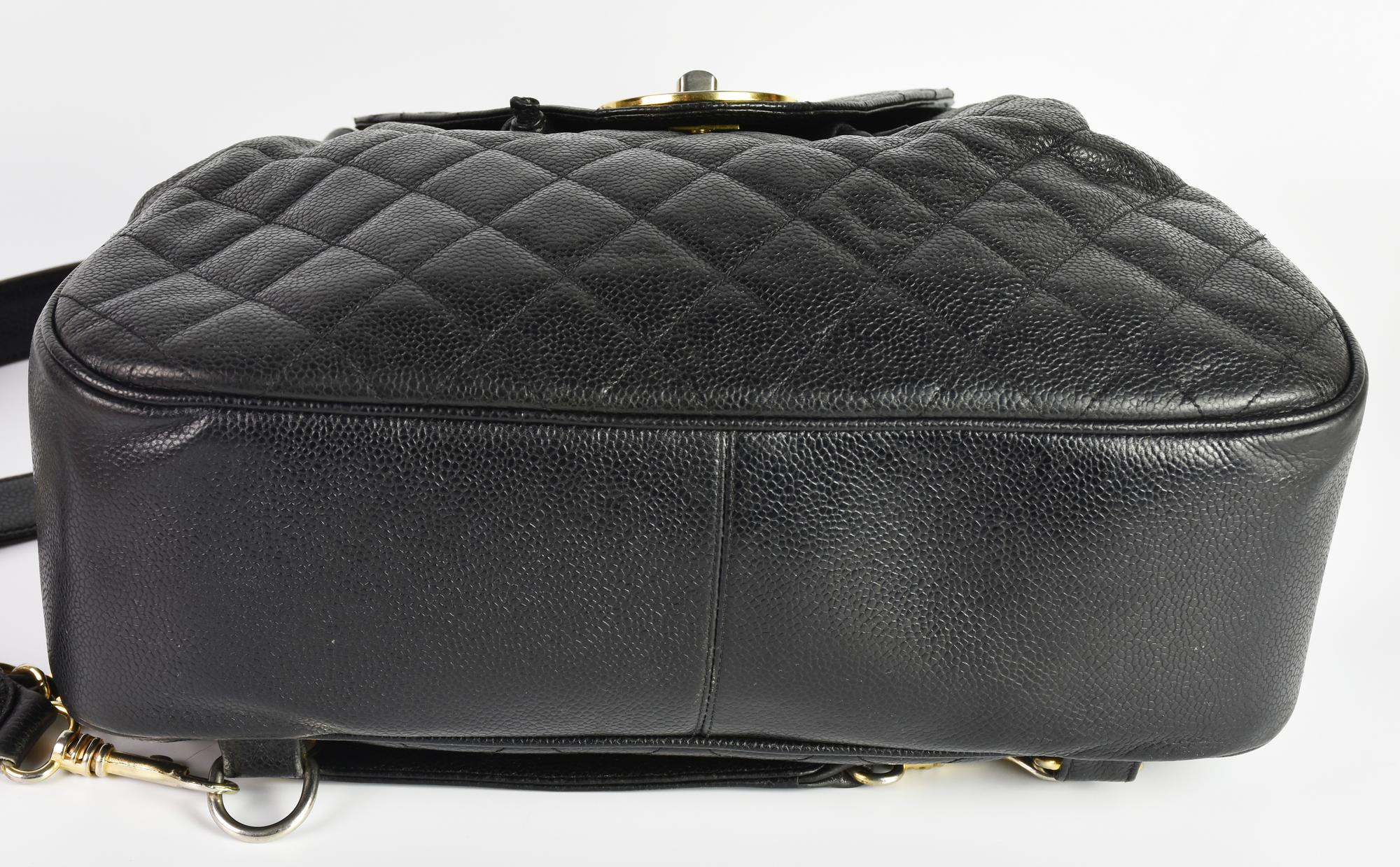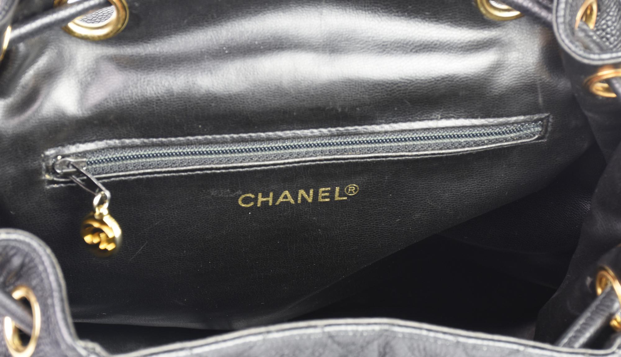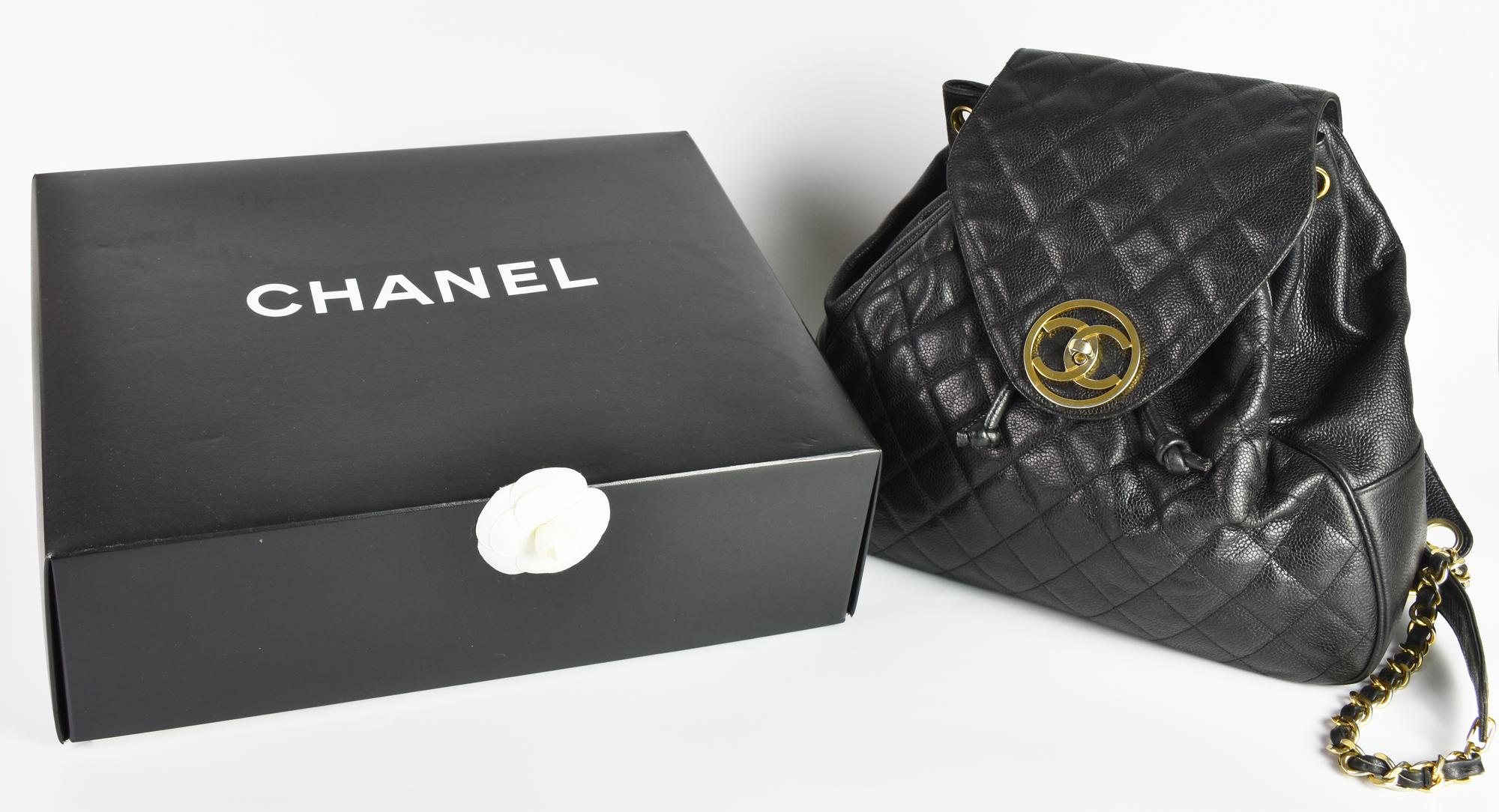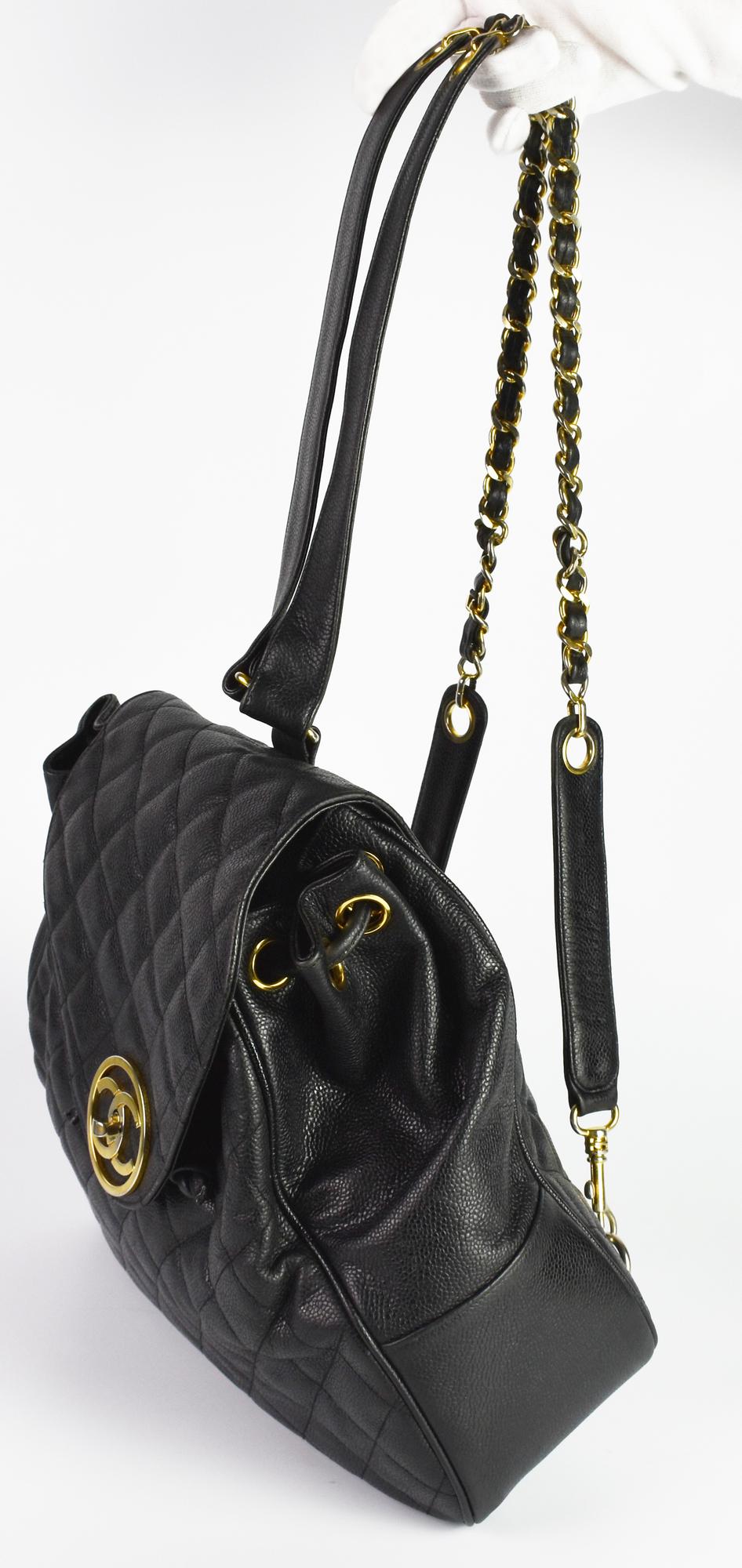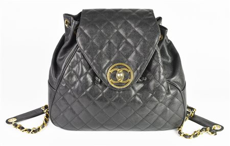 Iconic black quilted leather backpack. Closure with the Maison's logo. Interior in black leather organized into a single compartment with two zippered pockets. Hardware in gold-tone metal. Dimensions: 33x29x12 cm. Purchased at the Rodeo Drive boutique in Los Angeles in 1990. Item produced exclusively for the US market. With original box. Made in Italy. Well preserved.