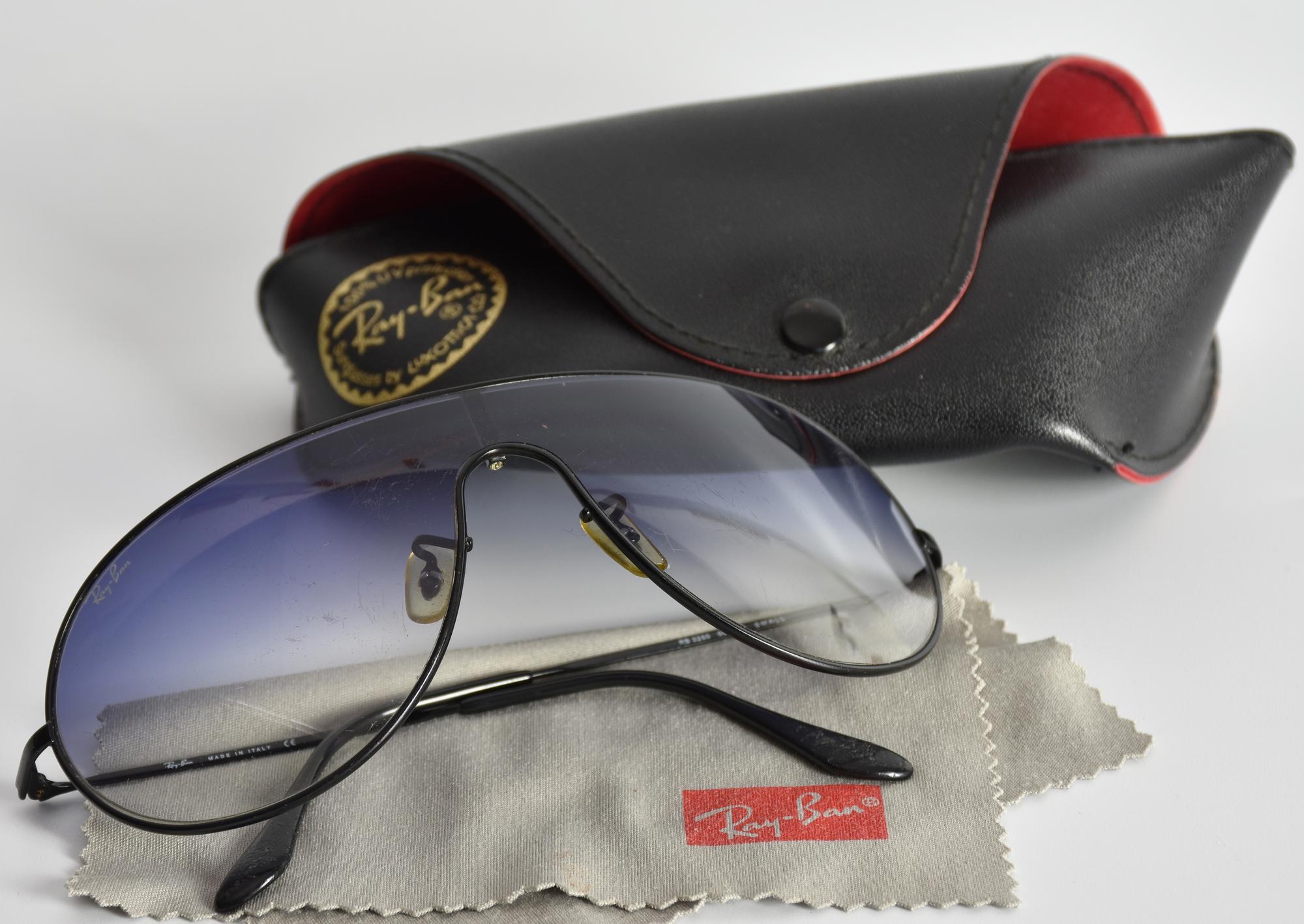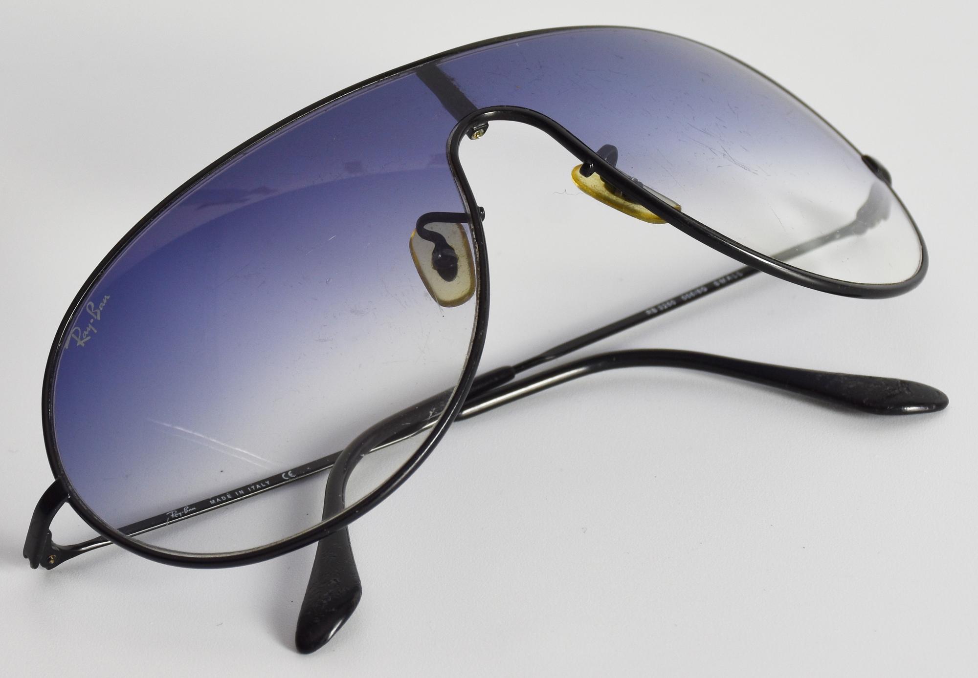 Ray-Ban SUNGLASSES DESCRIPTION: Mask-style sunglasses. Black frame with blue...