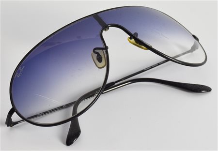 Occhiali da sole a mascherina. Montatura nera e lenti blu. Custodia originale. Discretamente conservati.