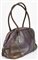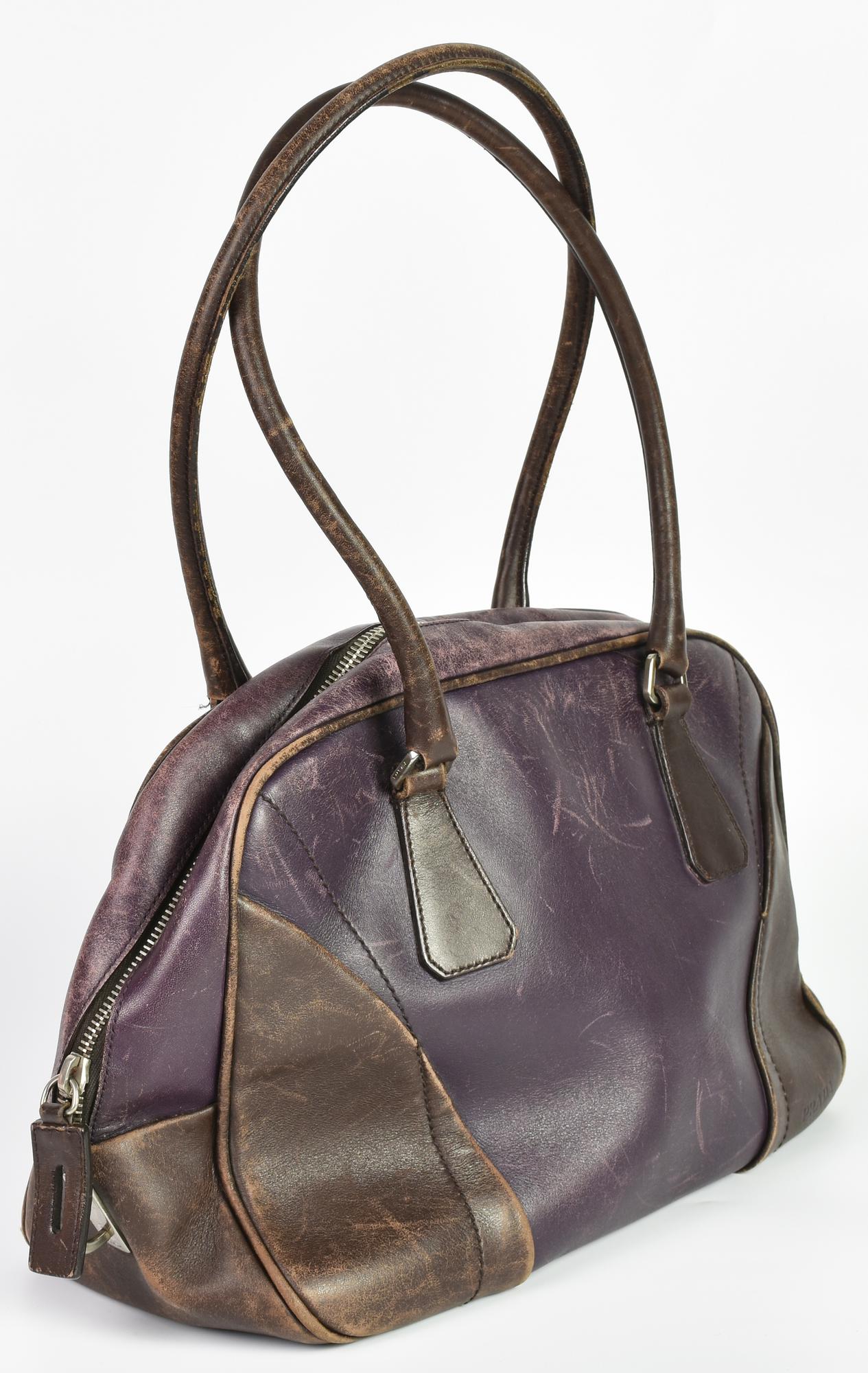 PRADA Borsa a mano modello Bowling Bag in pelle viola e marrone con doppio manico. Chiusura con cerniera. Interno in tessuto logato organizzato in un unico vano, con un taschino laterale con cerniera. Hardware in metallo cromato. Cm 31x20x12. Altezza coi manici cm 43. Difetti e mancanze. Discretamente conservata.