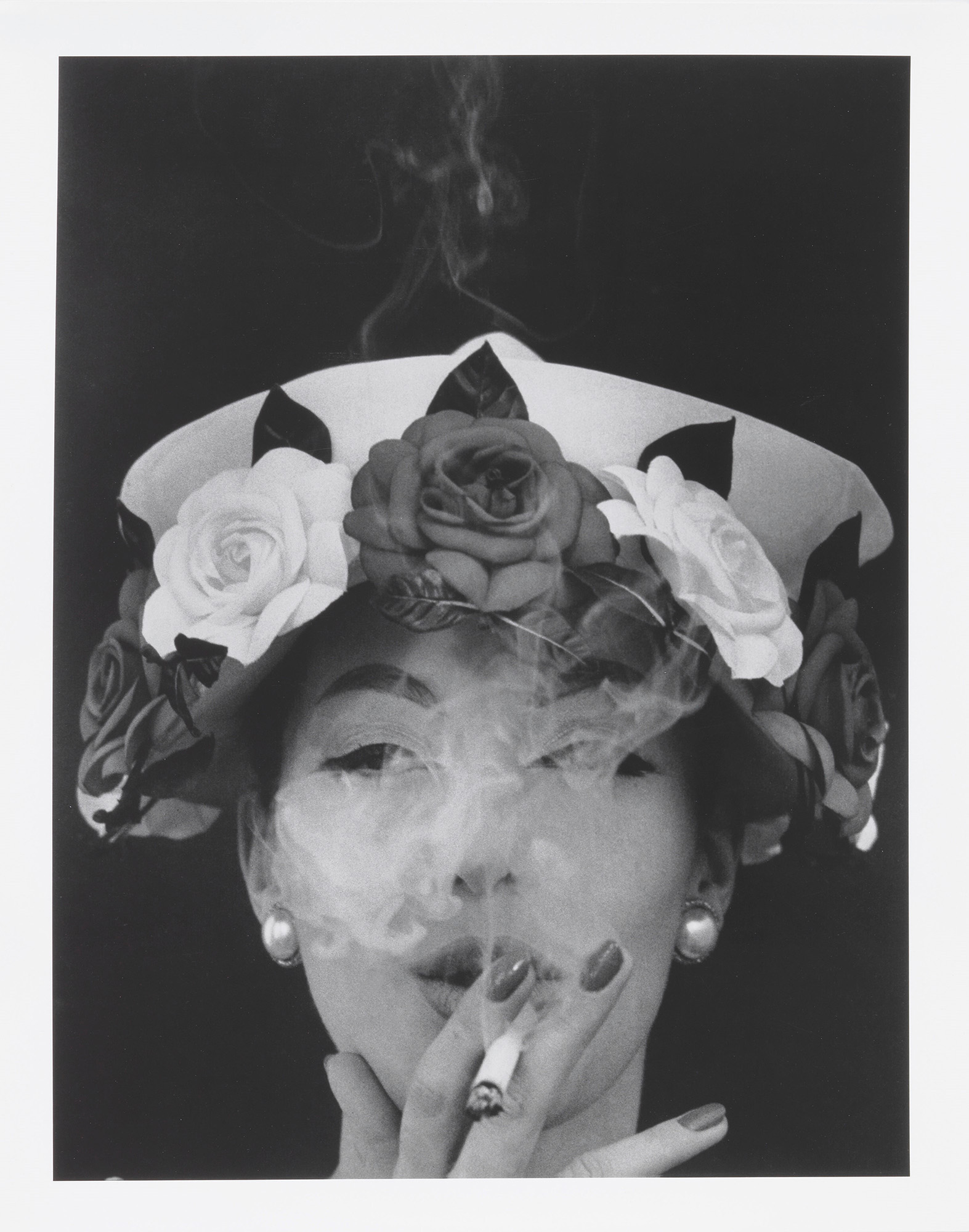 Titolo, data e firma al verso: Hat + 5 Roses, Paris, 1956 (Vogue) William Klein.
