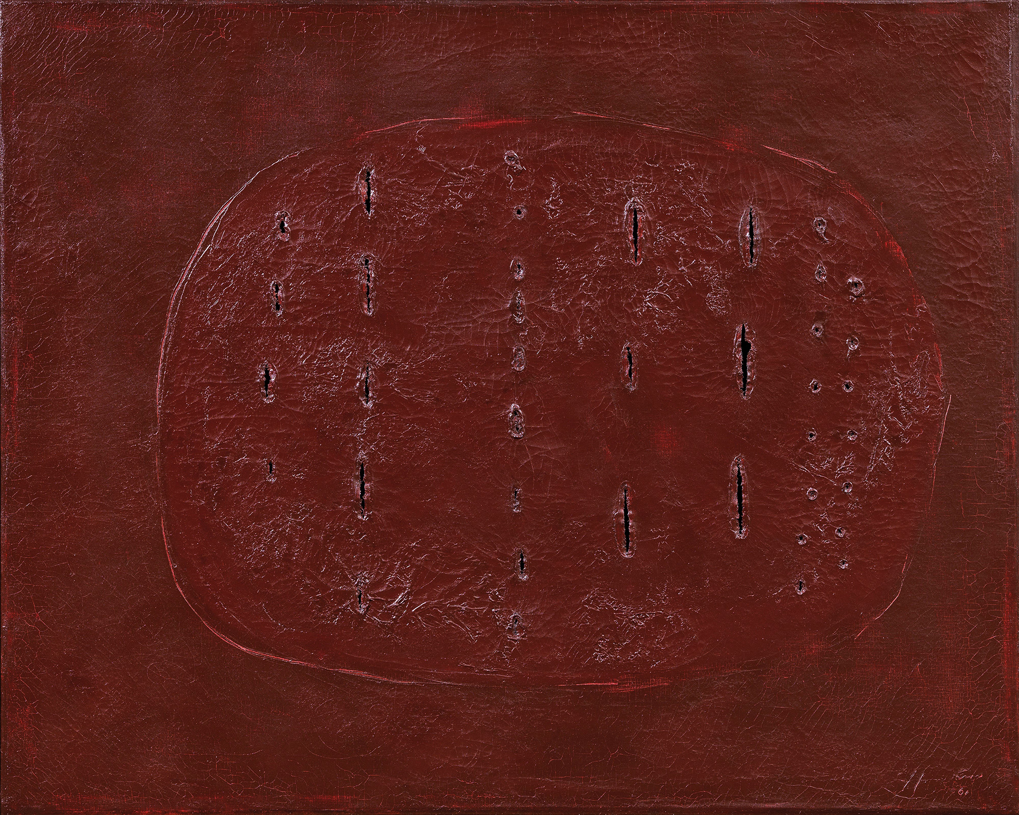 Olio, buchi, tagli e graffiti su tela, marrone rossiccio