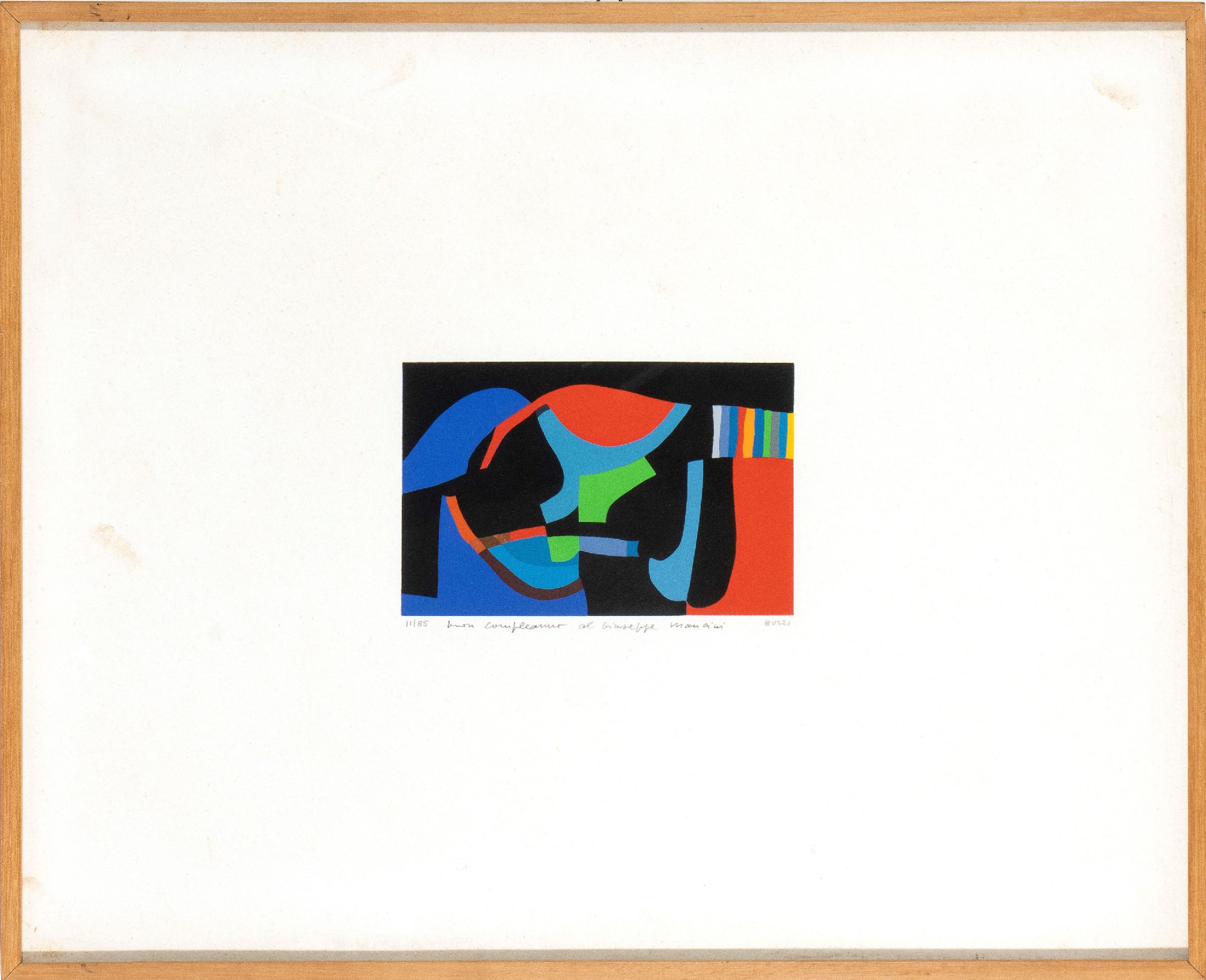 Firmato a matita in basso a destra: Burri, tir. in basso a sinistra: 11/85, dedica scritta a matita: Buon compleanno al Giuseppe Mancini