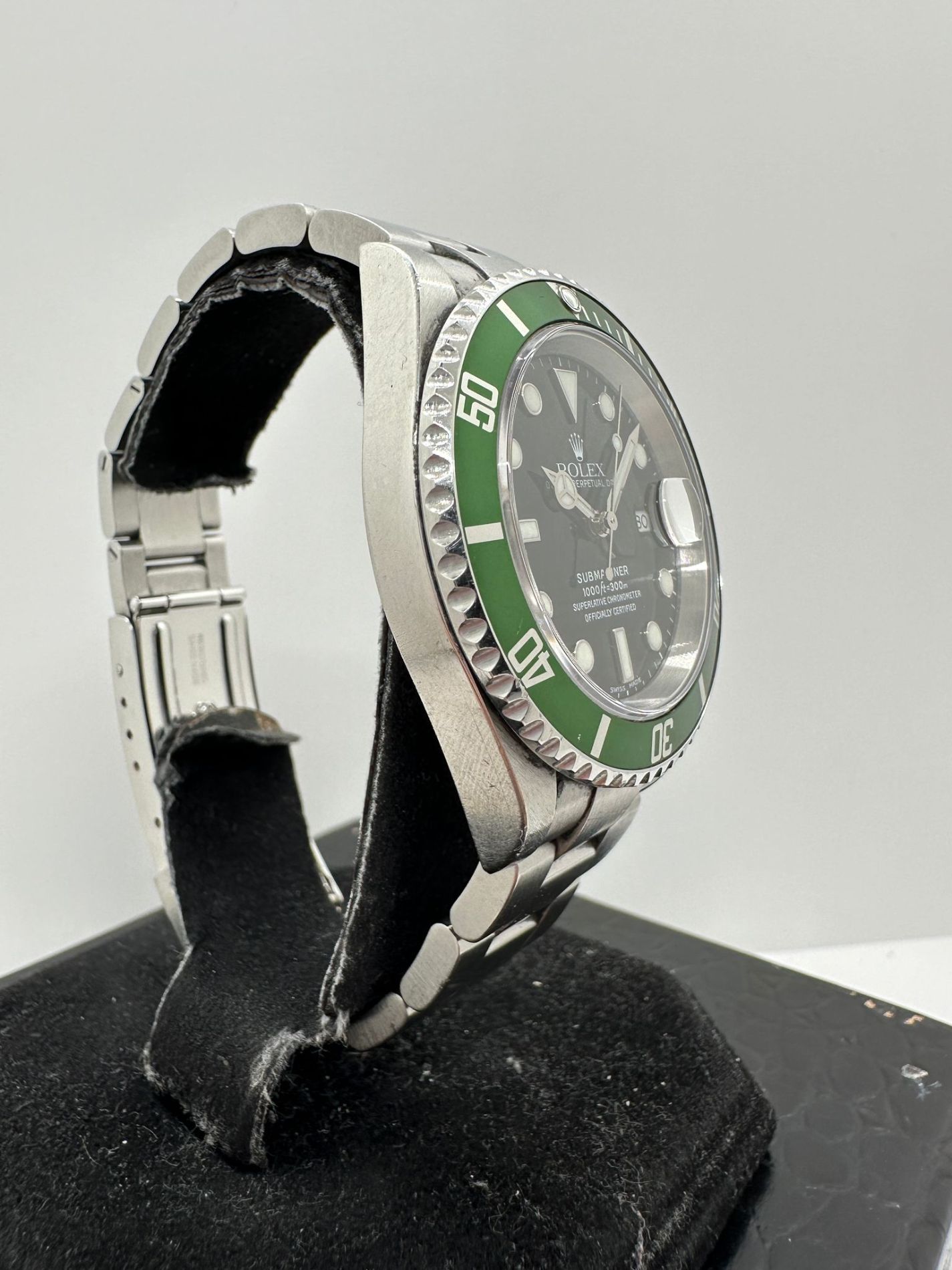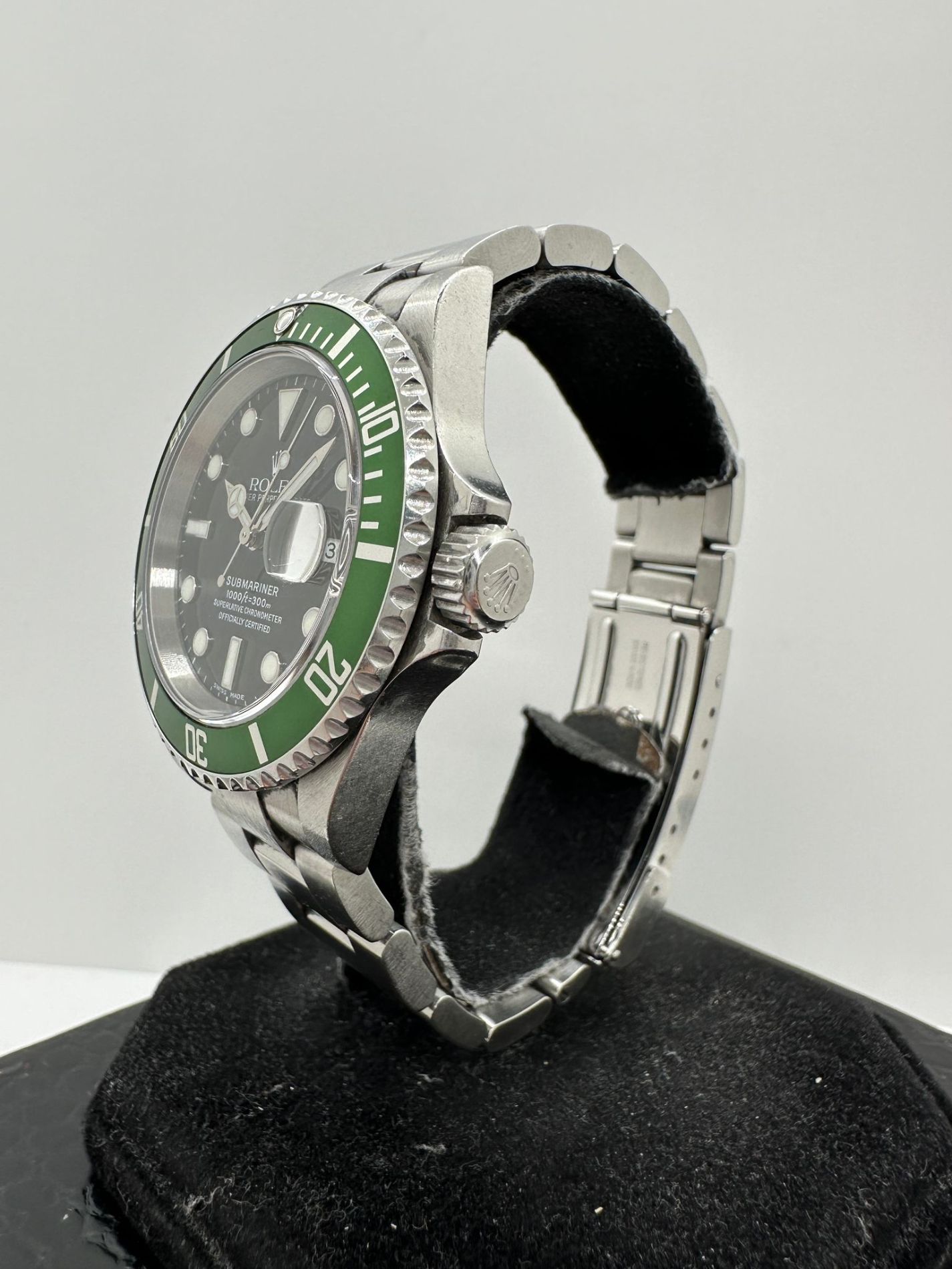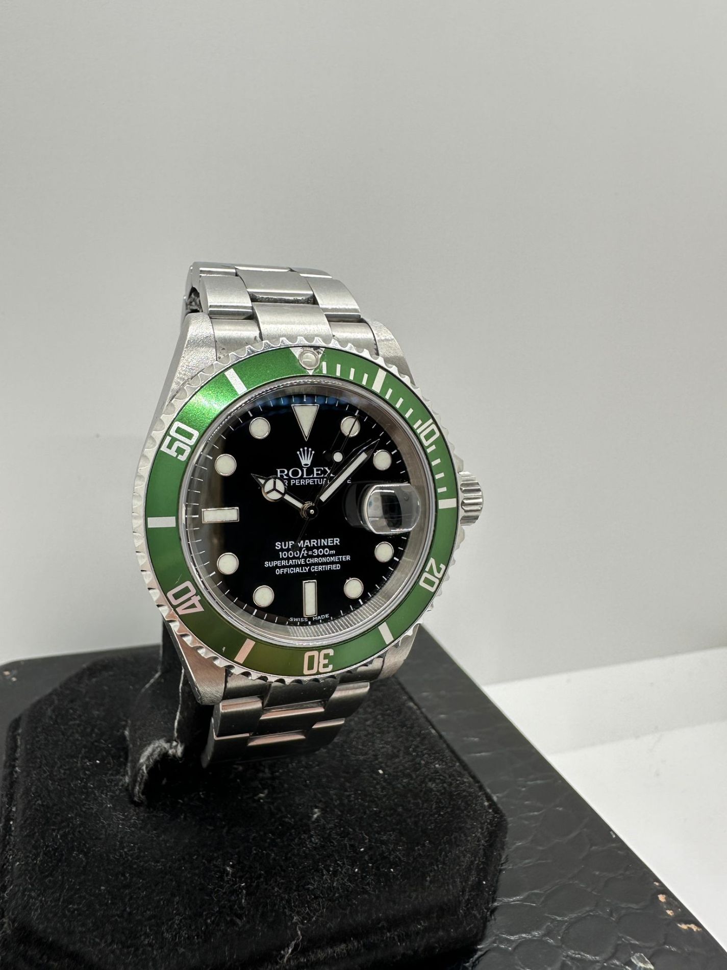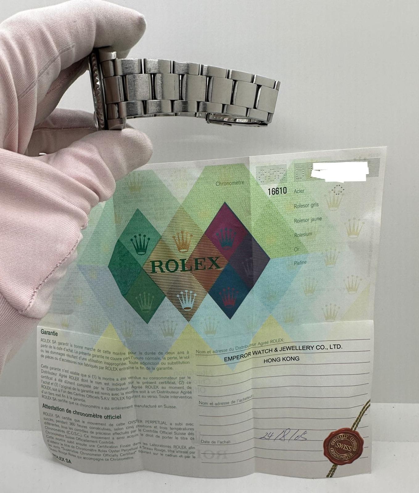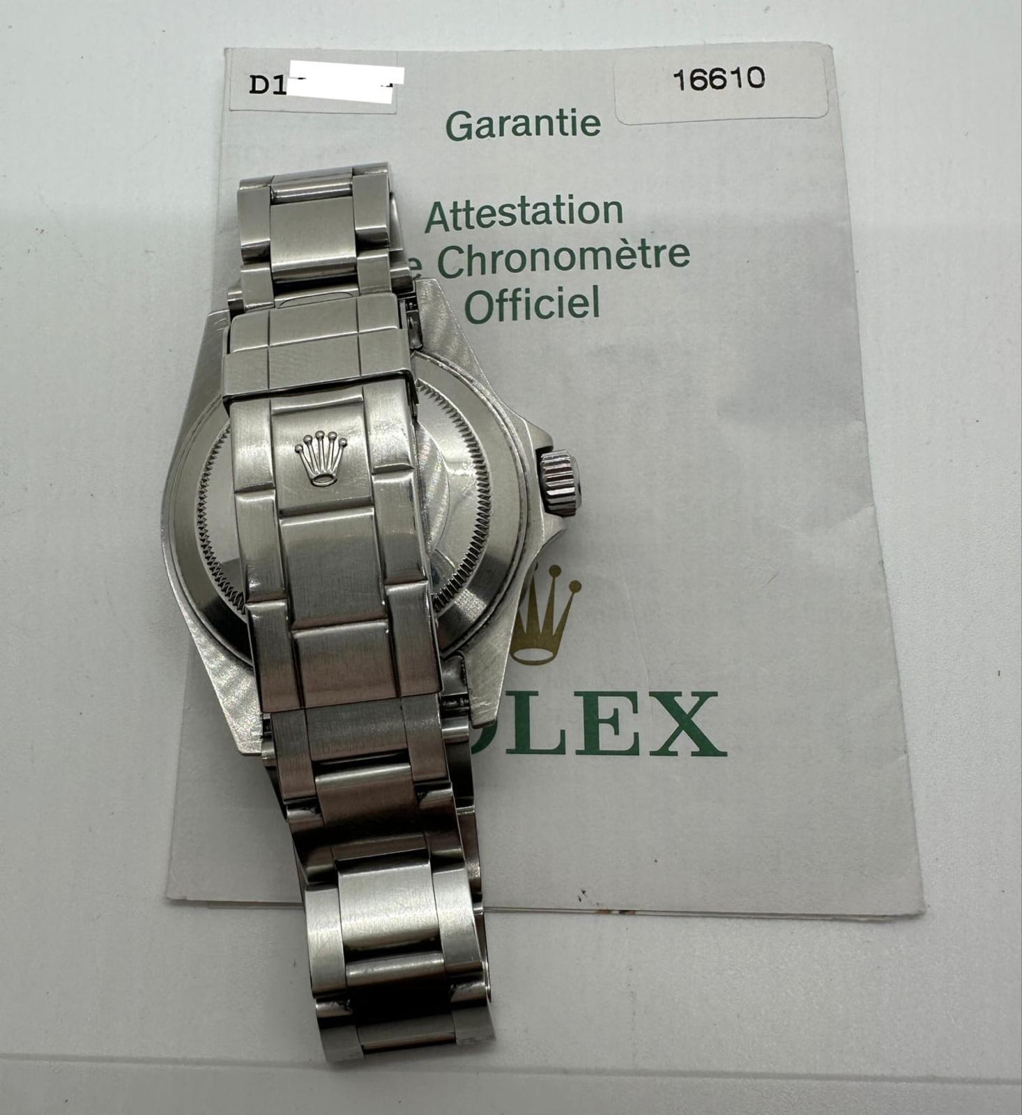 Marca Rolex Modello (Orologio) Submariner Date Numero di referenza 16610LV Carica Automatico Materiale della cassa Acciaio Materiale cinturino Acciaio Anno di produzione 2005 Condizione Ottimo (di seconda mano, segni di usura assenti o appena visibili) Corredo Documenti originali, no box Diametro 40 mm Impermeabile 30 ATM Materiale lunetta Acciaio Vetro Vetro zaffiro Quadrante Nero Numeri sul quadrante Senza numeri Cinturino Materiale cinturino Acciaio Colore cinturino Acciaio Chiusura Déployante Materiale chiusura Acciaio Funzioni Data