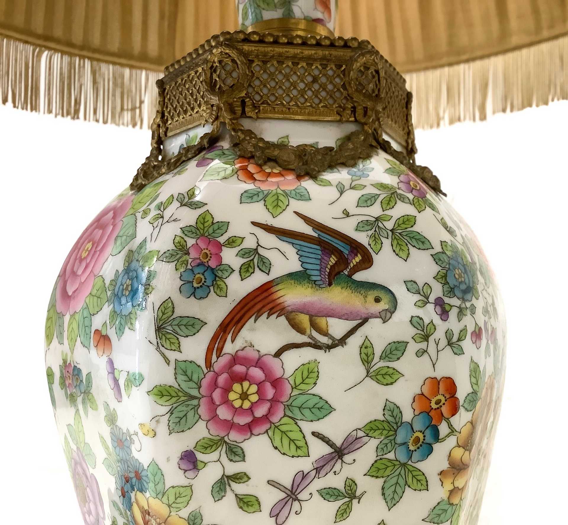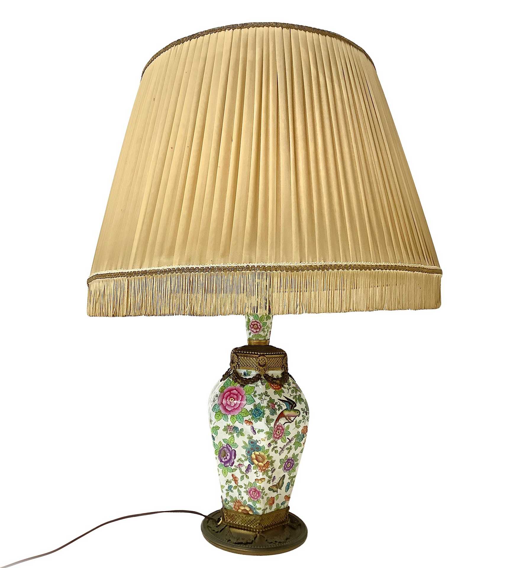 Lume in porcellana da tavola , 20° secolo h cm 60, diametro cm 16 Dipinta con fiori e farfalle con base in ottone doratoDipinta con fiori e farfalle con base in ottone dorato