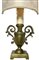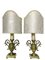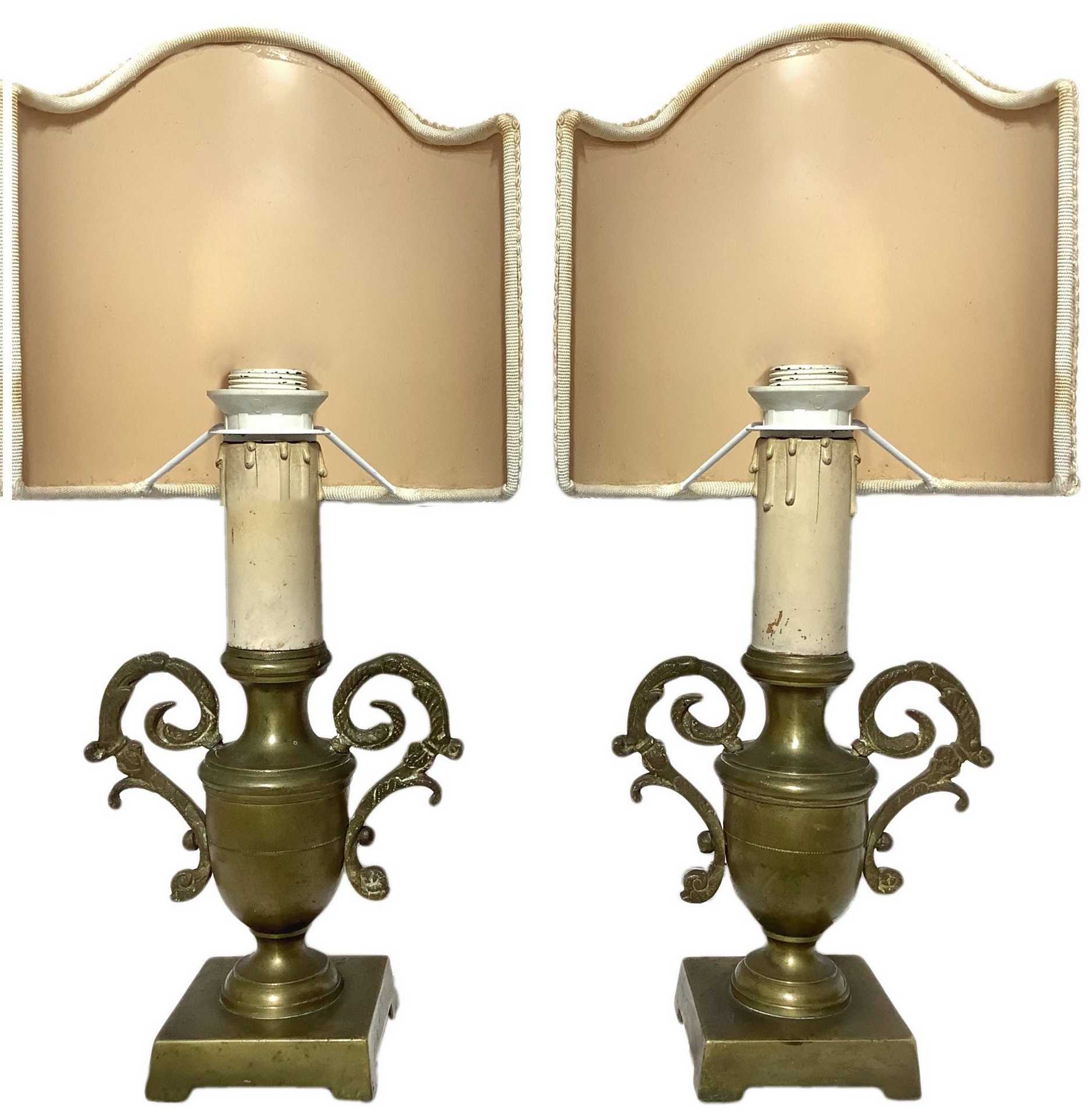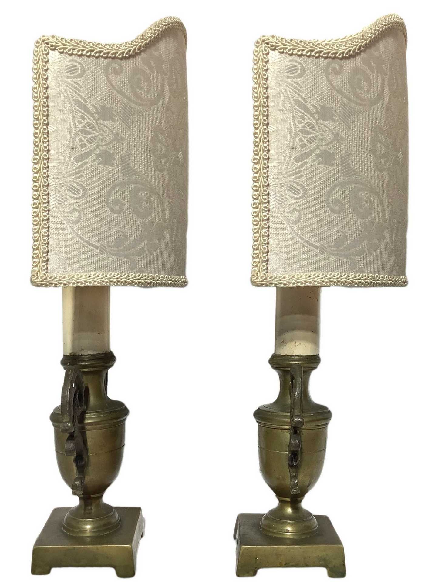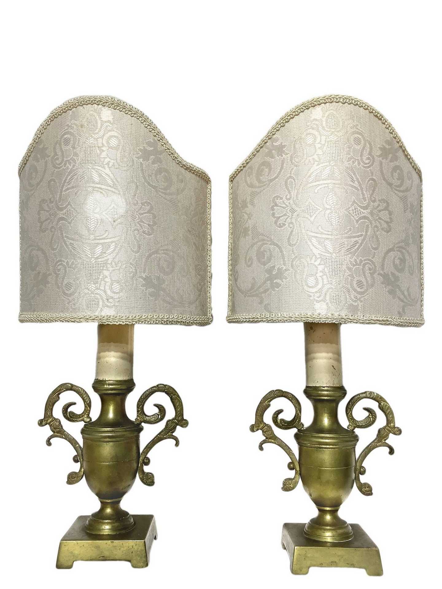Coppia di piccoli lumi in bronzo dorato a forma di anfore, con ventole, 19° secolo