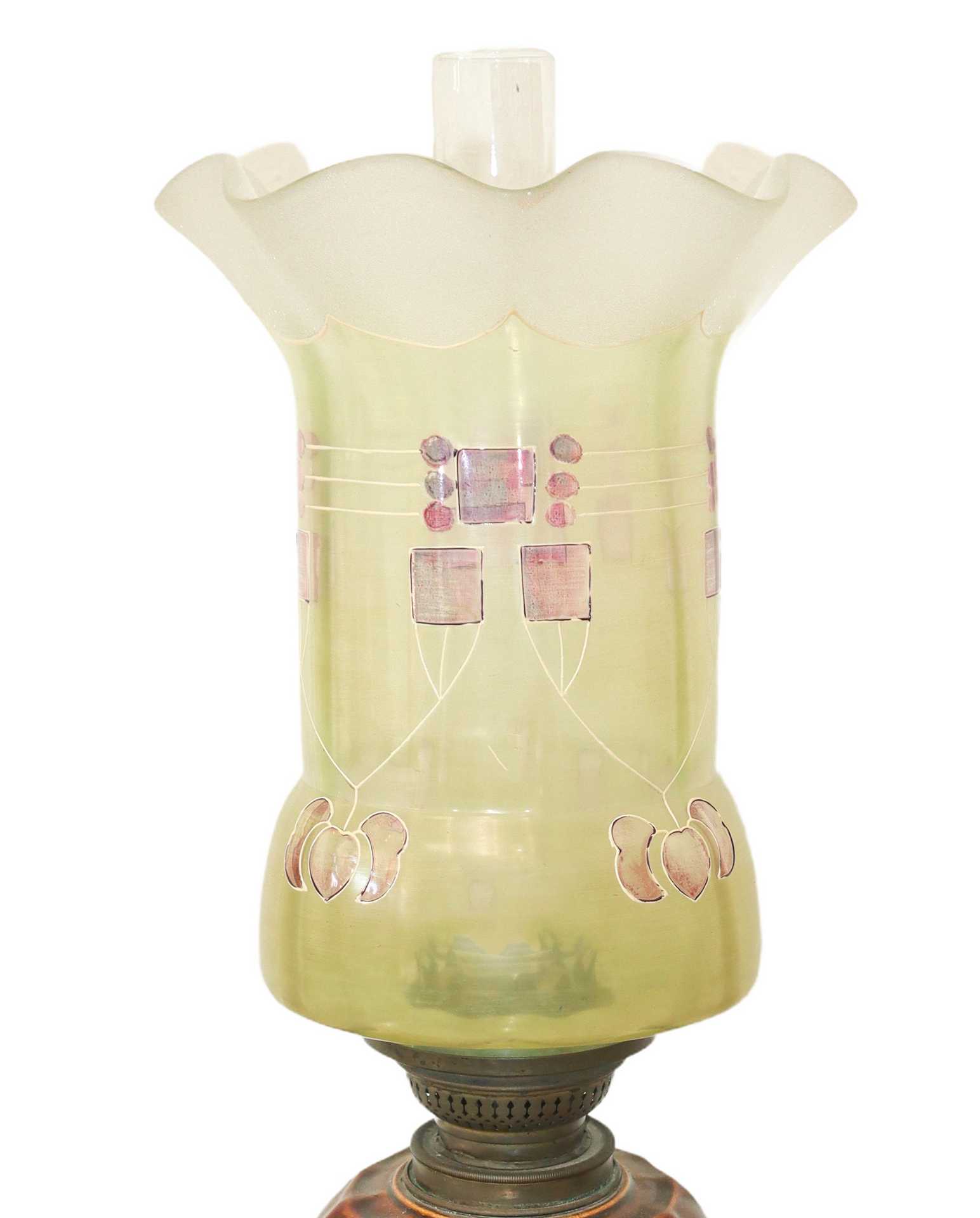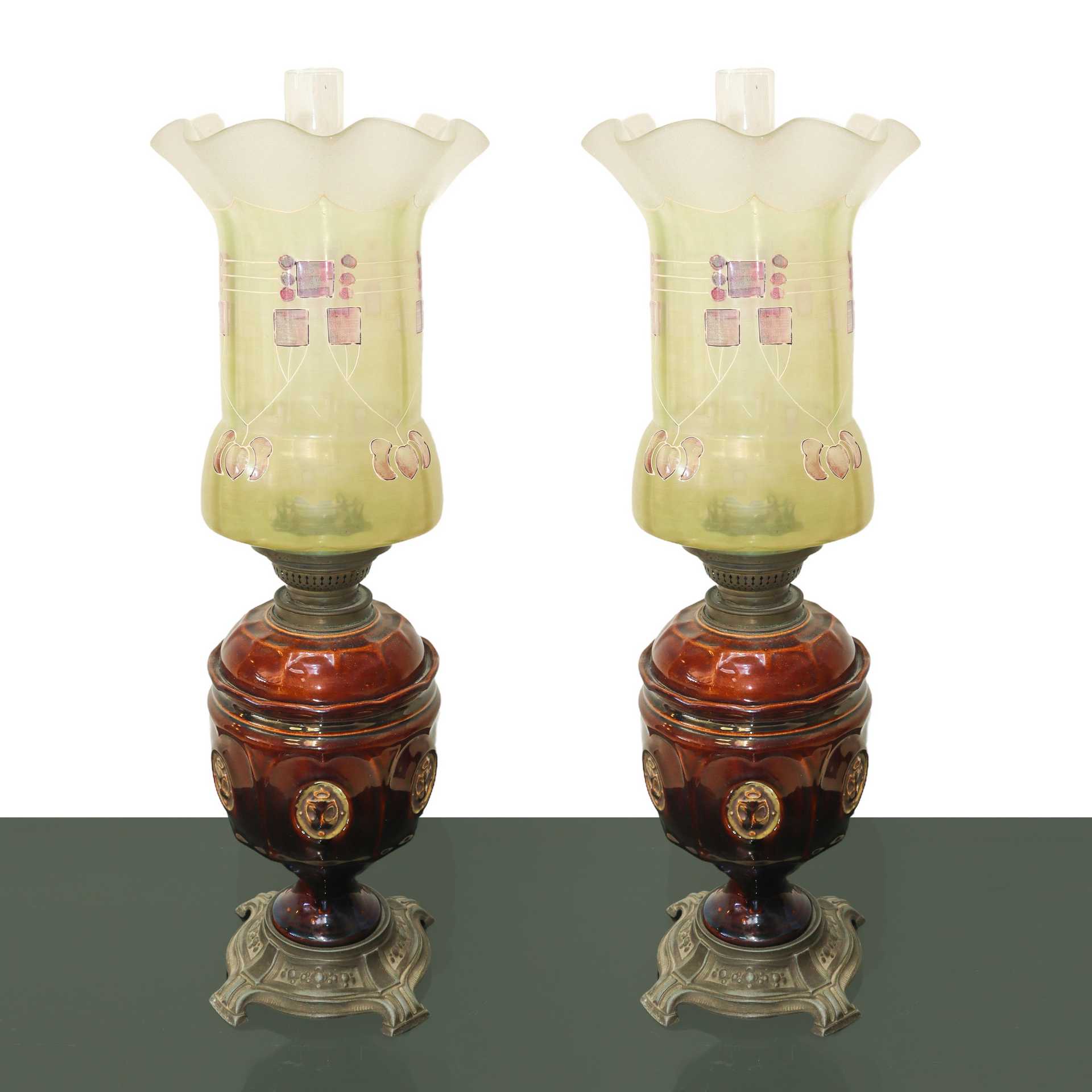 Coppia di lumi a petrolio, con decorazioni periodo liberty