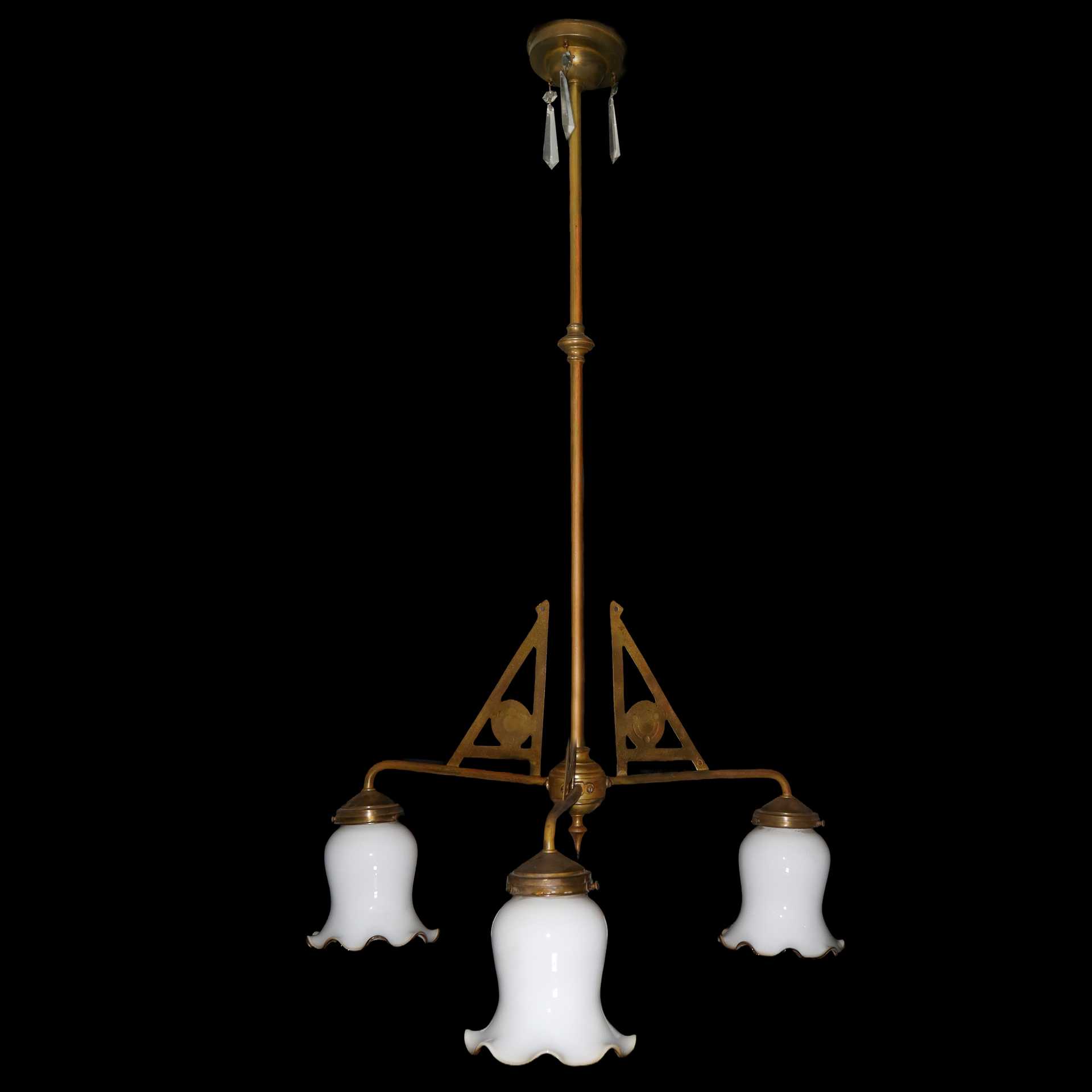 Lampadario 12 Decò a tre luci con vetri in opaline bianco a tulipano, Primi 20° secolo Cm 105x54 Stelo in ottone dorato.Stelo in ottone dorato.