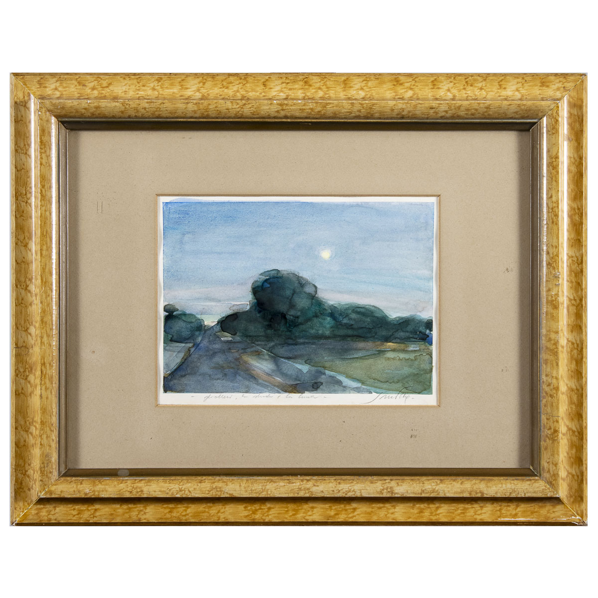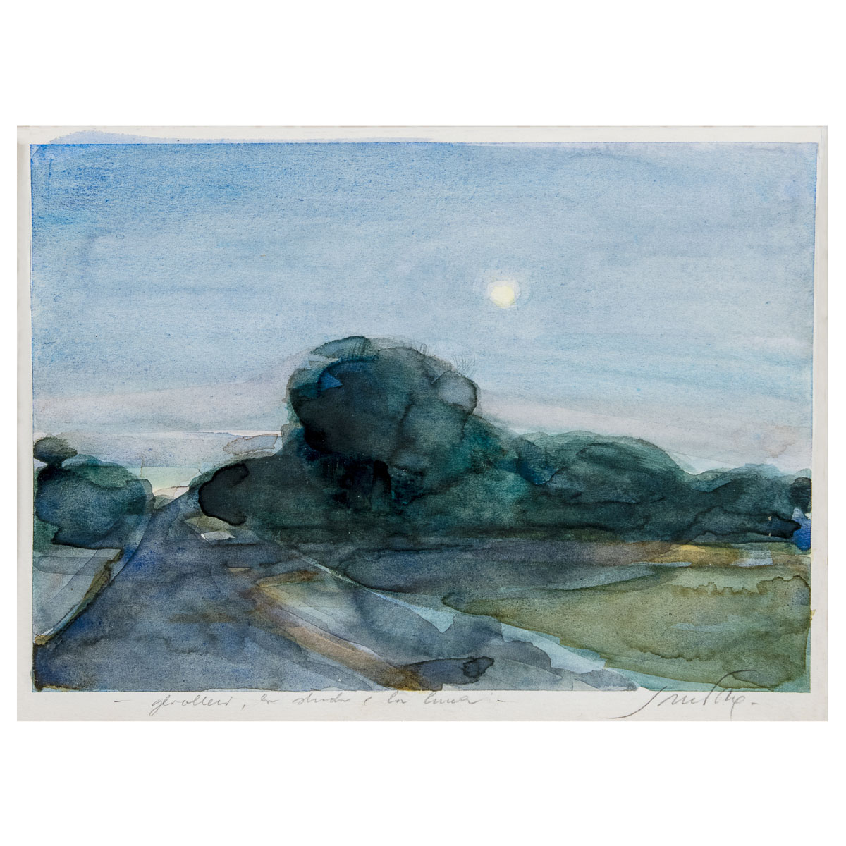 "Gli alberi, la strada e la luna", 1978, acquerello su carta, firmato in basso a destra, entro cornice