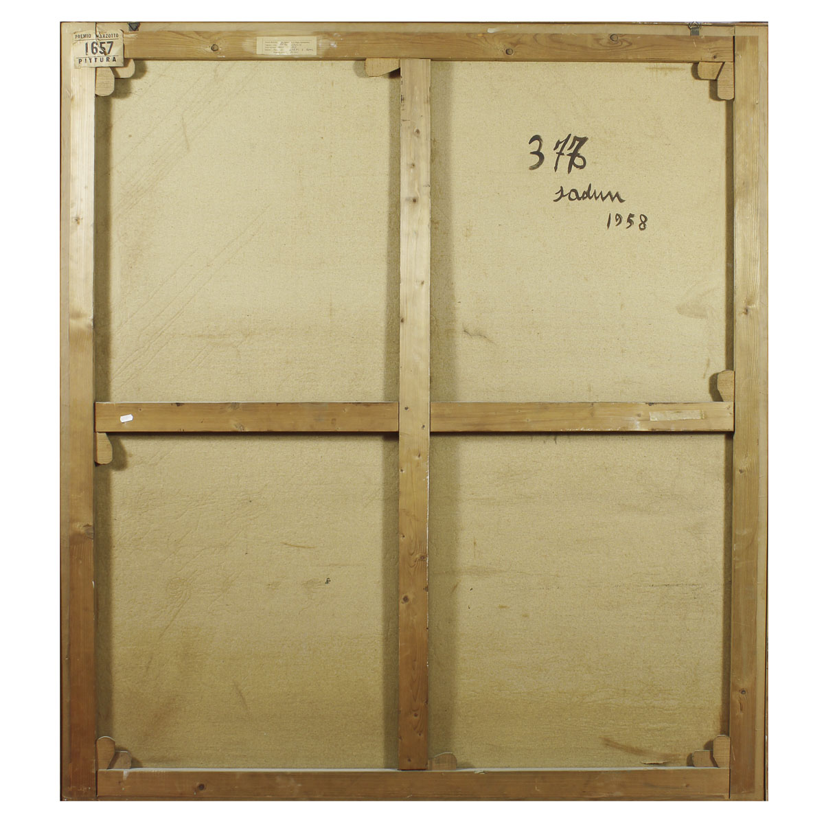 "Spazio - 377", 1958, olio su tela, firmato, datato e titolato sul retro, difetti