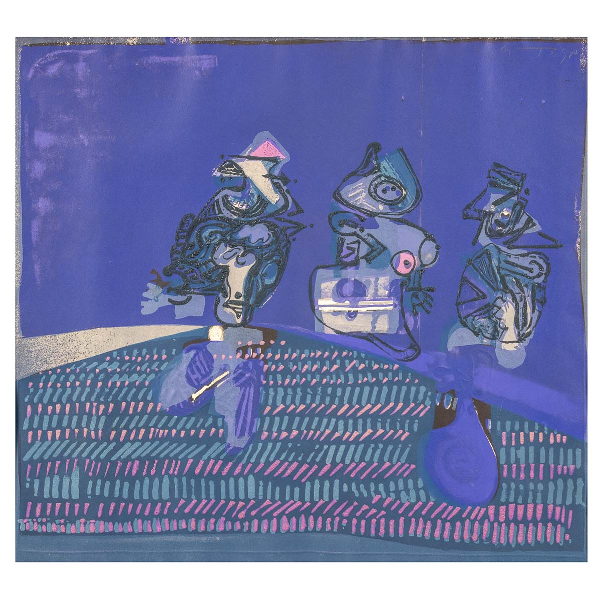 "Segadores", 1970 circa, calcografia a colori, firmata in basso a destra, entro cornice