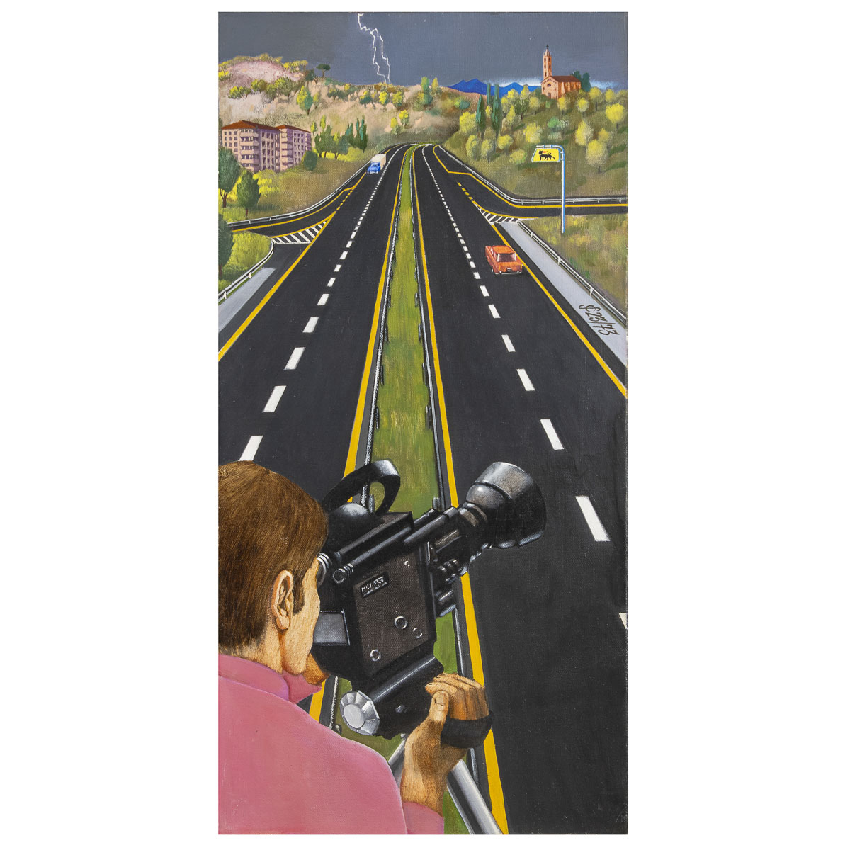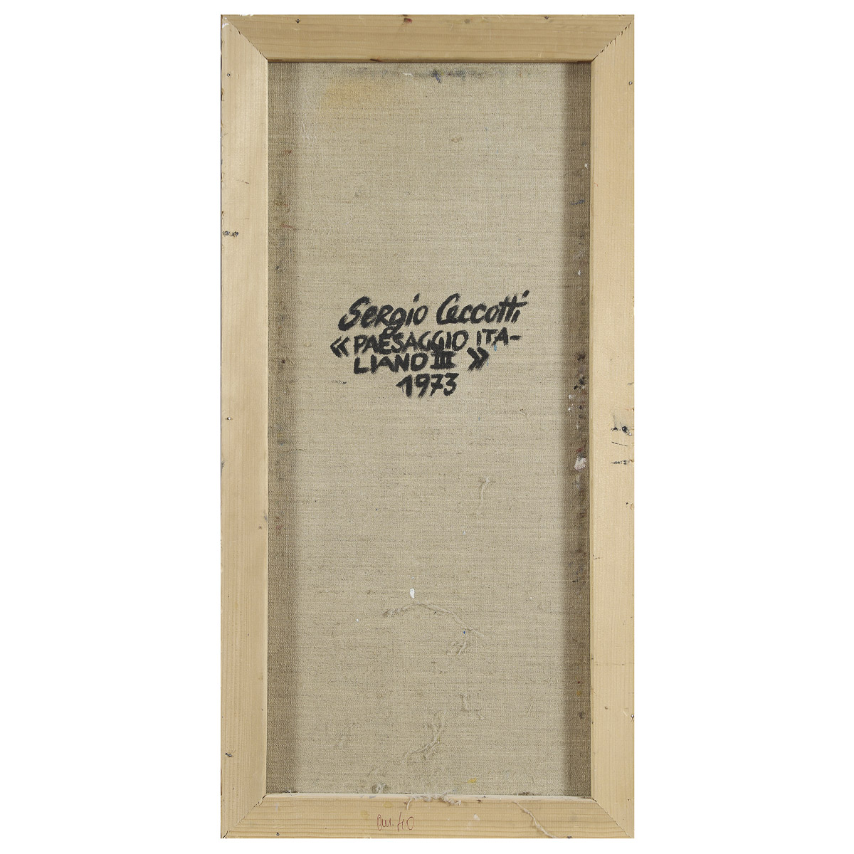 "Paesaggio italiano III", 1973, olio su tela, siglato e datato a destra, firmato, datato e titolato sul retro, entro cornice