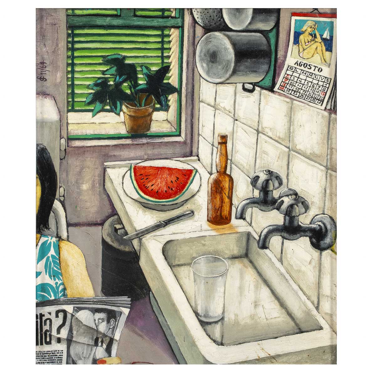 "La casalinga", 1964, olio su tela, siglato e datato in alto a sinistra, firmato, datato e titolato sul retro, entro cornice