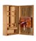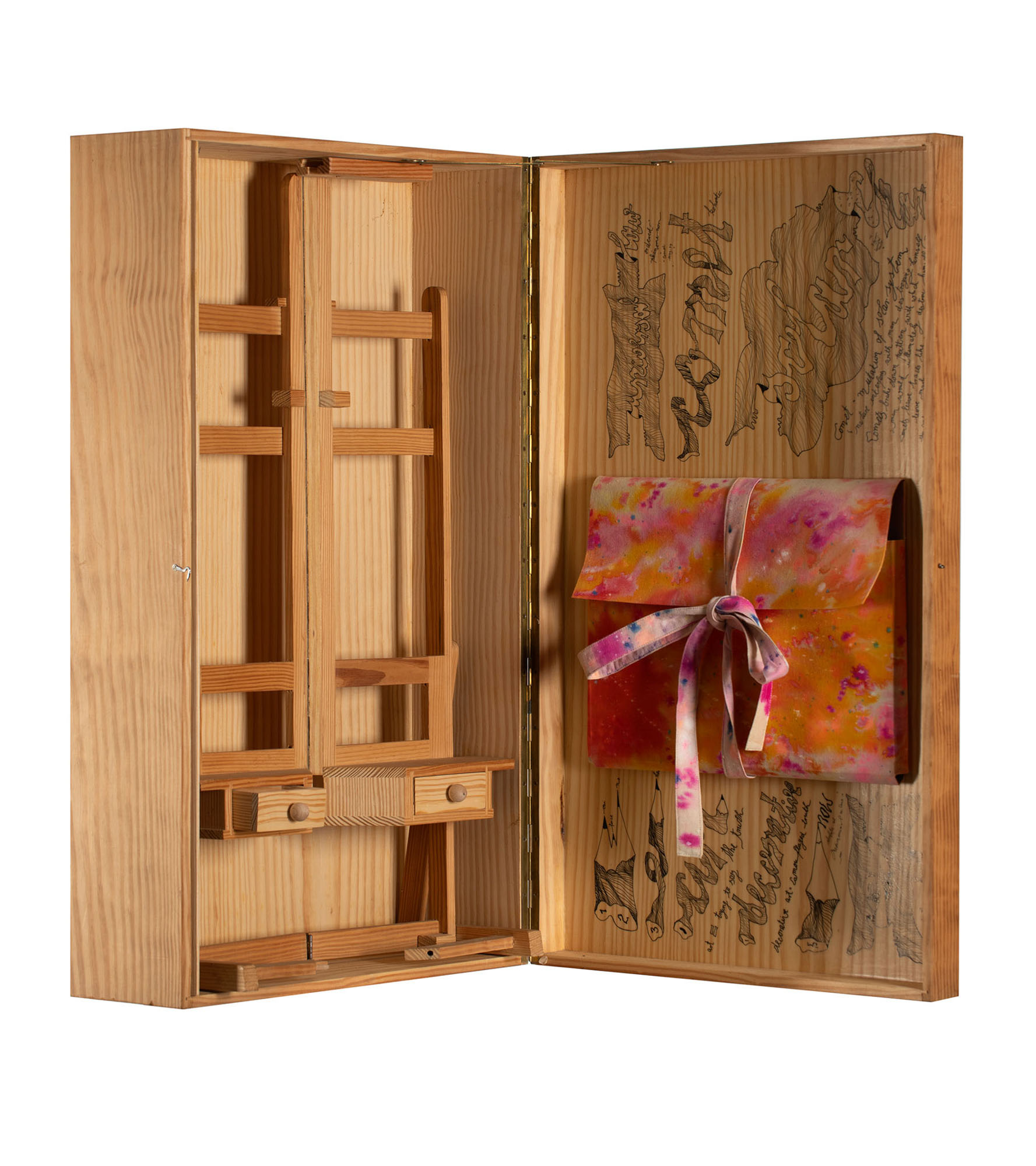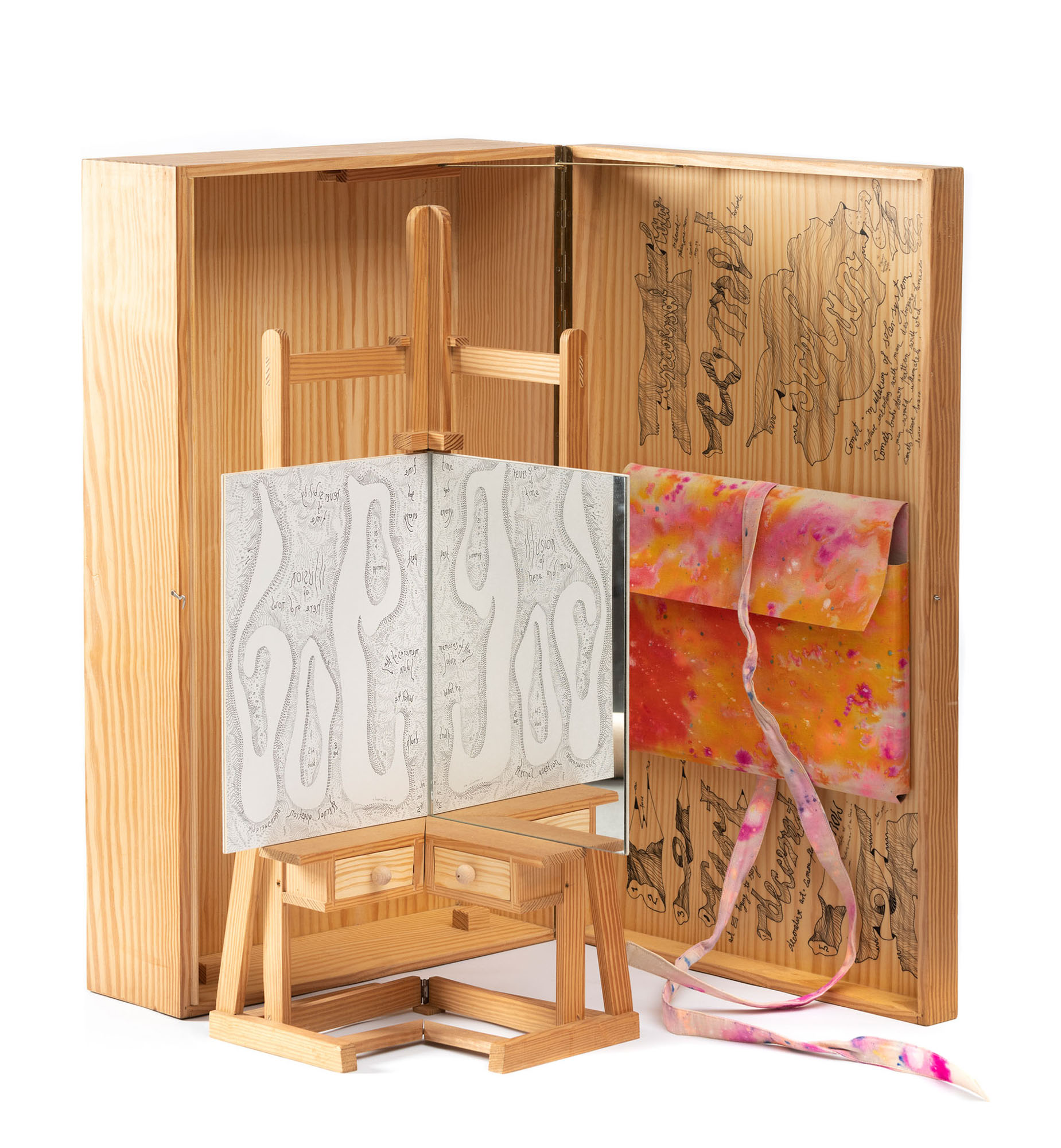 Cavalletto in legno, inchiostro, specchio, borsa in stoffa dipinta e cassa in legno, chiuso cm. 87,5 x 53,5 x 21,5 - aperto cm. 87,5 x 92 x 52