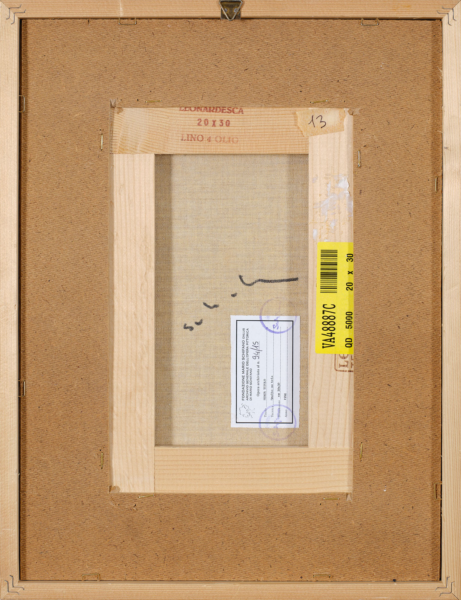 Etichetta e timbro Fondazione Mario Schifano Onlus n. 94/15 sul retro