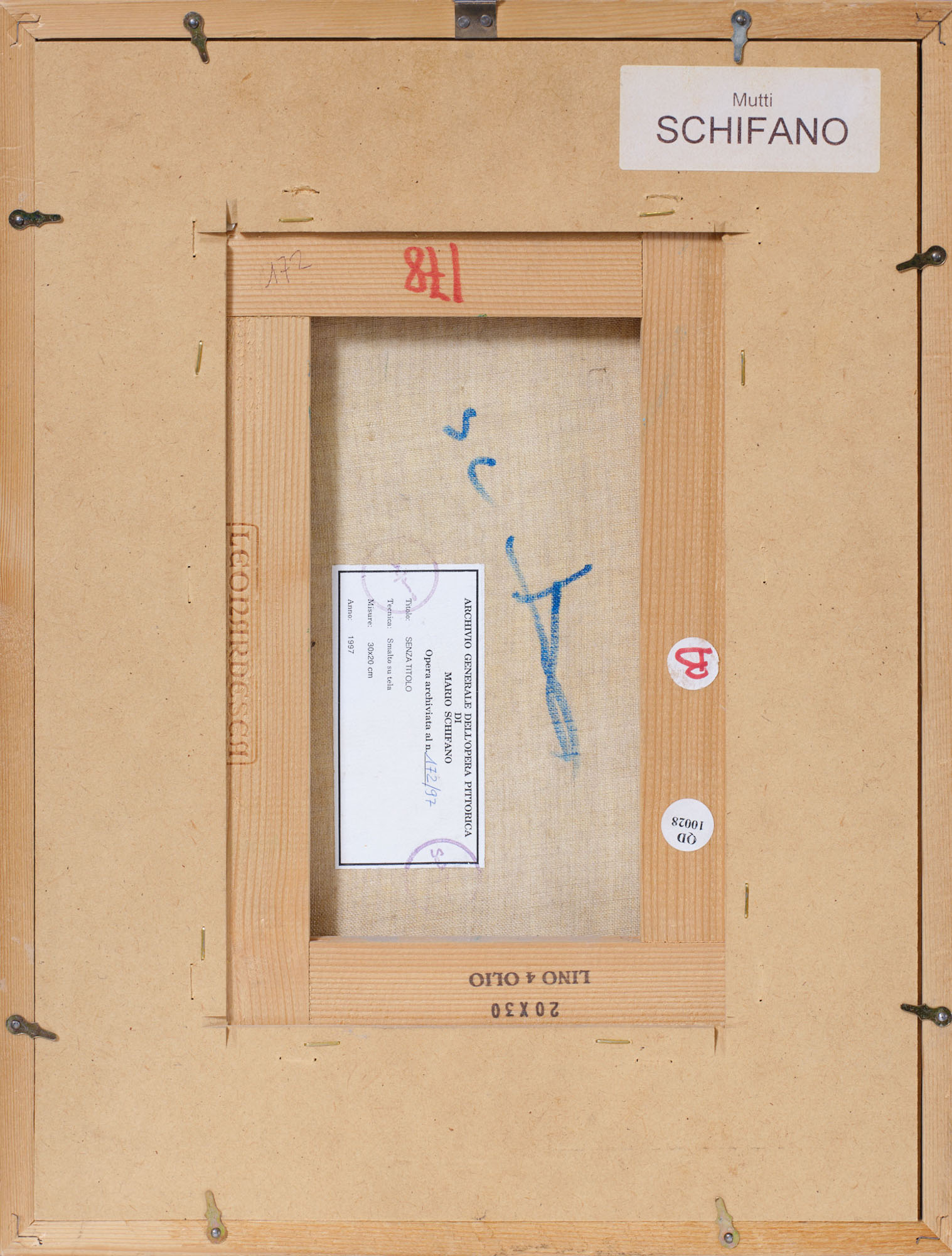 Etichetta e timbro Archivio Generale dell'Opera Pittorica di Mario Schifano n. 172/97 sul retro