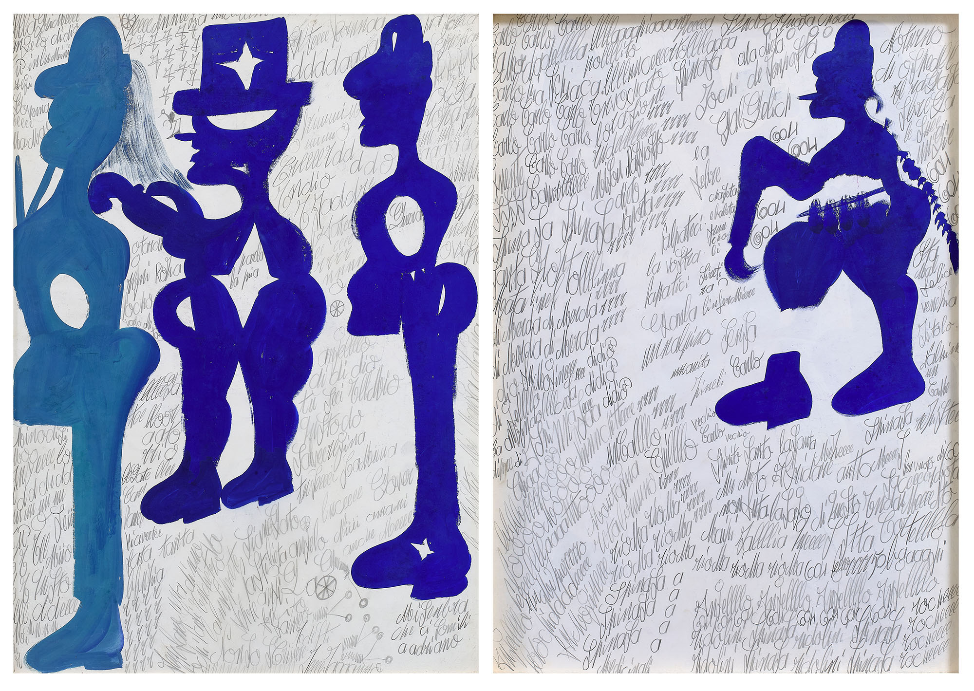 CARLO ZINELLI Figura stellata con cilindro blu e due figure zoppe - Alpino blu con lunga treccia, 1967