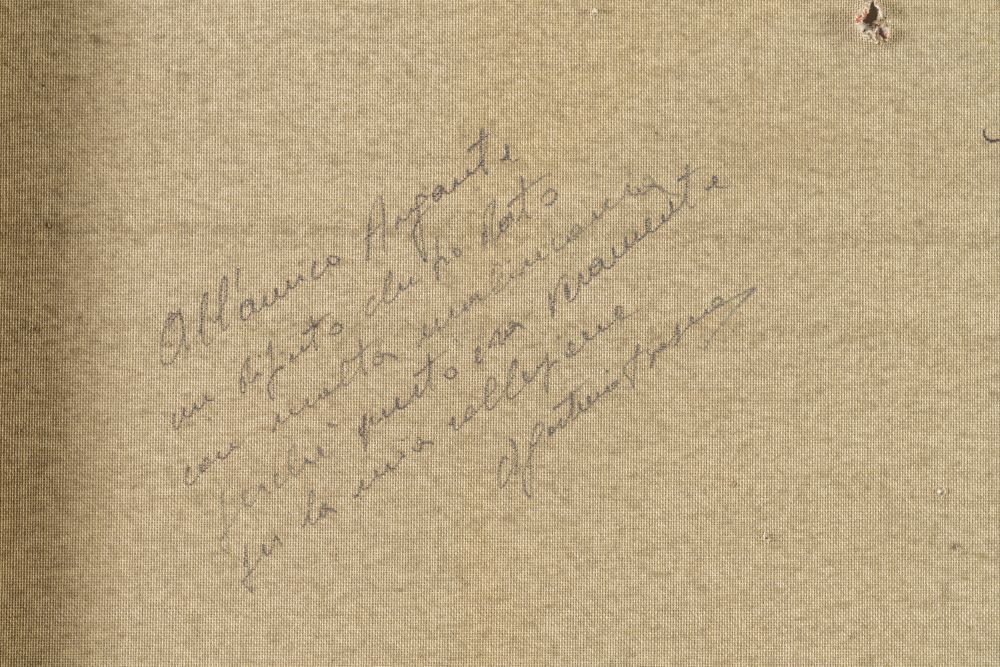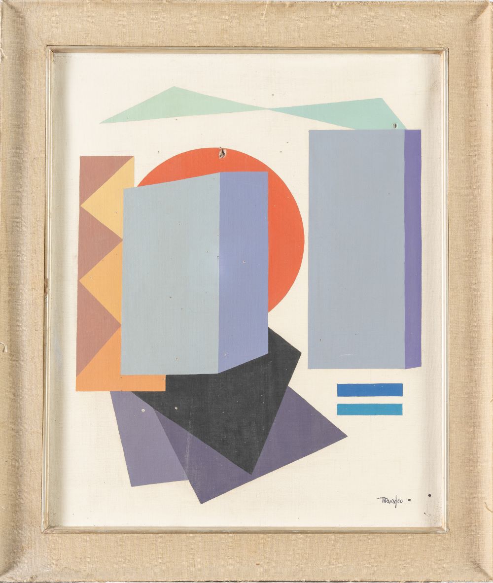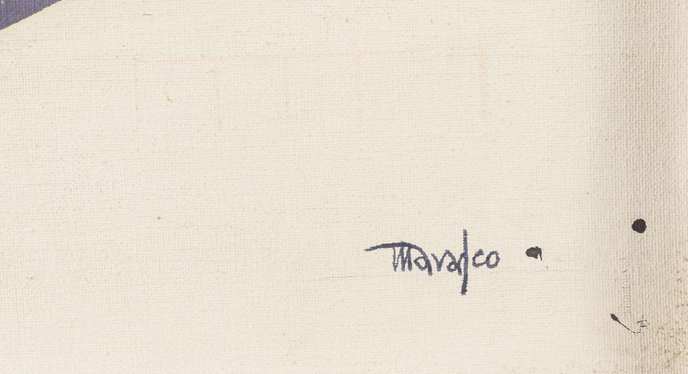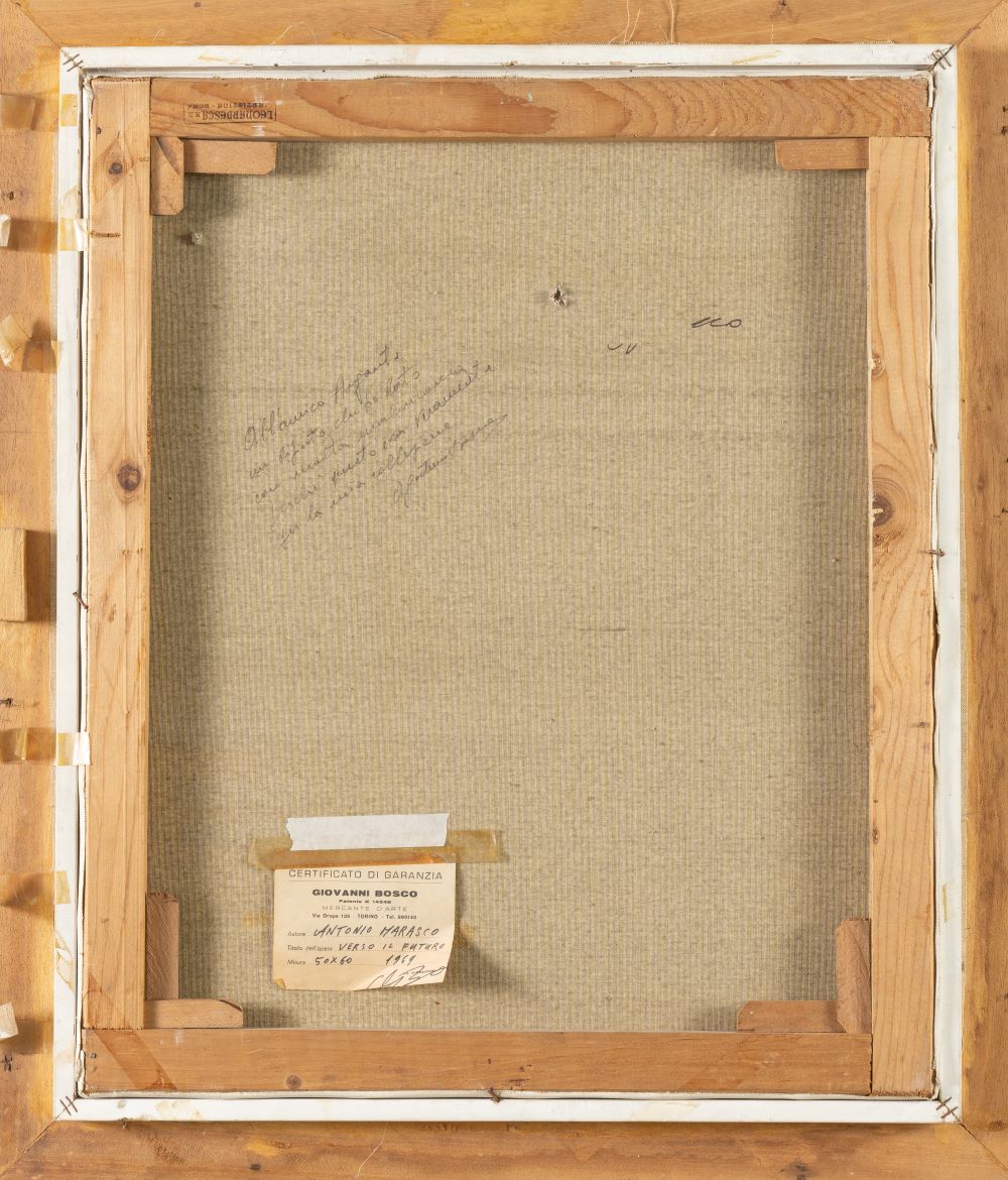 Antonio Marasco (Nicastro 1896 - Firenze 1975), Verso il futuro, 1969. Cm. 60x50. Olio su tela. Opera firmata in basso a destra Marasco. Al retro reca etichetta Giovanni Bosco, Torino. Al retro reca dedica. Difetti,
