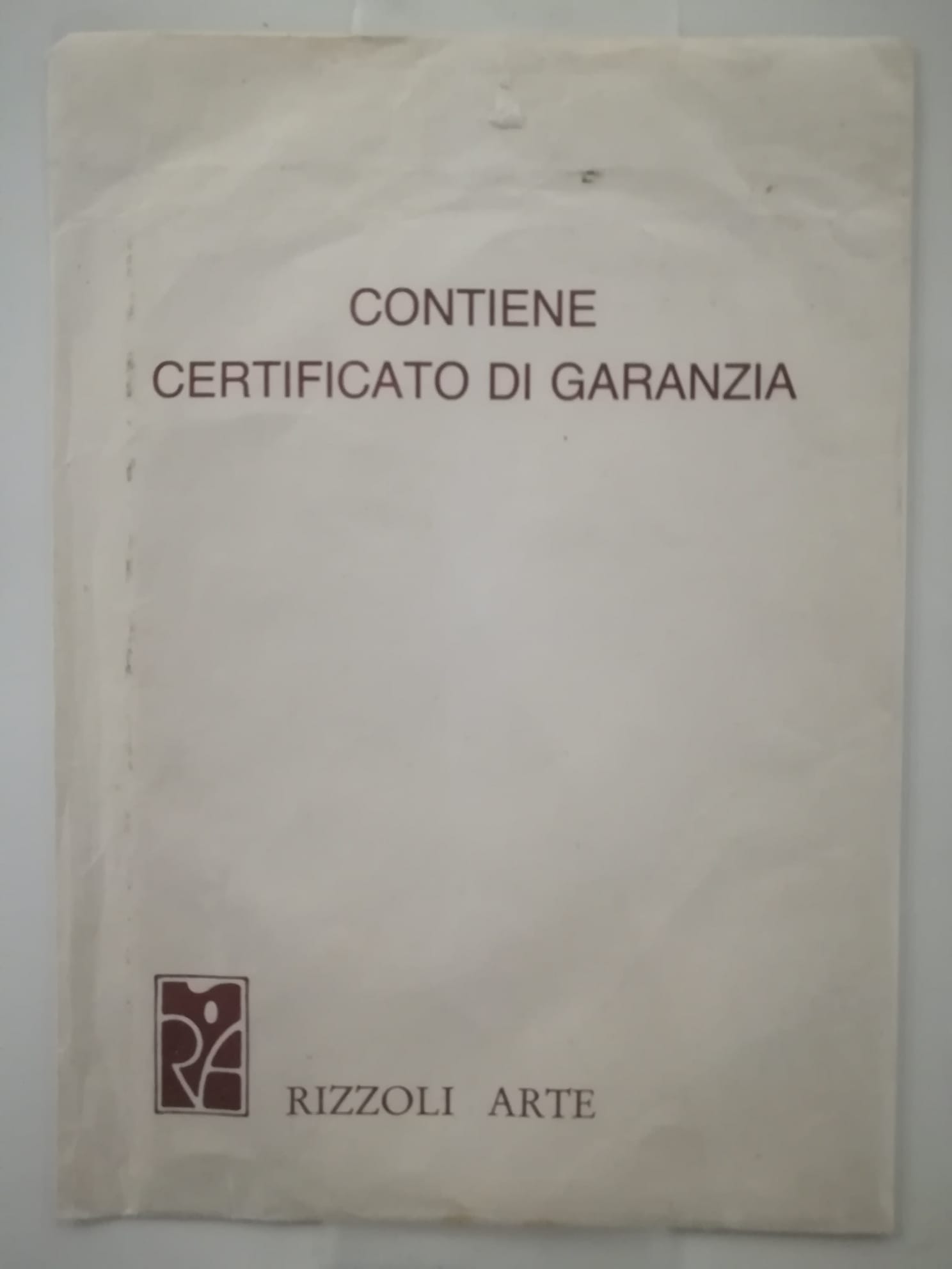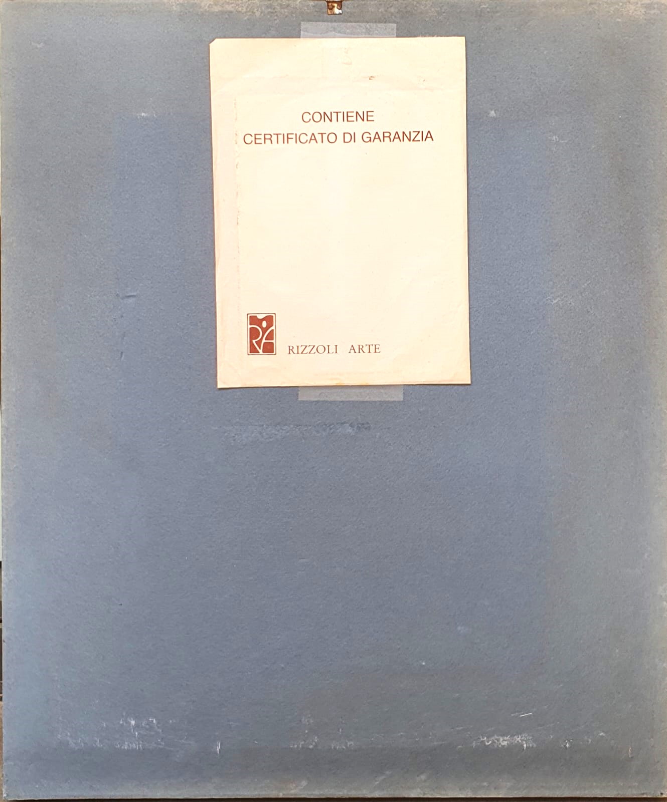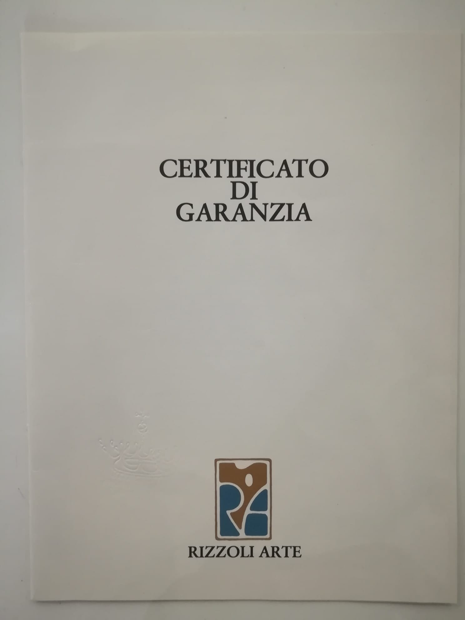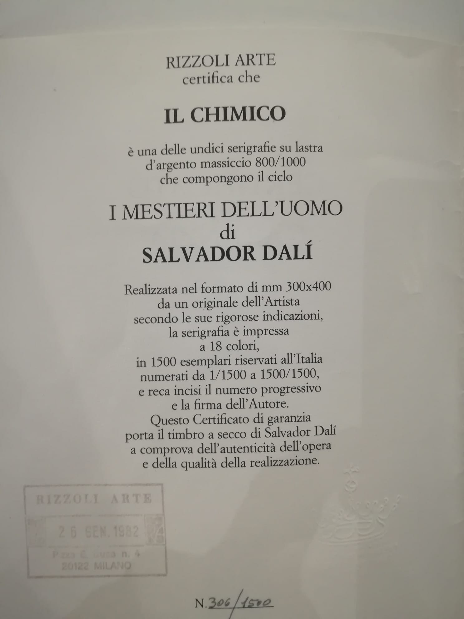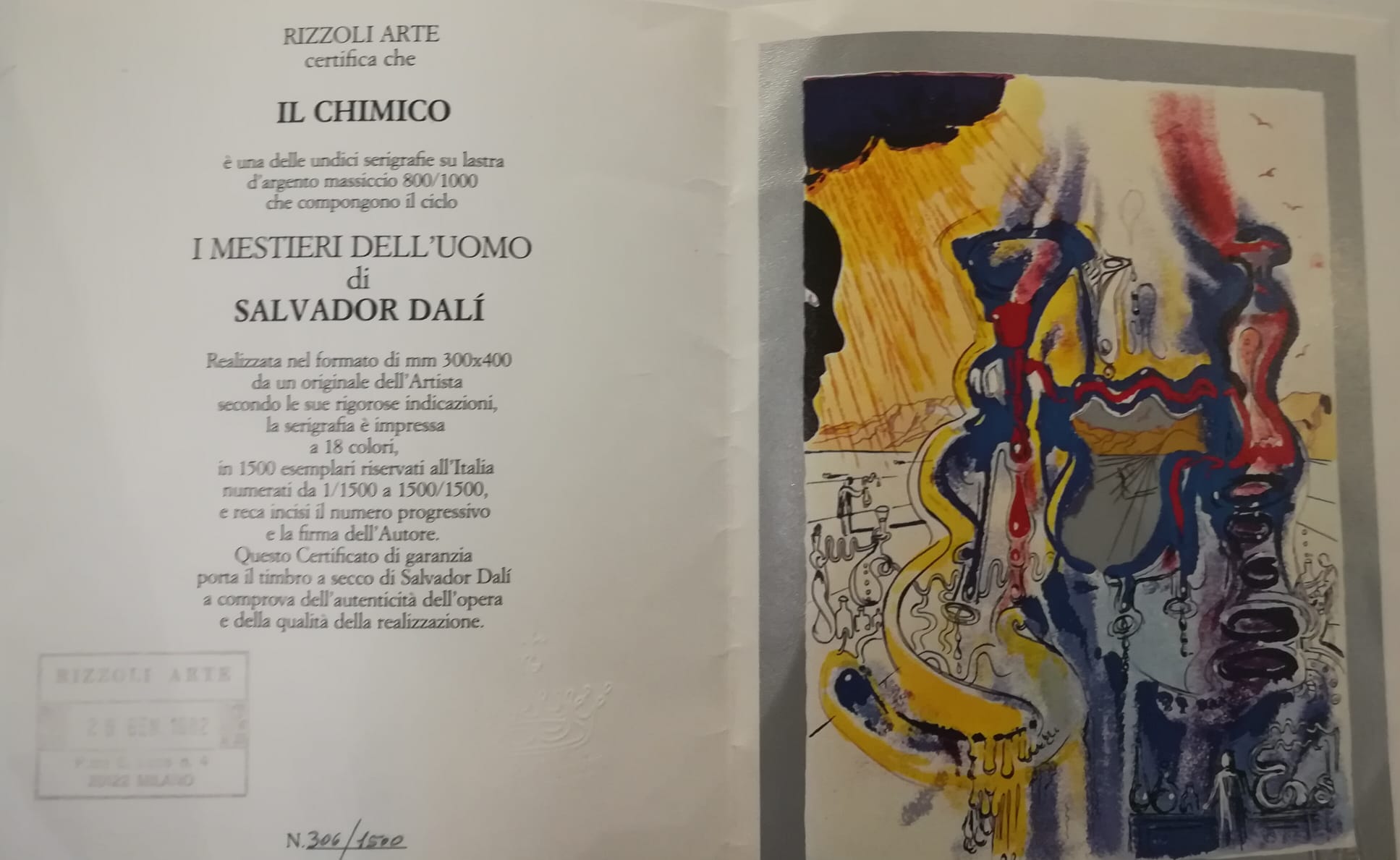 'RIZZOLI ARTE certifica che IL CHIMICO è una delle undici serigrafie su lastra d'argento massiccio 800/1000 che compongono il ciclo I MESTIERI DELL'UOMO di SALVADOR DALÍ Realizzata nel formato di mm 300x400 da un originale dell'Artista secondo le sue rigorose indicazioni, la serigrafia e impressa a 18 colori, in 1500 esemplari riservati all'Italia numerati da 1/1500 a 1500/1500, e reca incisi il numero progressivo e la firma dell'Autore. Questo Certificato di garanzia porta il timbro a secco di Salvador Dalí a comprova dell'autenticità dell'opera e della qualità della realizzazione.'
