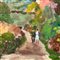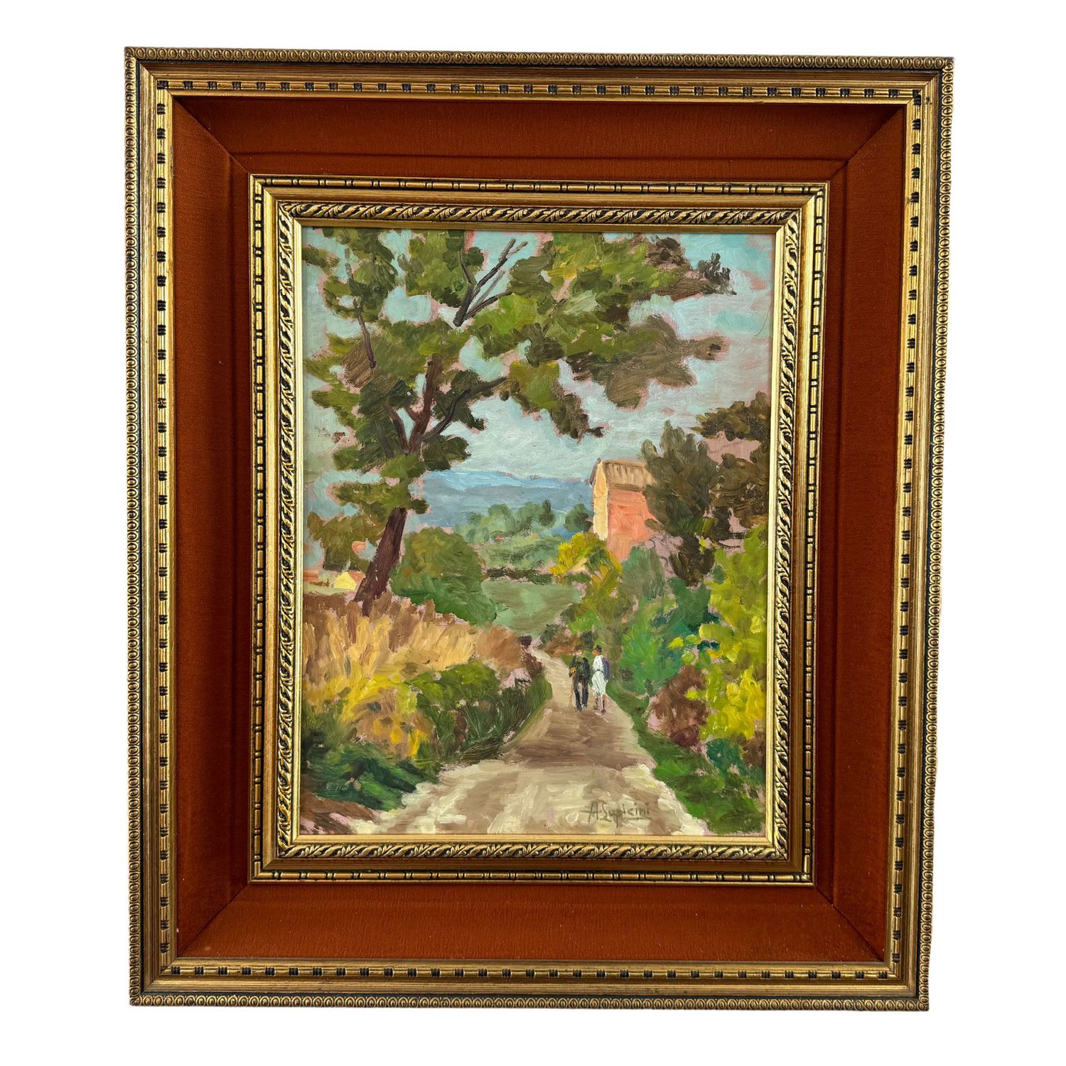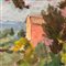 Dipinto olio su pannello, periodo XX secolo scuola Italiana, raffigurante Paesaggio di campagna con personaggi (luogo imprecisato)