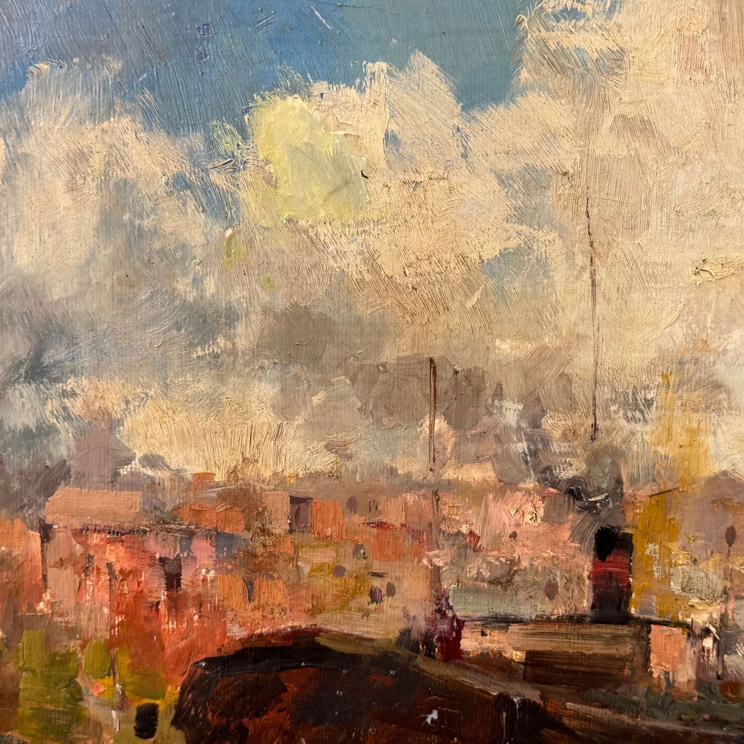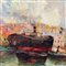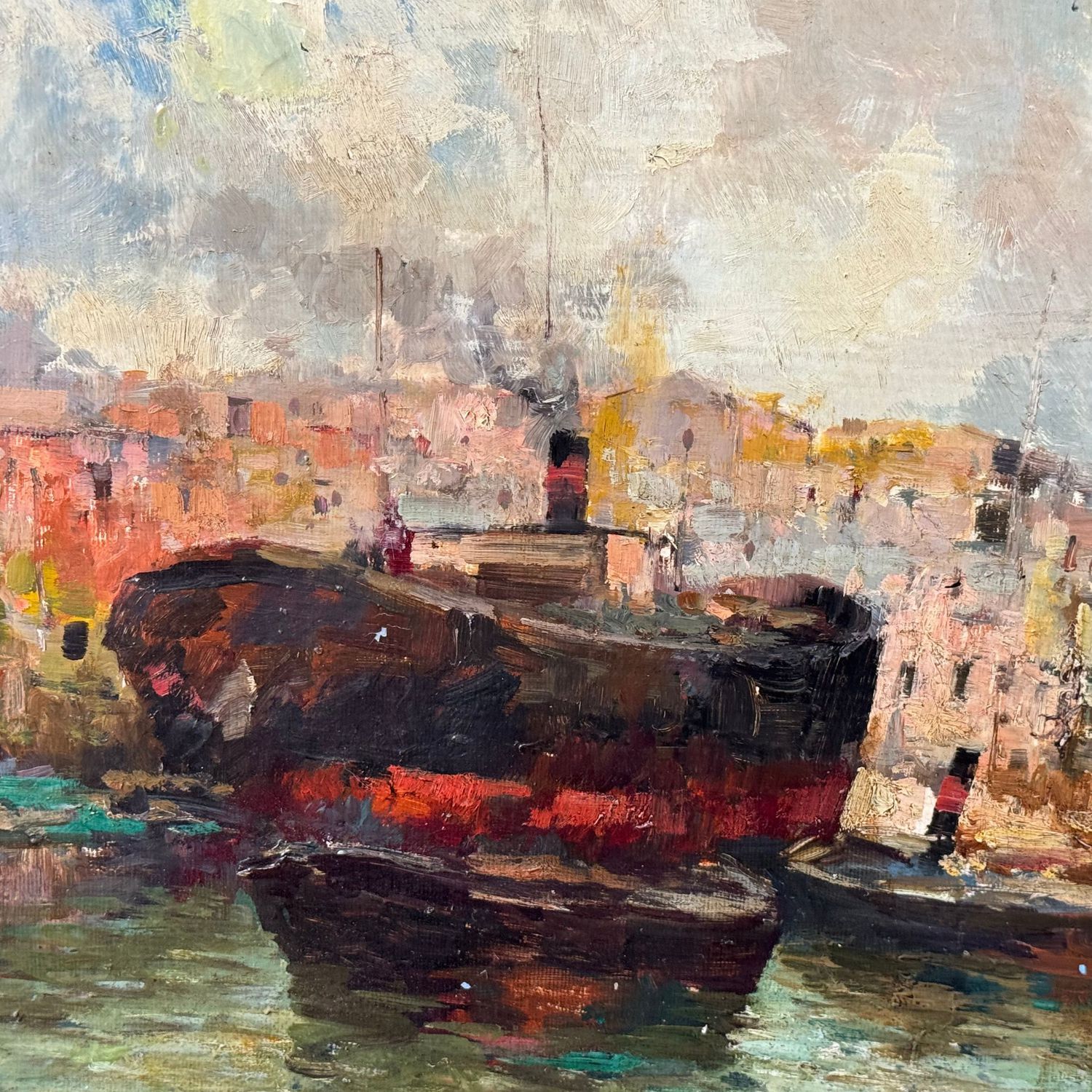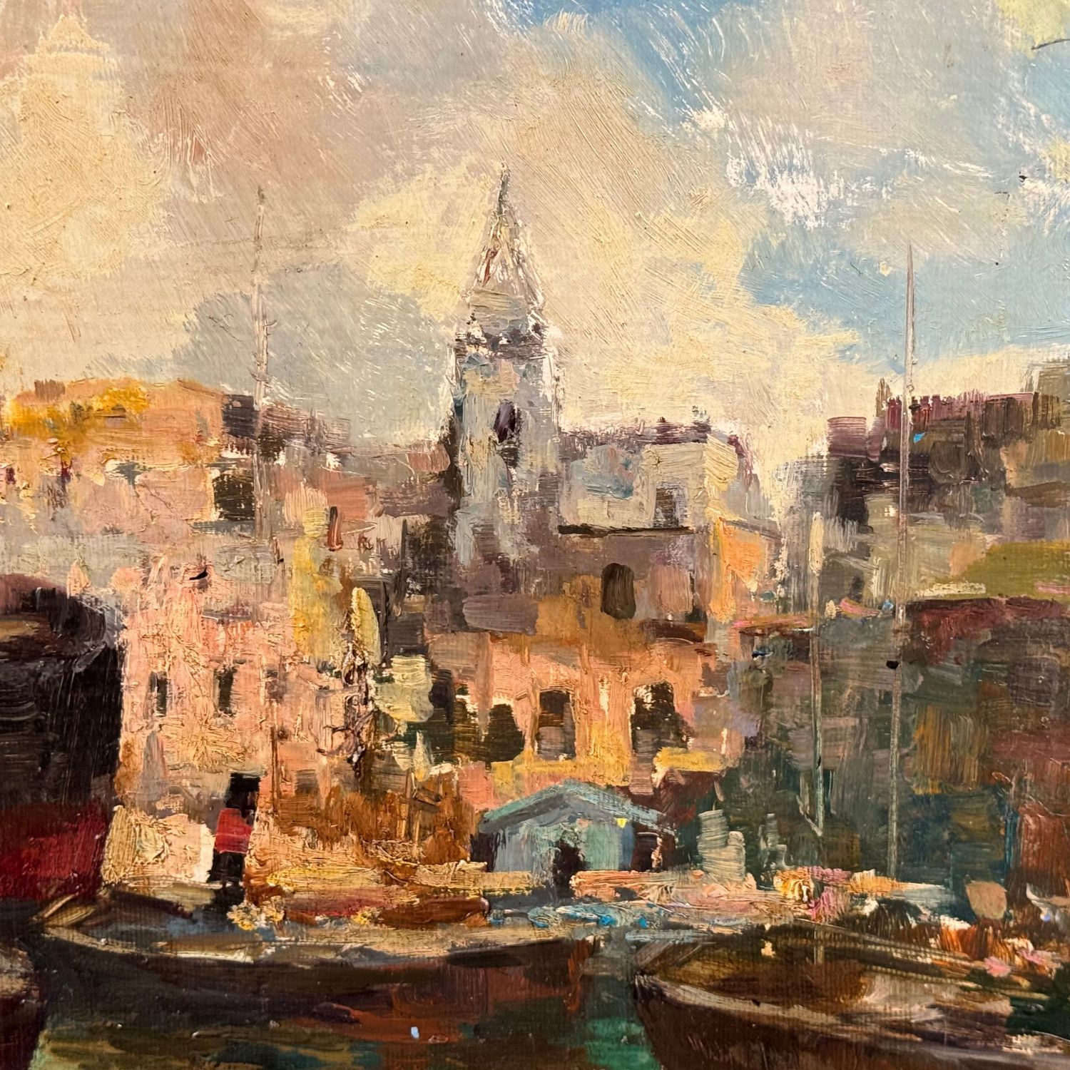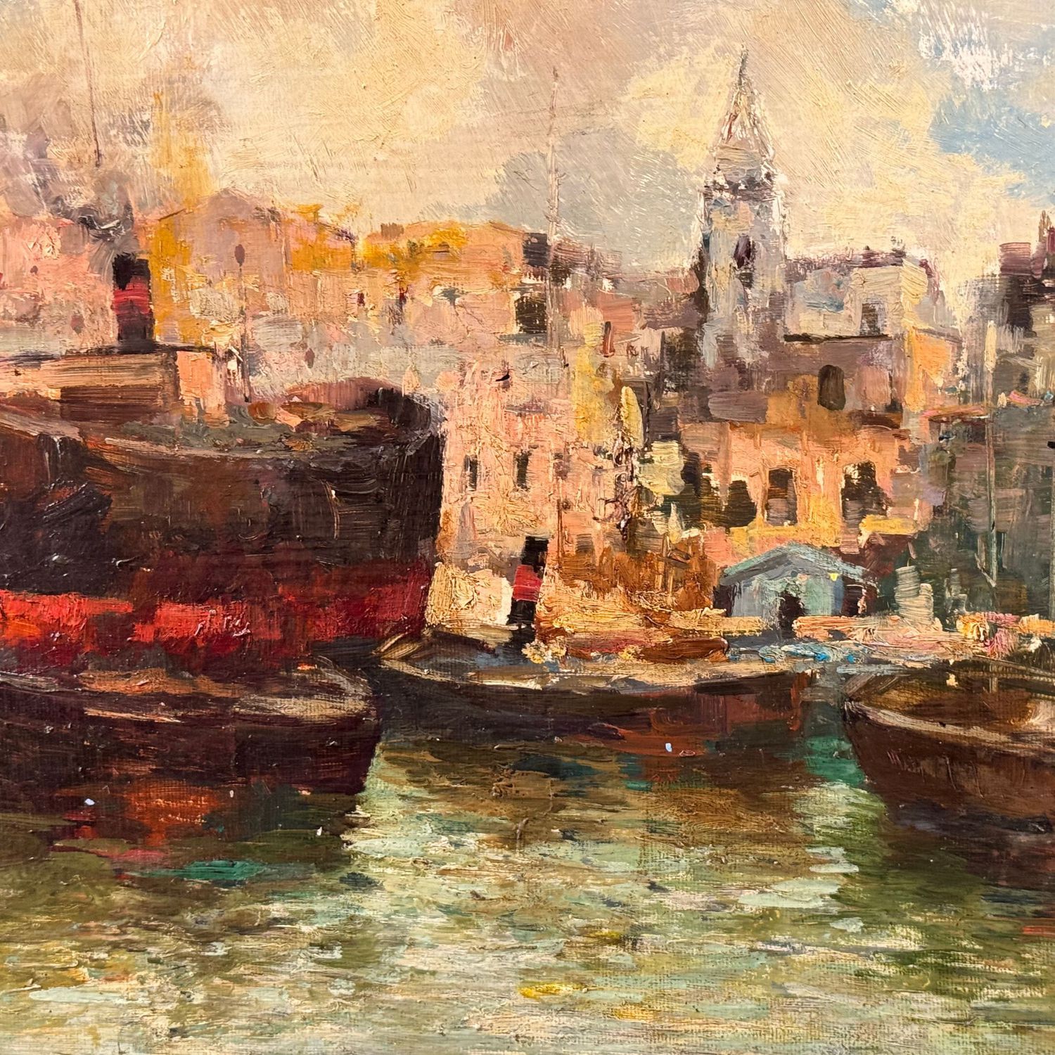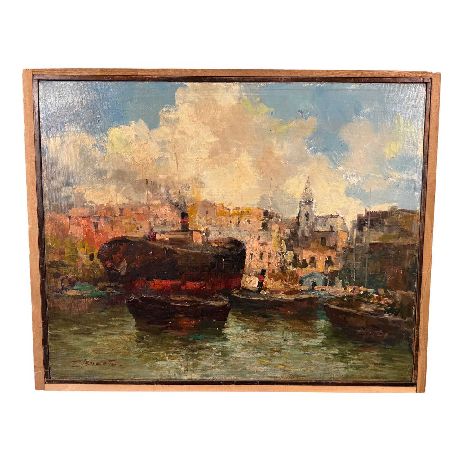 Dipinto olio su tela, periodo XX secolo scuola Italiana, raffigurante Porto mediterraneo.