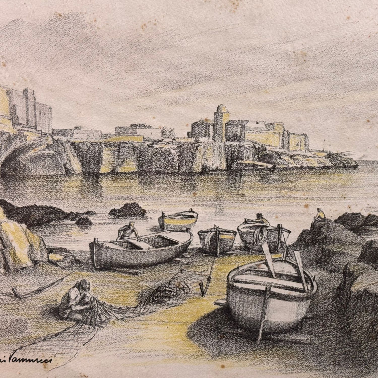 Dipinto disegno su carta, periodo XX secolo scuola Italiana, raffigurante Marina con barche a secco.