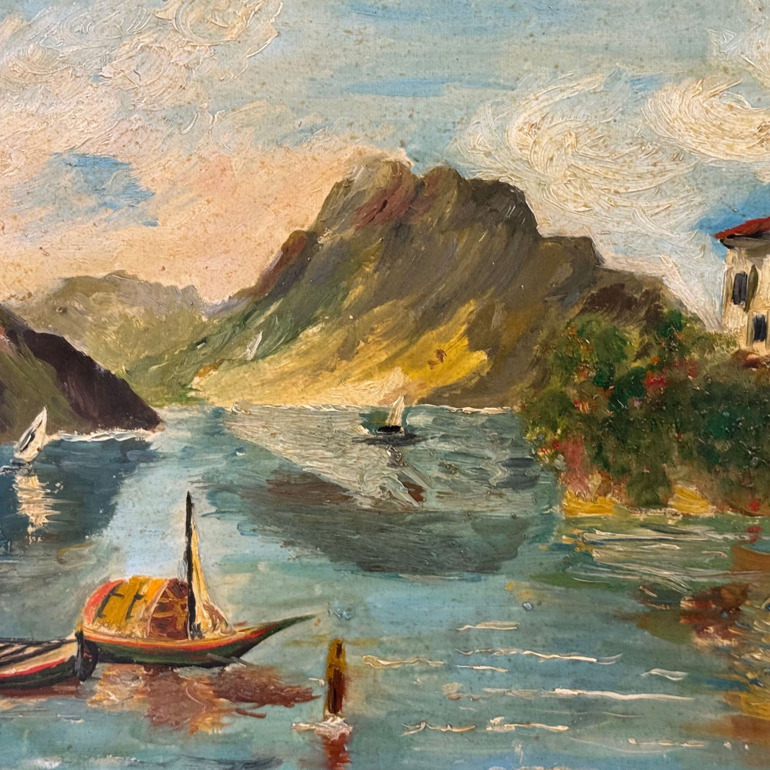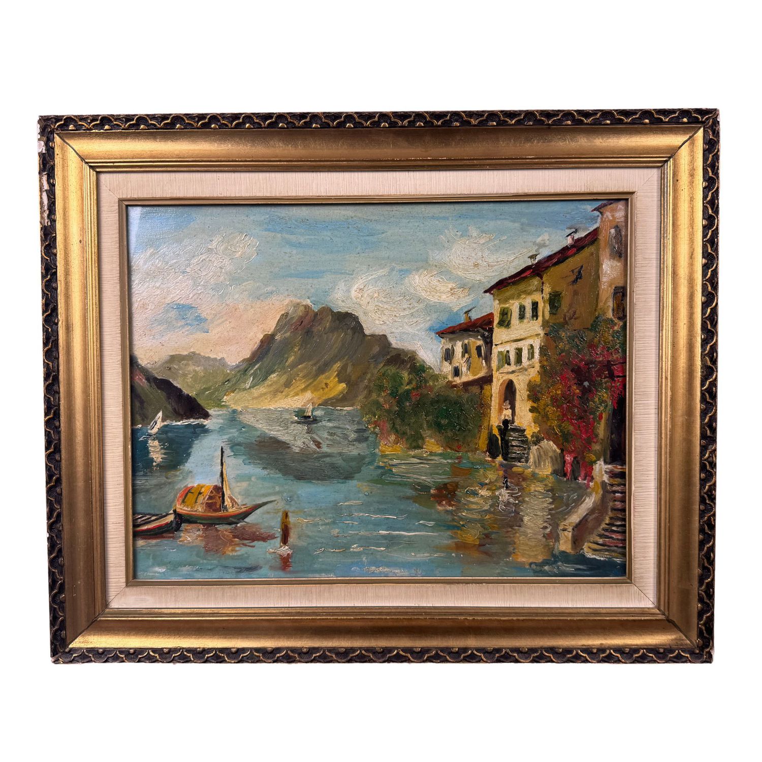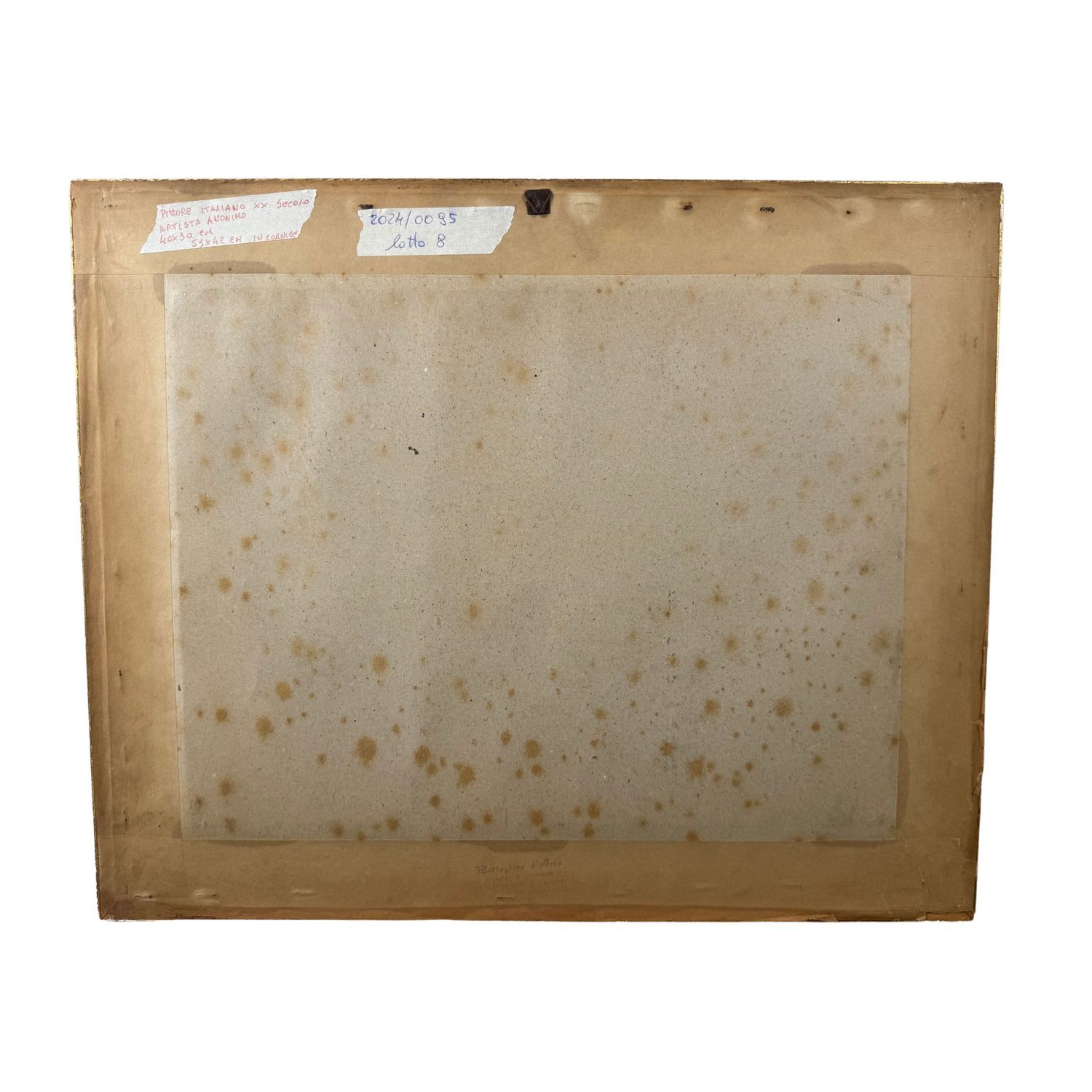 Dipinto olio su tavola, periodo XX secolo scuola Italiana, raffigurante Paesaggio fluviale (Luogo imprecisato).