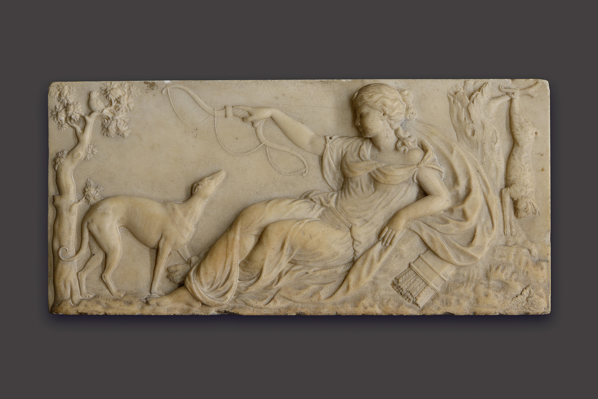 La dea della caccia è stesa in posa lasciva sulla nuda terra con un peplo leggero ne ricopre le membra lasciando scoperte le spalle e il bel profilo incorniciato da ciocche elegantemente acconciate sulla nuca. Un braccio sollevato a mostrare l'arco mentre la faretra con le frecce poggia a terra. Alle sue spalle una lepre frutto della caccia mentre di fronte a lei un levriero dalle fattezze nervose le si avvicina. All'estrema sinistra un albero frondoso.