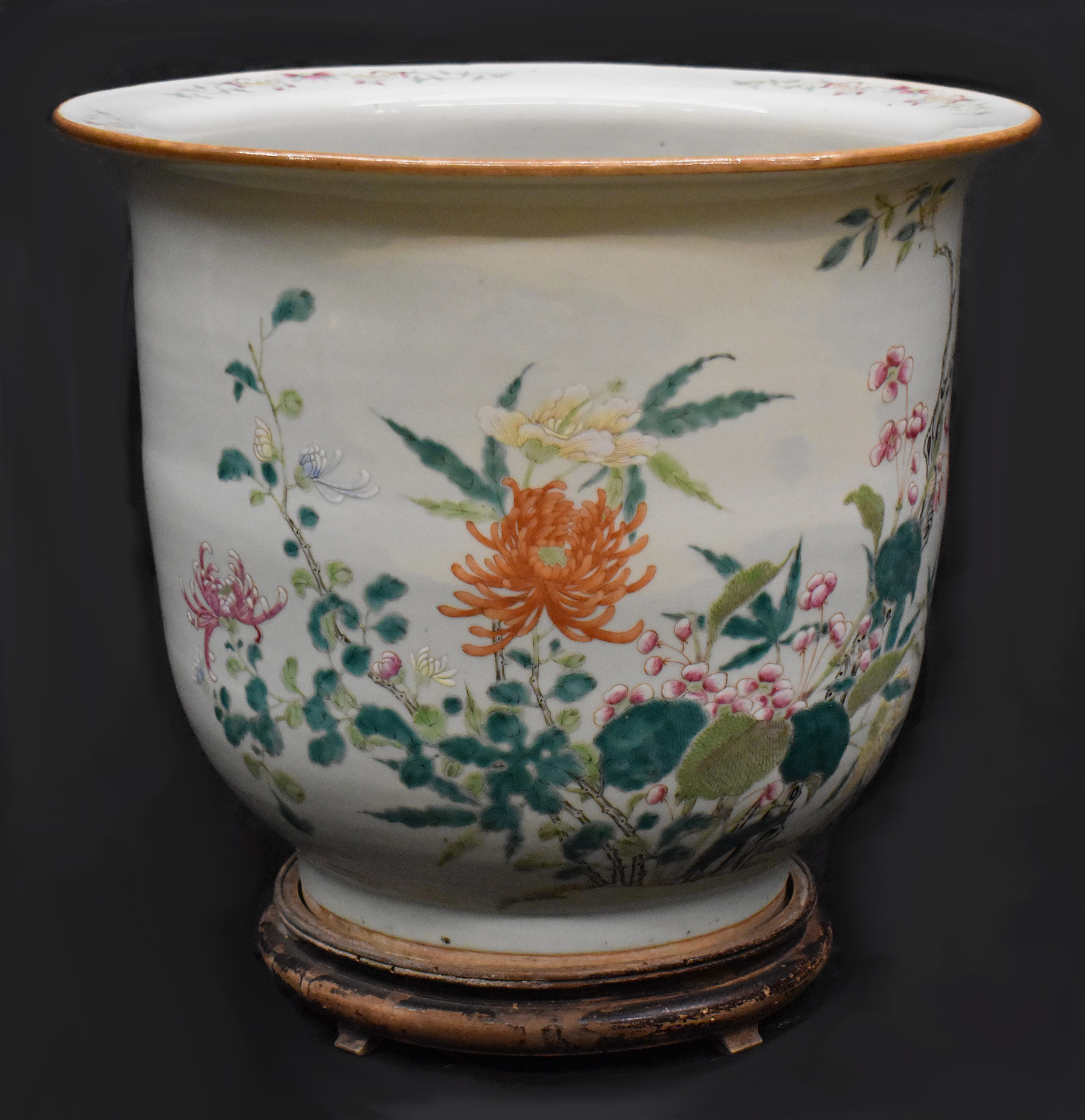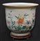 Cina cachepot in porcellana bianca dipinta con motivi floreali e vegetali.